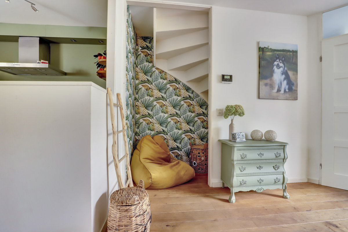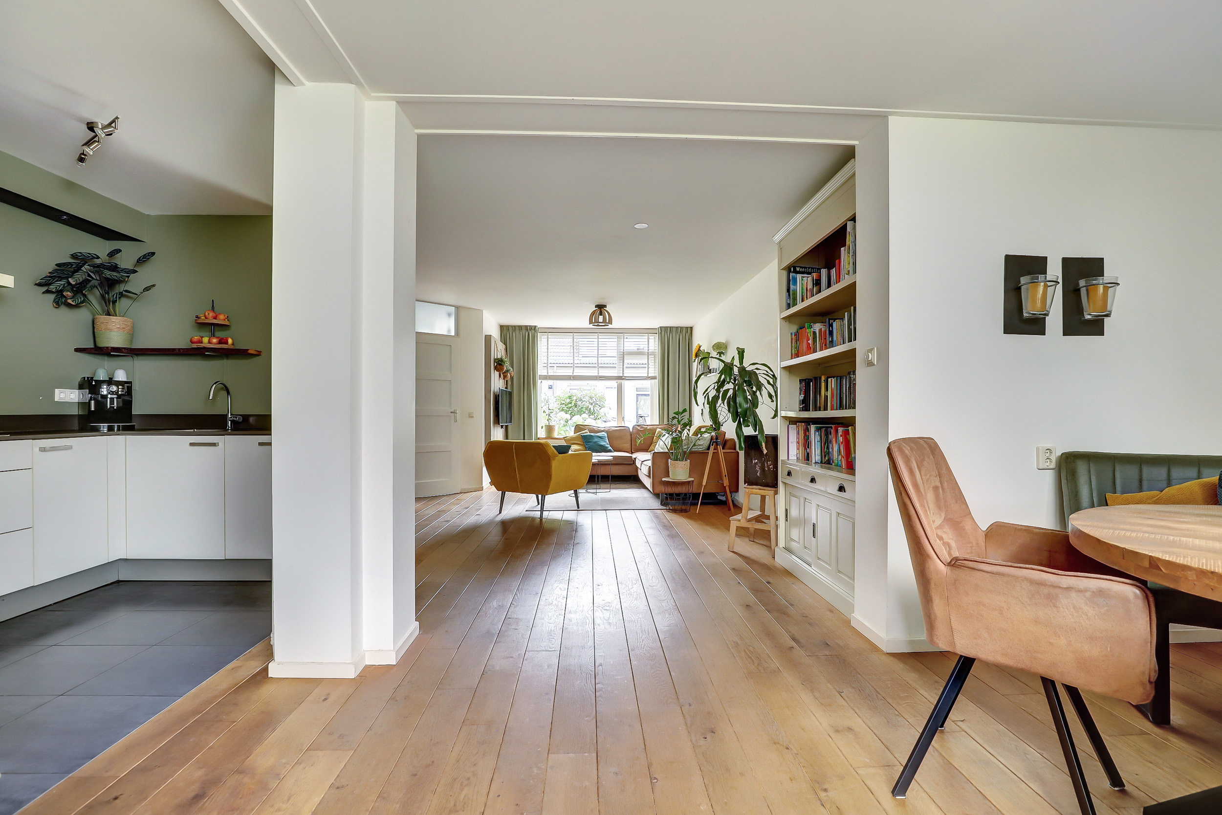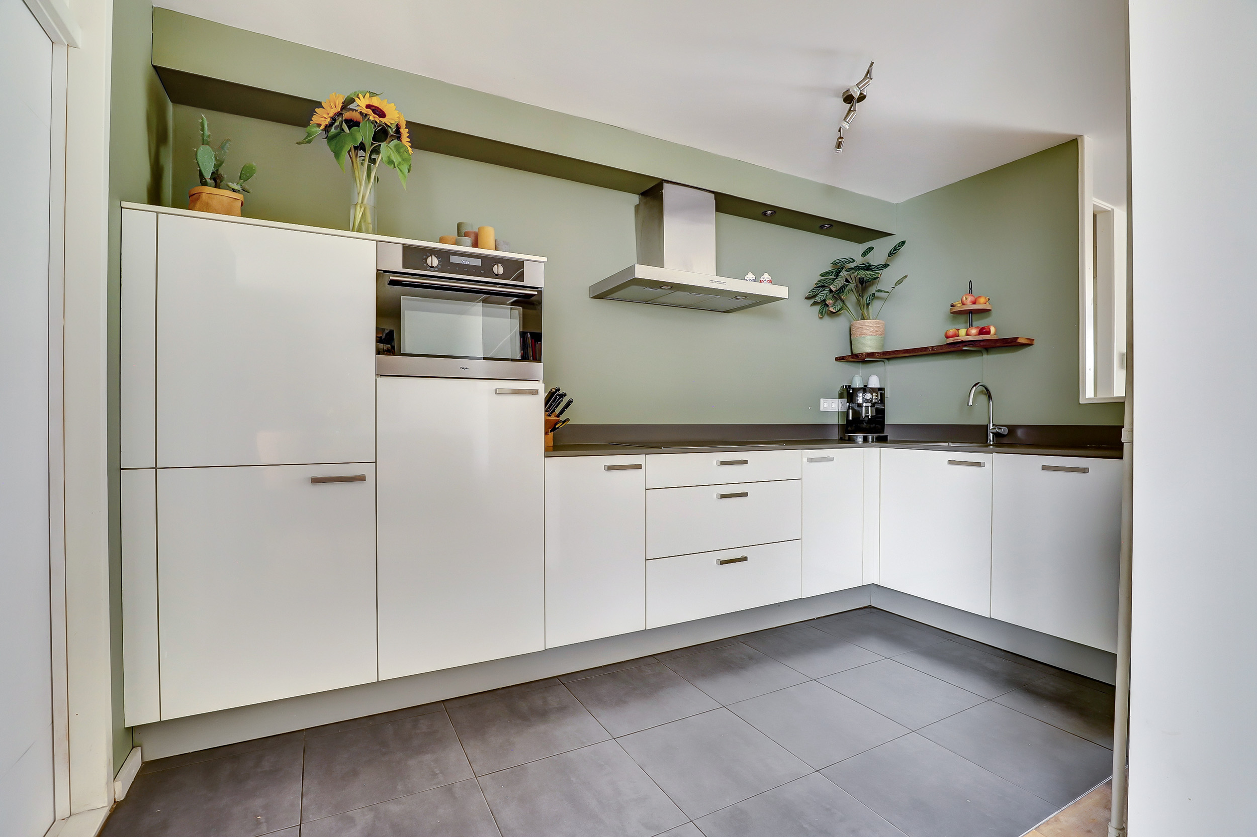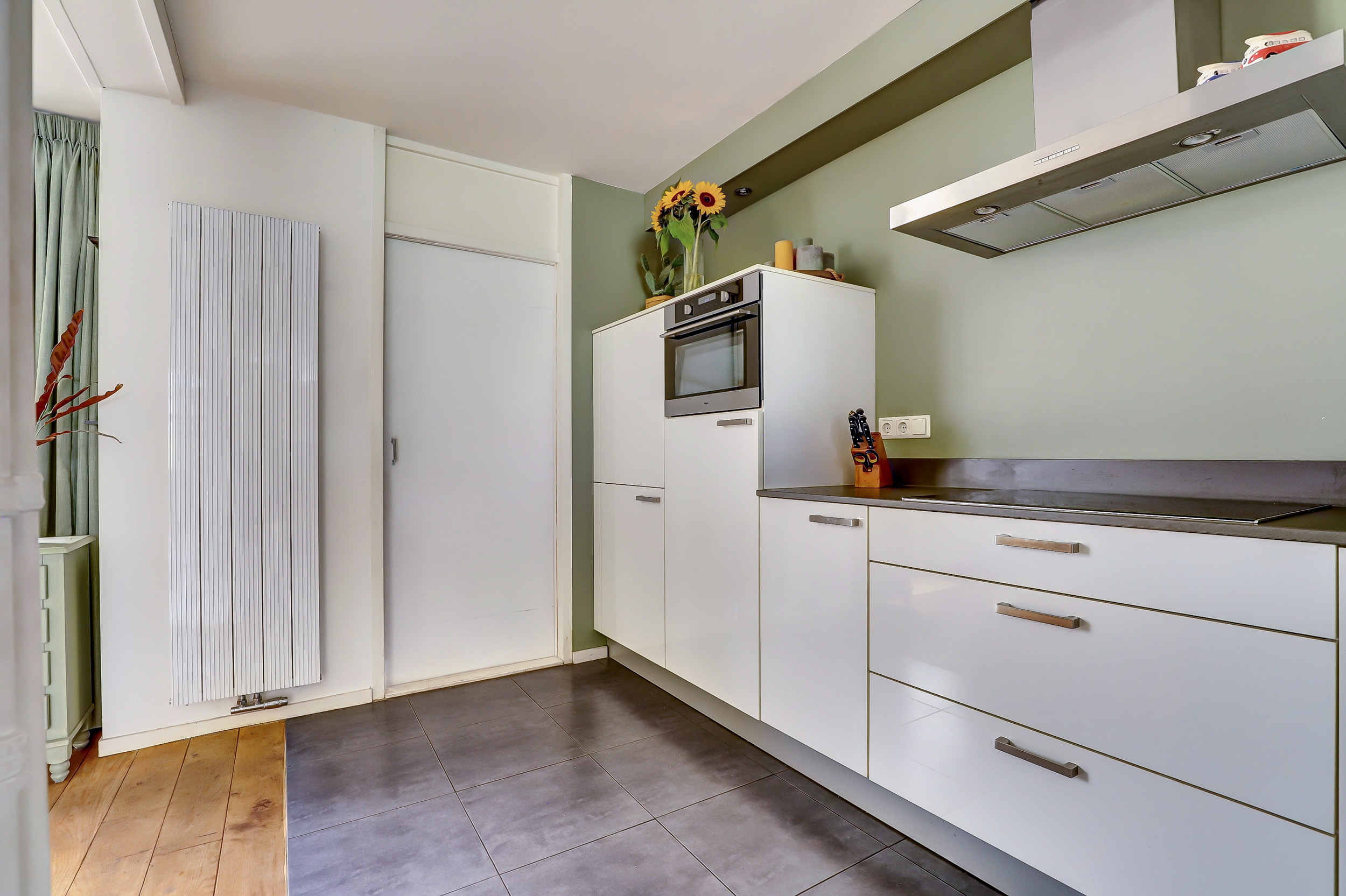 Begane grond: entree/hal, wc, vernieuwde meterkast, ruime uitgebouwde woonkamer, in 2017 vernieuwde open keuken met diverse inbouwapparatuur, bijkeuken met wasmachine-aansluiting en cv-ketel (2012).