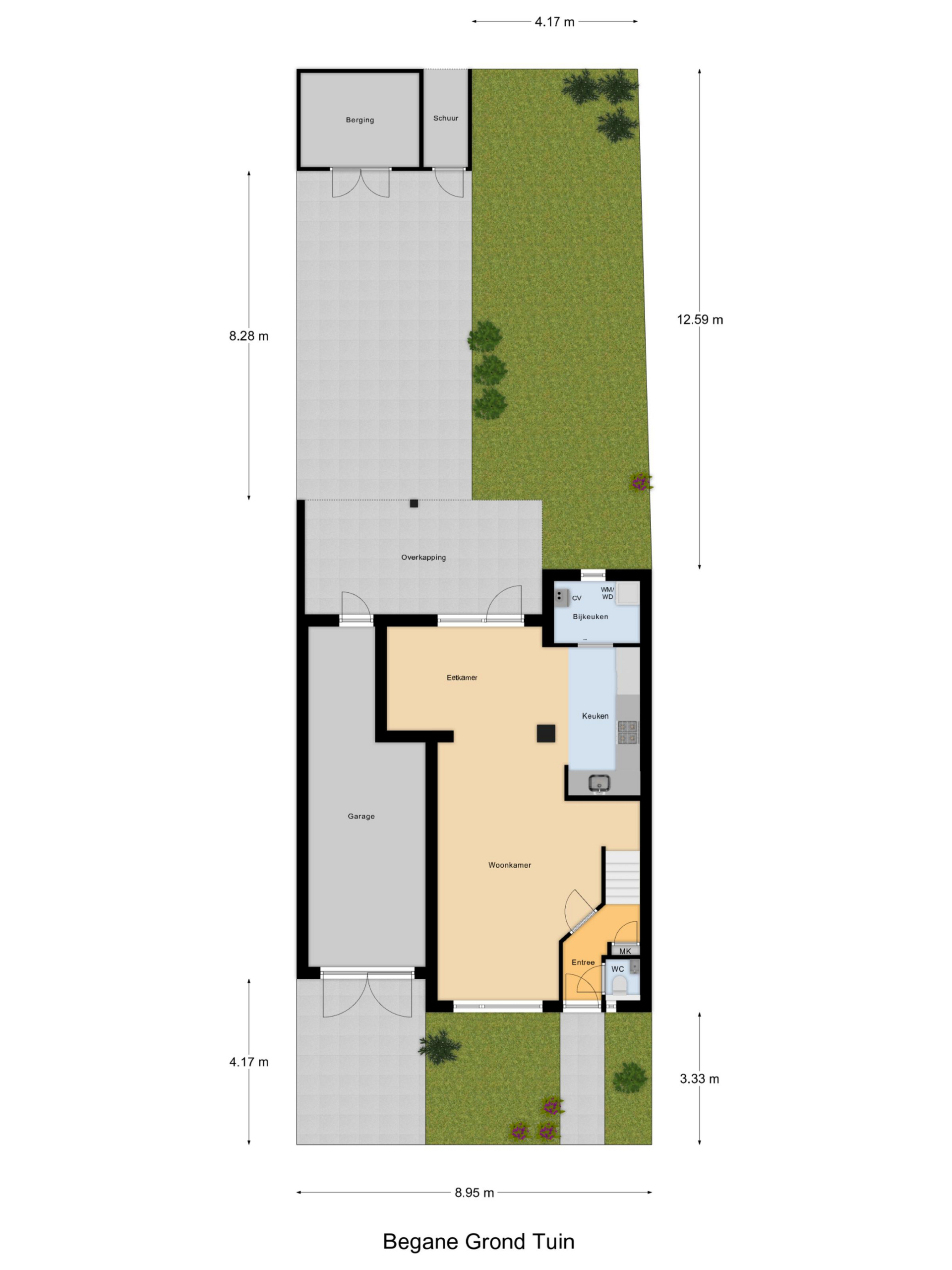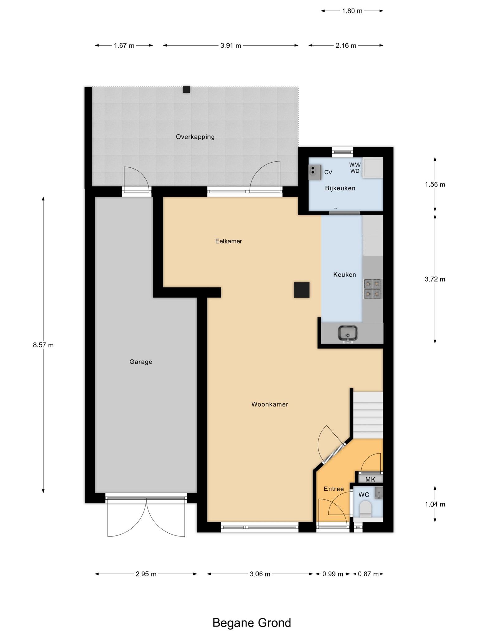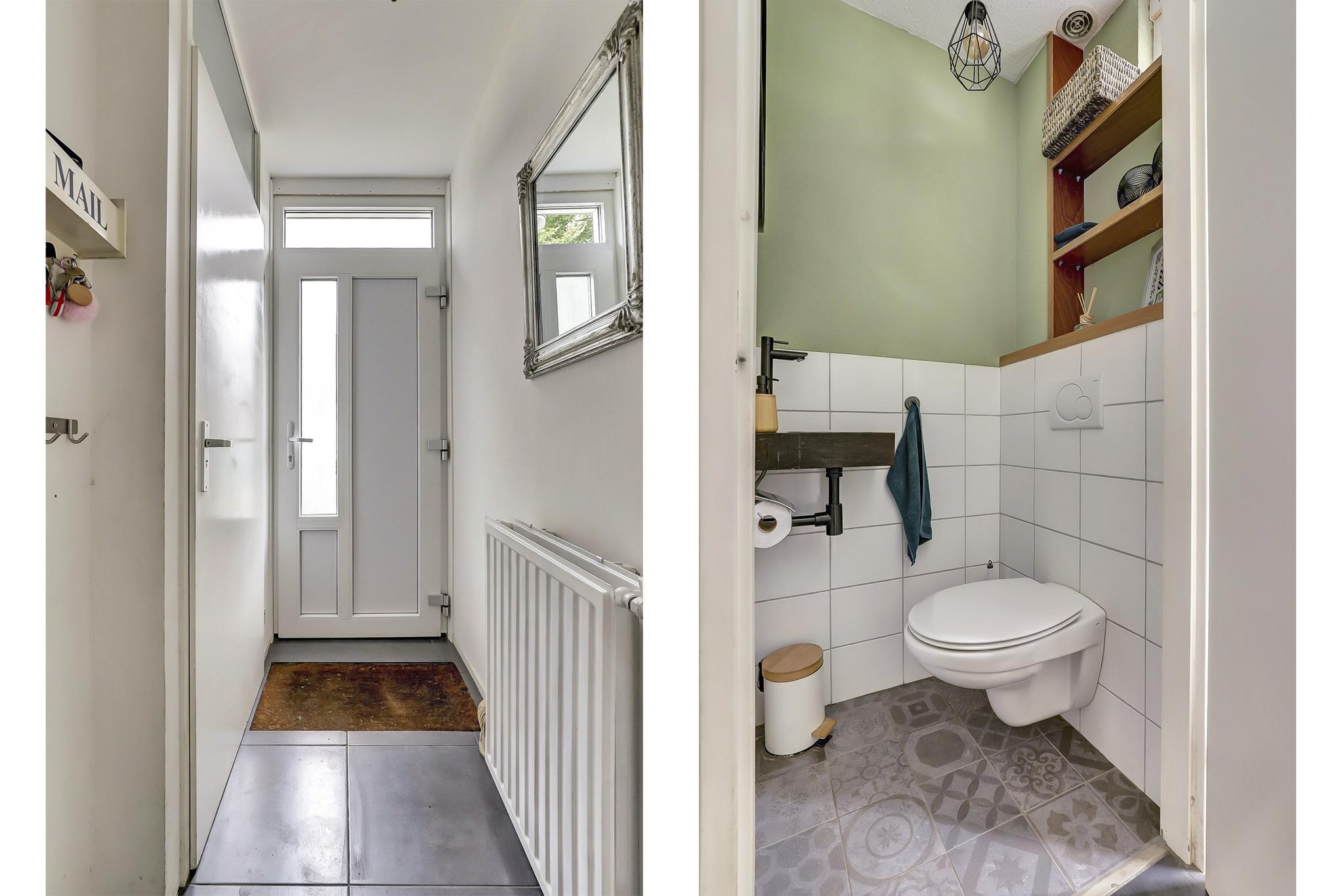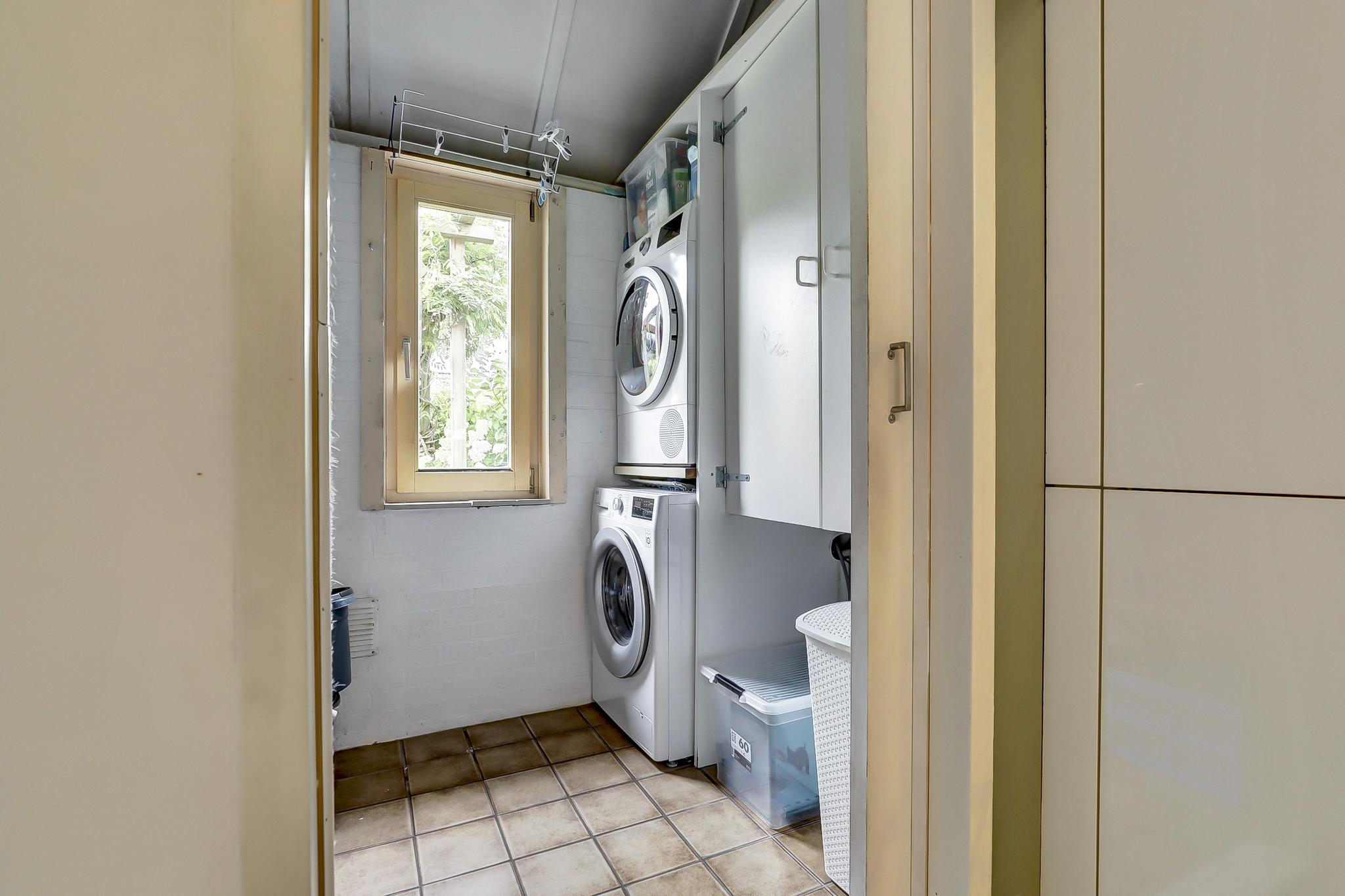 Begane grond: entree/hal, wc, vernieuwde meterkast, ruime uitgebouwde woonkamer, in 2017 vernieuwde open keuken met diverse inbouwapparatuur, bijkeuken met wasmachine-aansluiting en cv-ketel (2012).