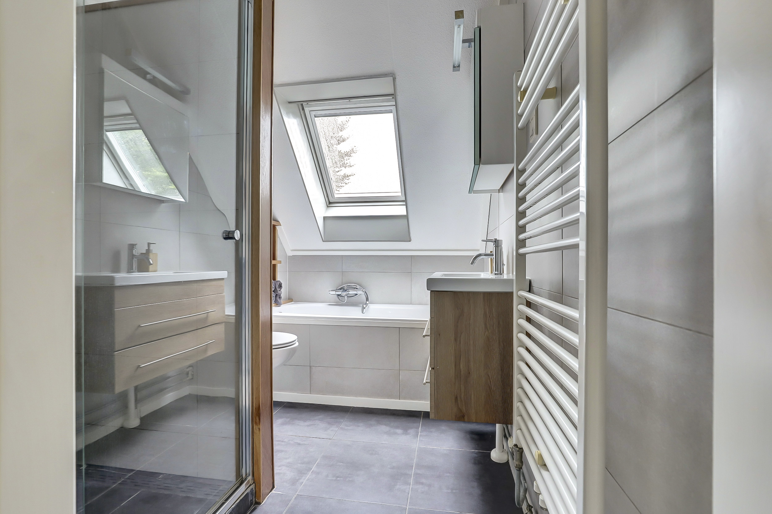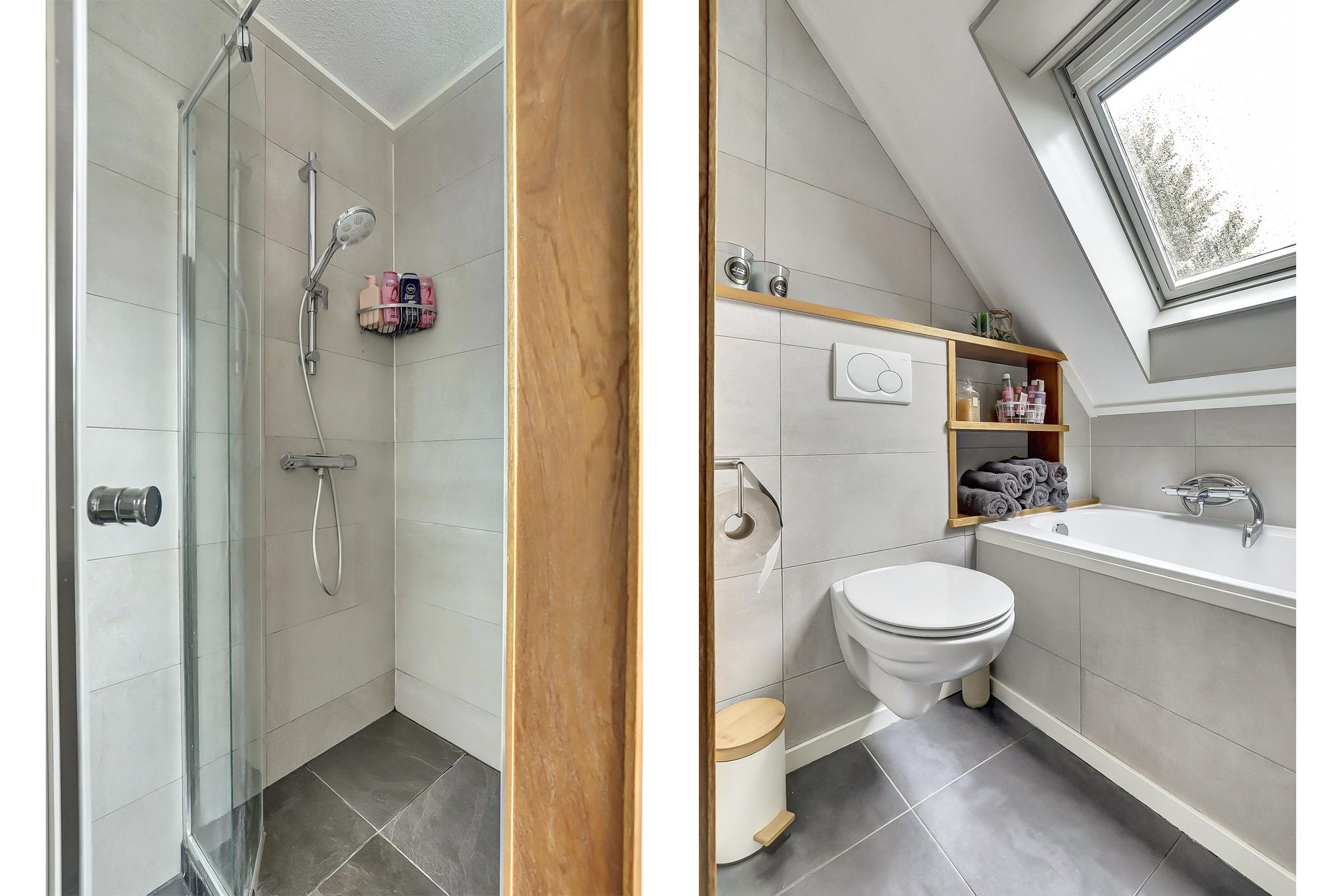 Eerste verdieping: overloop, 3 slaapkamers (waarvan 1 met schuifkastwand), vernieuwde badkamer met douche, ligbad, wastafelmeubel en wc. Vaste trap naar..