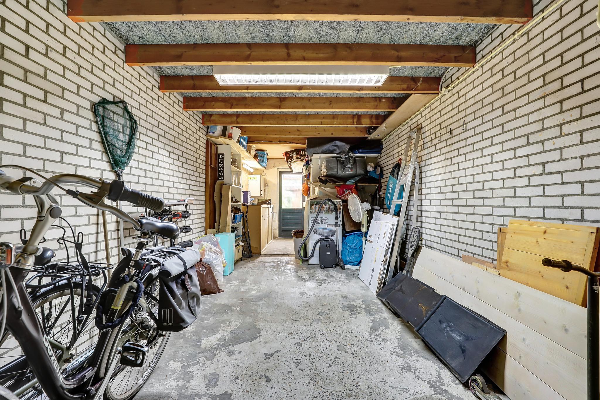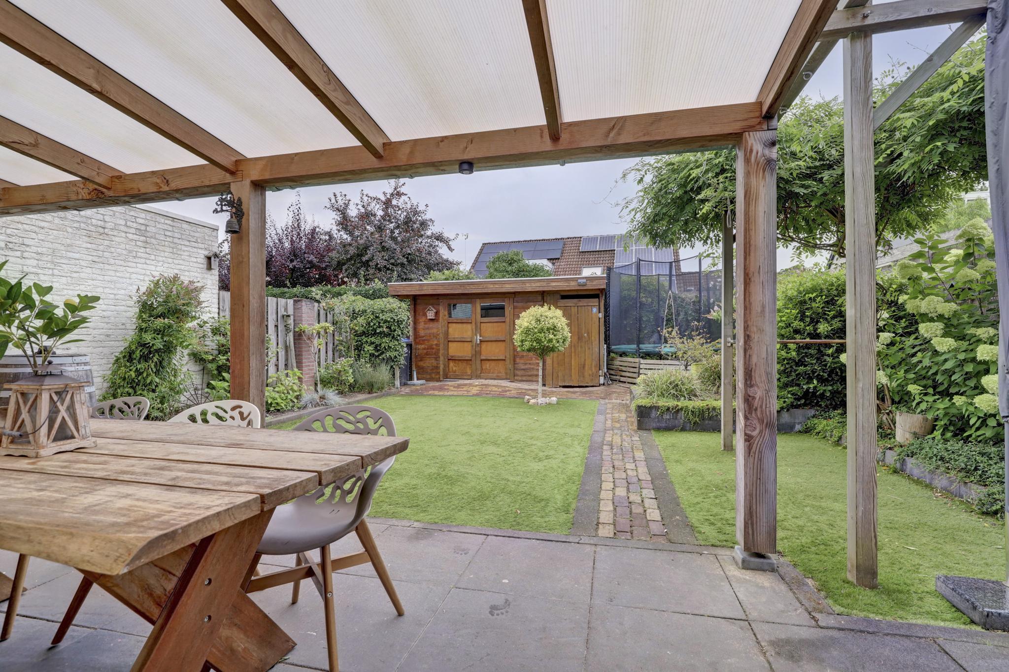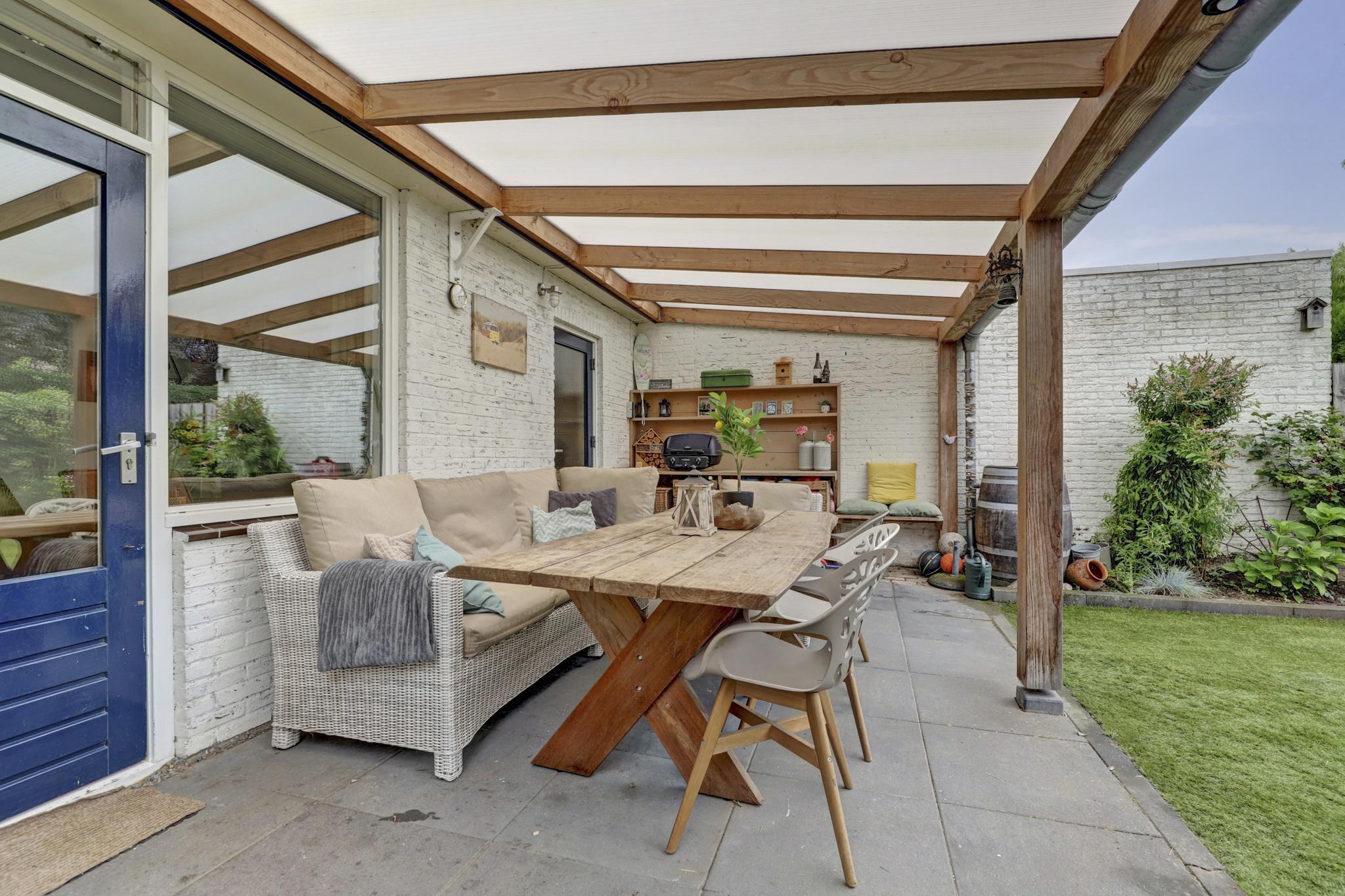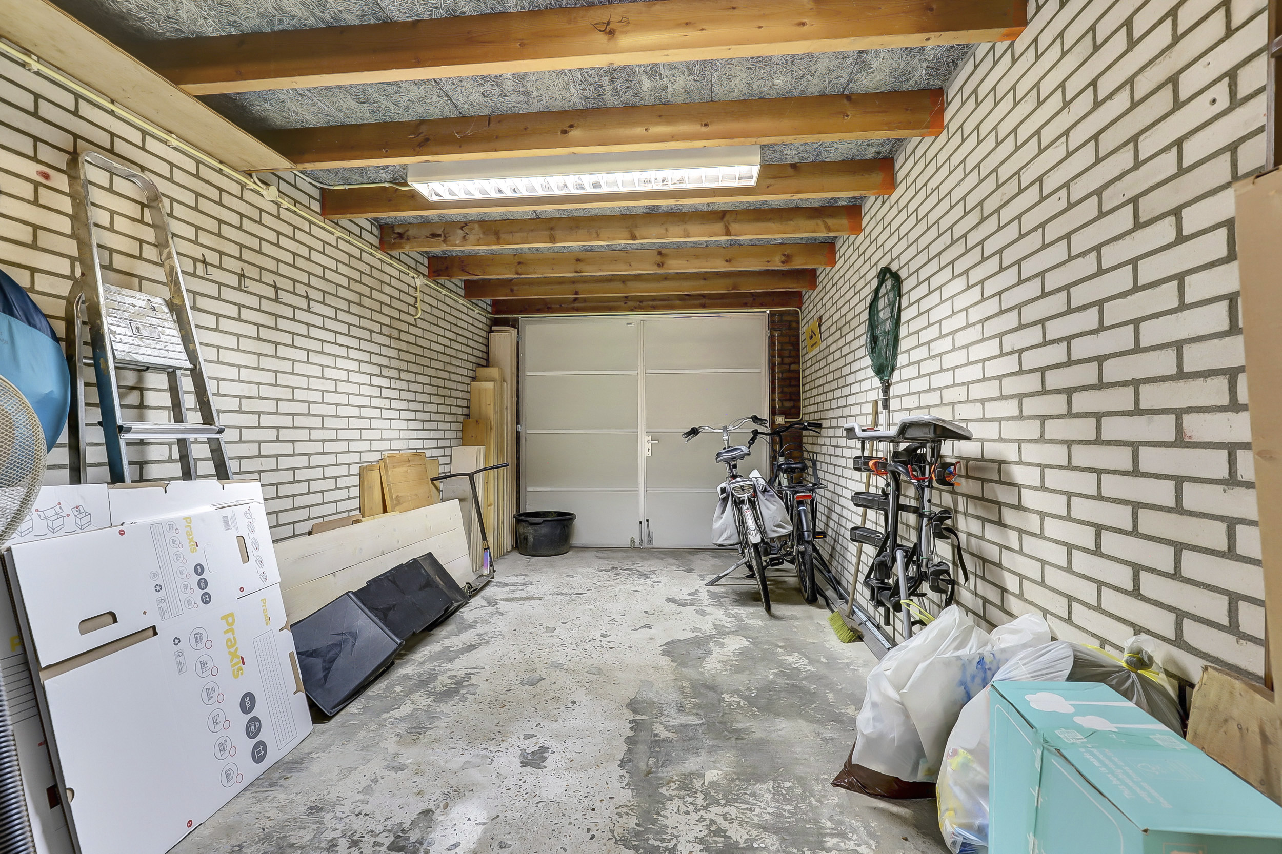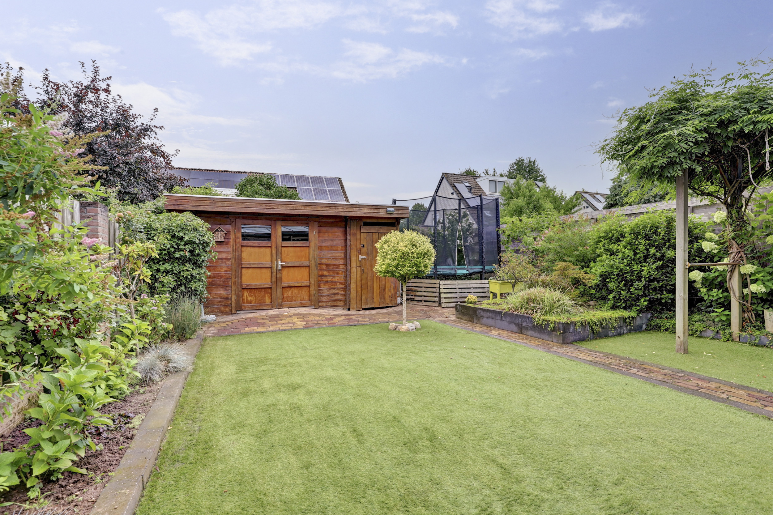 Fraai aangelegde achtertuin met meerdere terrassen, buitenkeuken en berging. Ruime garage/berging (26 m2) met vernieuwde dakbedekking.
