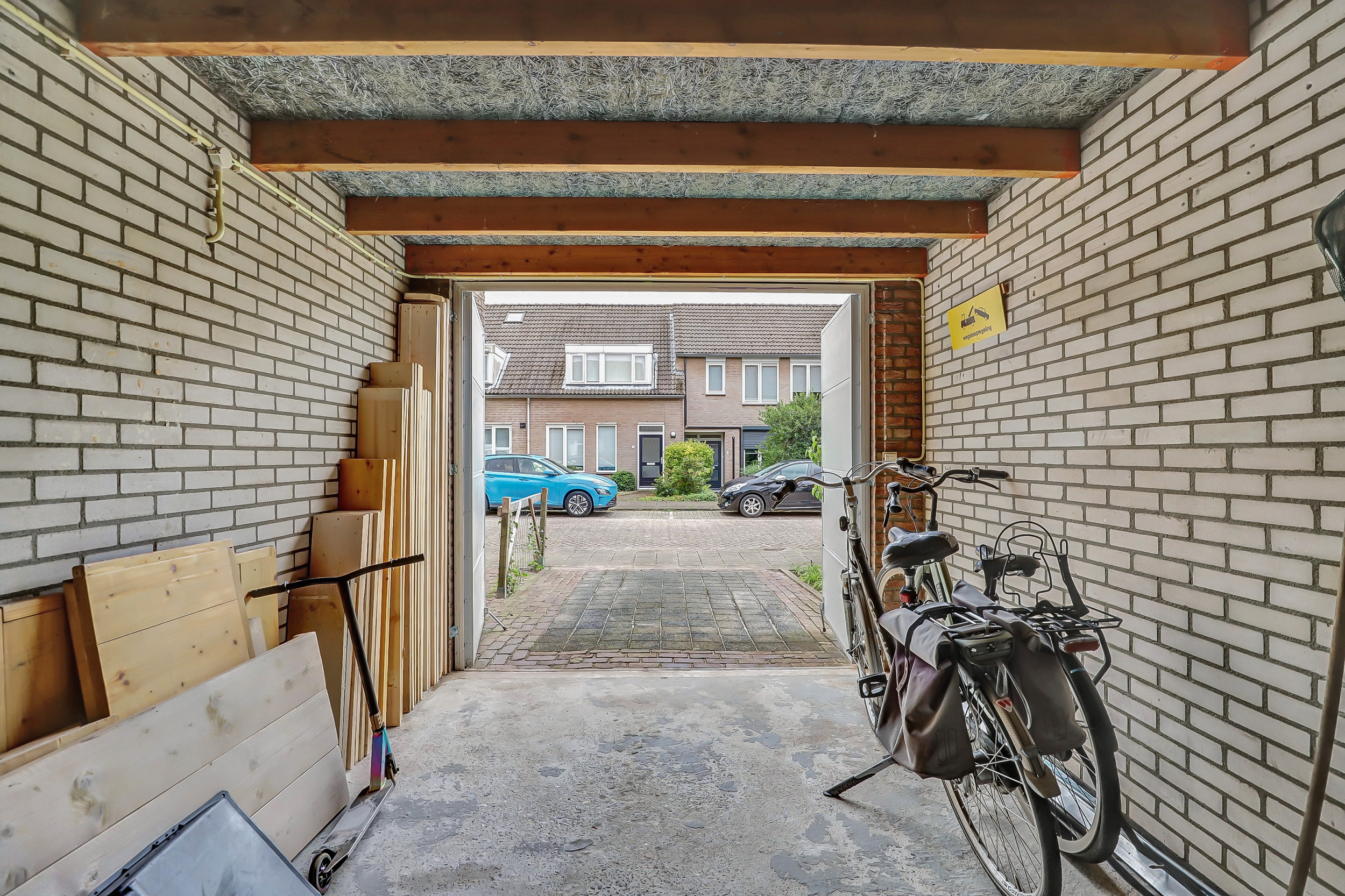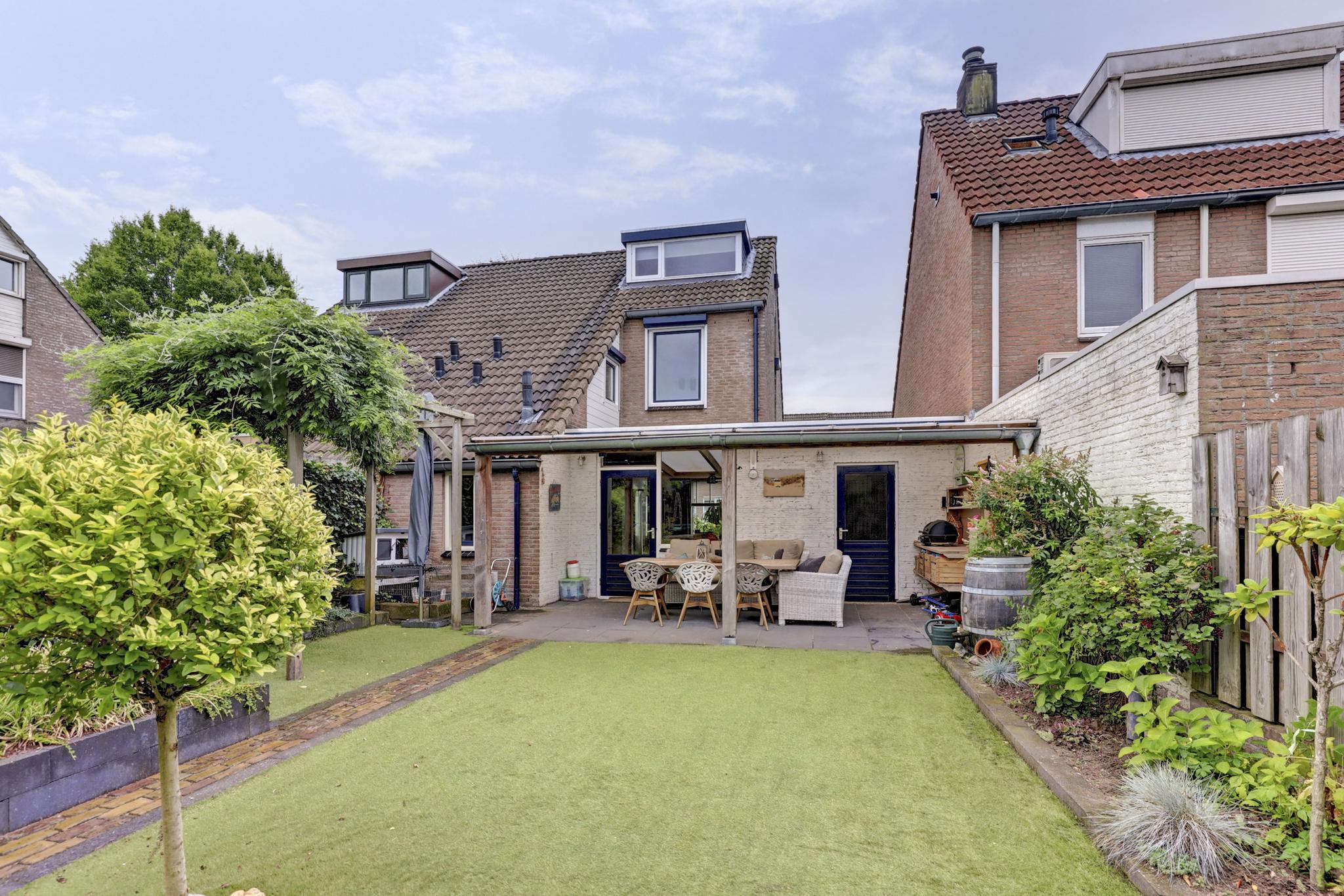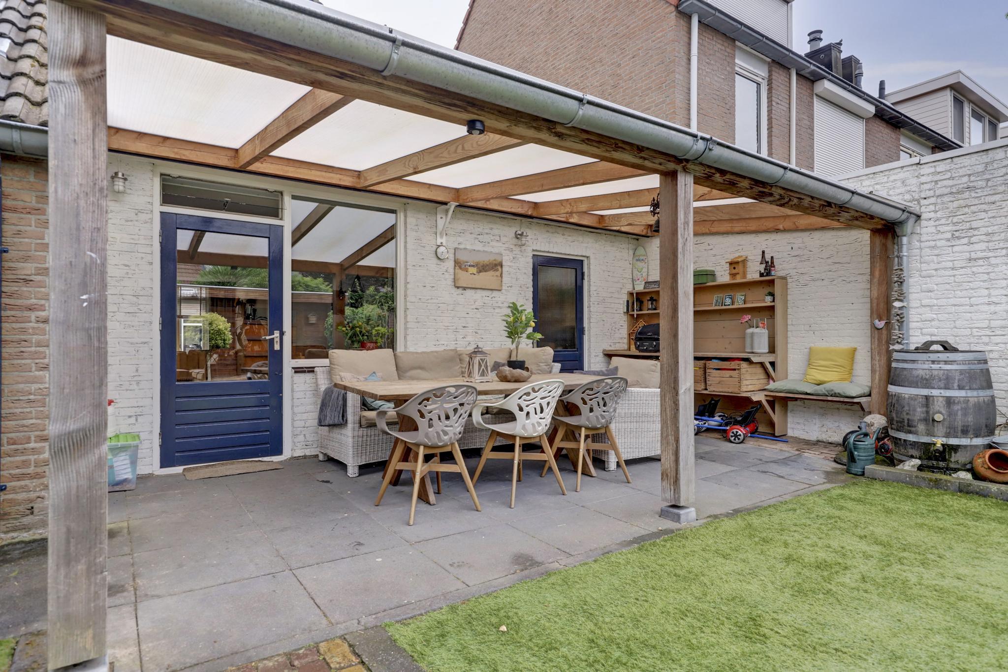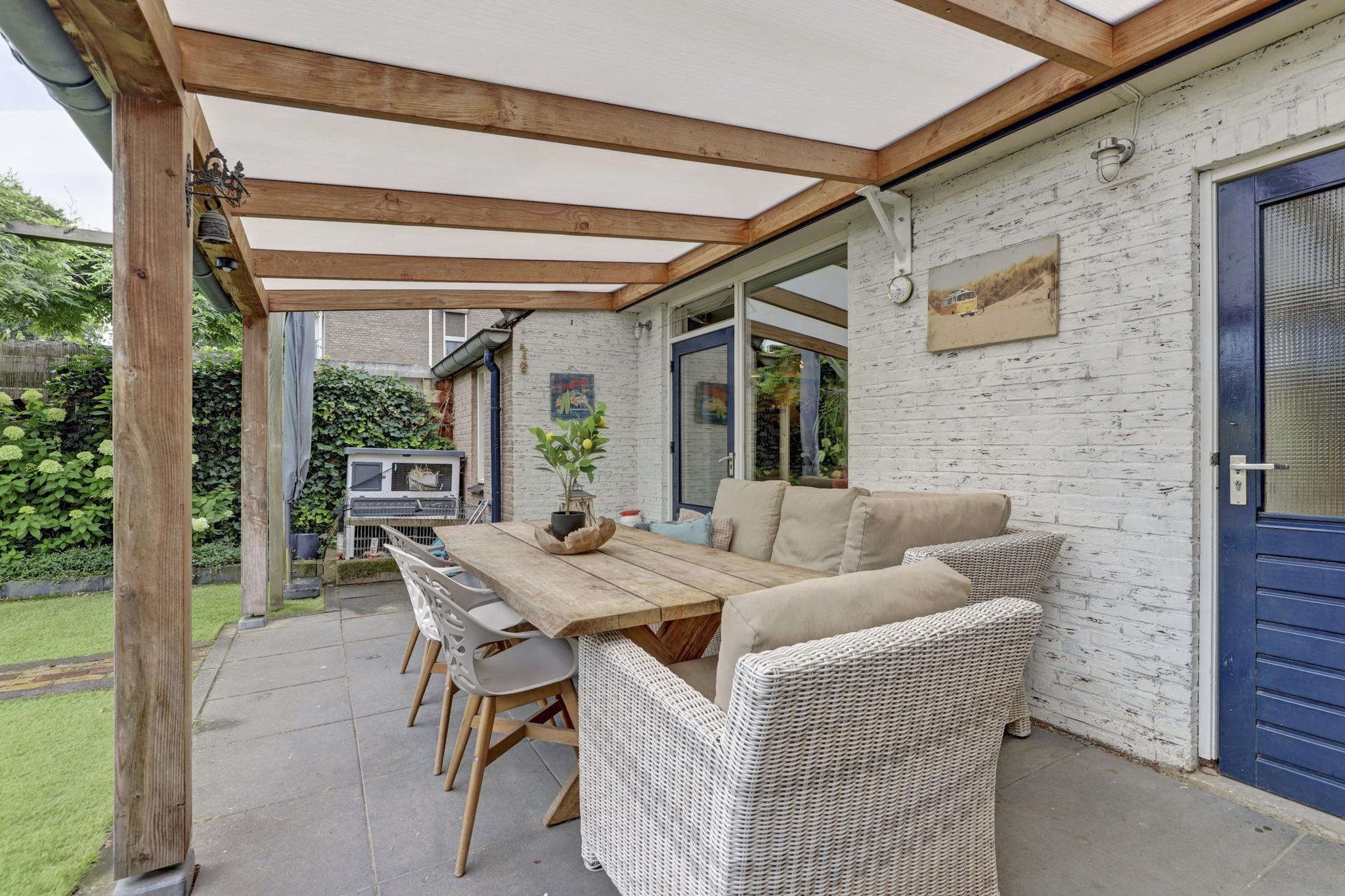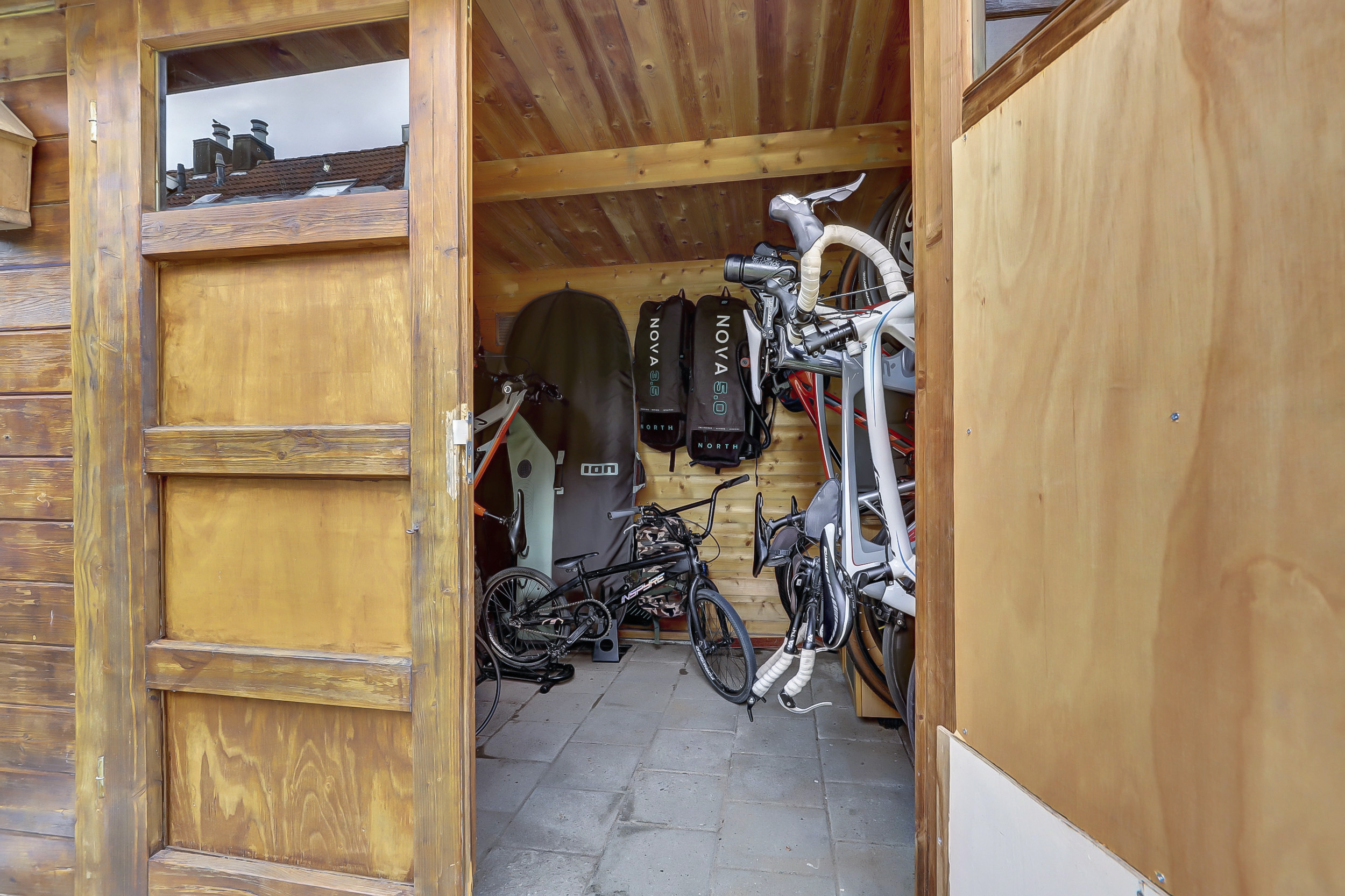 Fraai aangelegde achtertuin met meerdere terrassen, buitenkeuken en berging. Ruime garage/berging (26 m2) met vernieuwde dakbedekking.