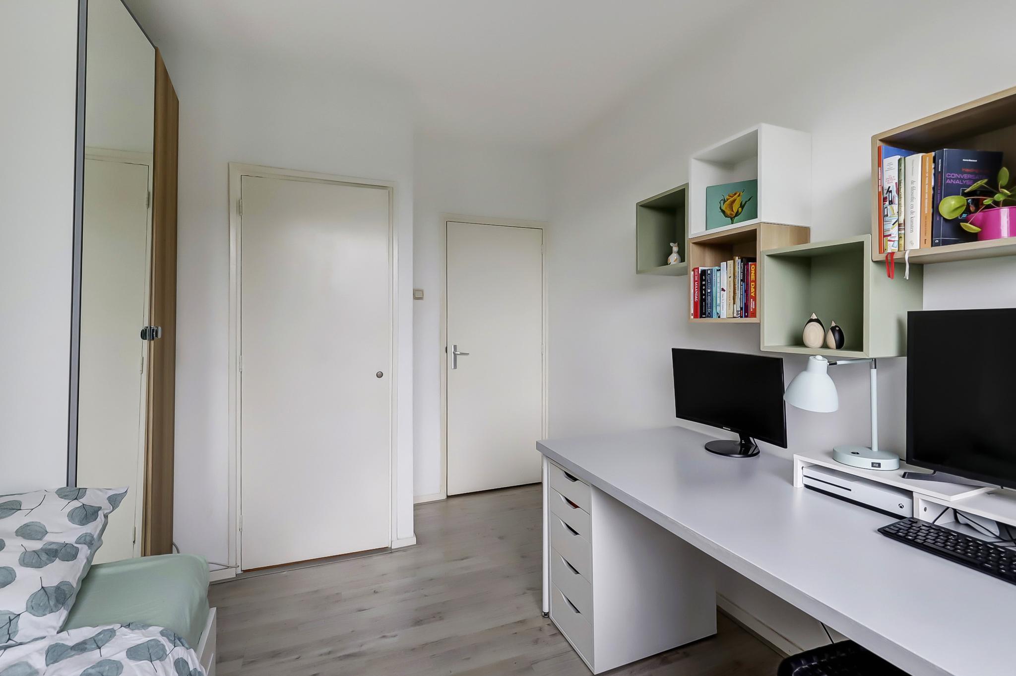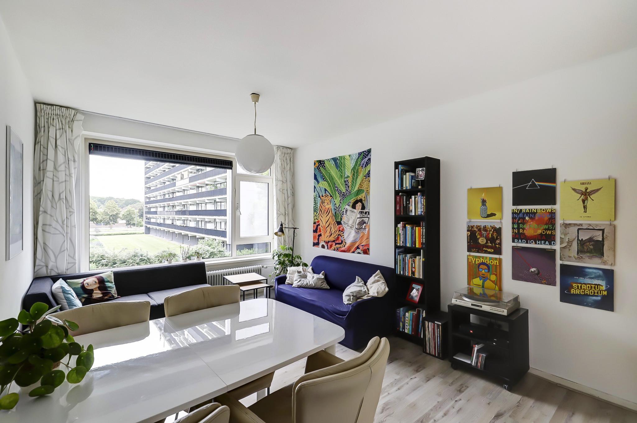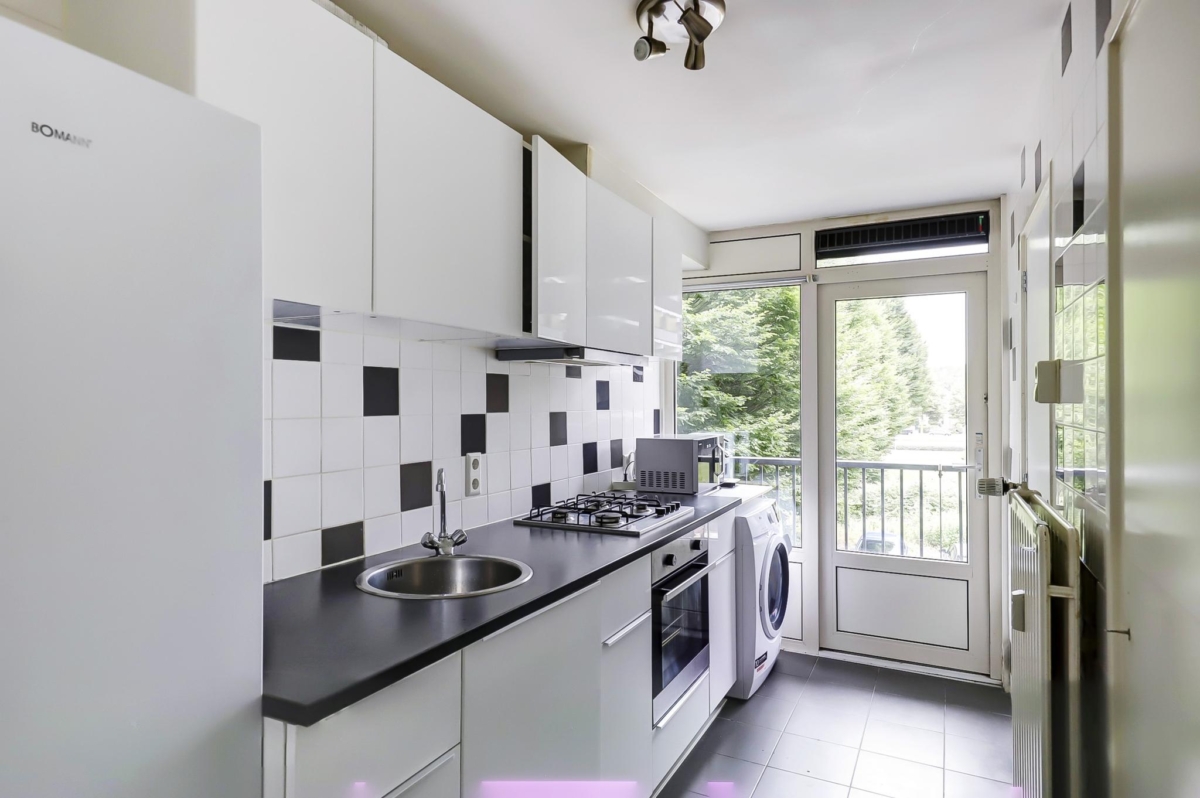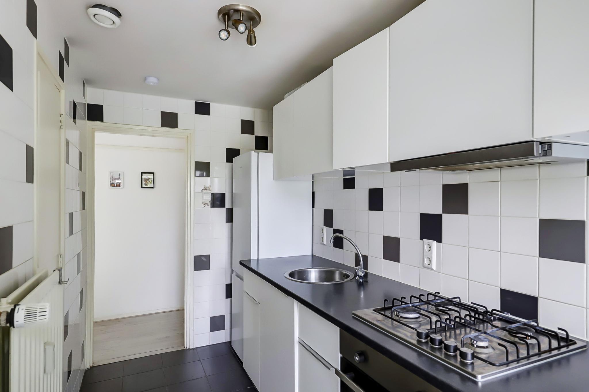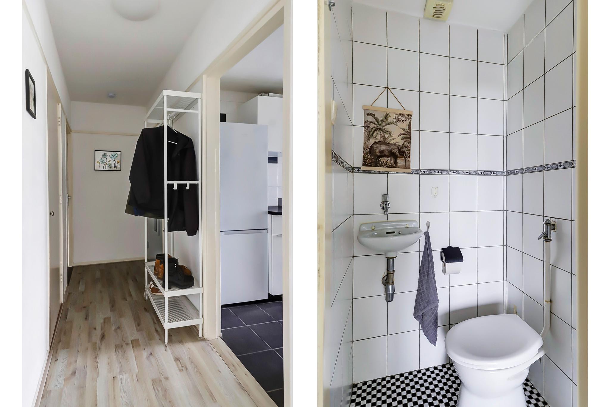 Entree, gang, recent vervangen keuken met diverse apparatuur (oven, gaskookplaat en afzuigkap) en balkon op het noordwesten waar je lekker van de namiddag- en avondzon kunt genieten. Via de keuken is de eenvoudige doucheruimte met vaste wastafel en inloopdouche bereikbaar. Aan de gang zijn de meterkast met vernieuwde inrichting en het toilet. De woonkamer heeft aan de voorzijde een mooi uitzicht op het groen. Grenzend aan de woonkamer is een slaapkamer; deze scheidingswand is ook weer eenvoudig te verwijderen zodat er een grote doorzonwoonkamer te realiseren is. Ten slotte zijn er nog 2 slaapkamers (circa 8,5 en 11 m2) waarvan de grootste met een vaste kast is uitgerust.