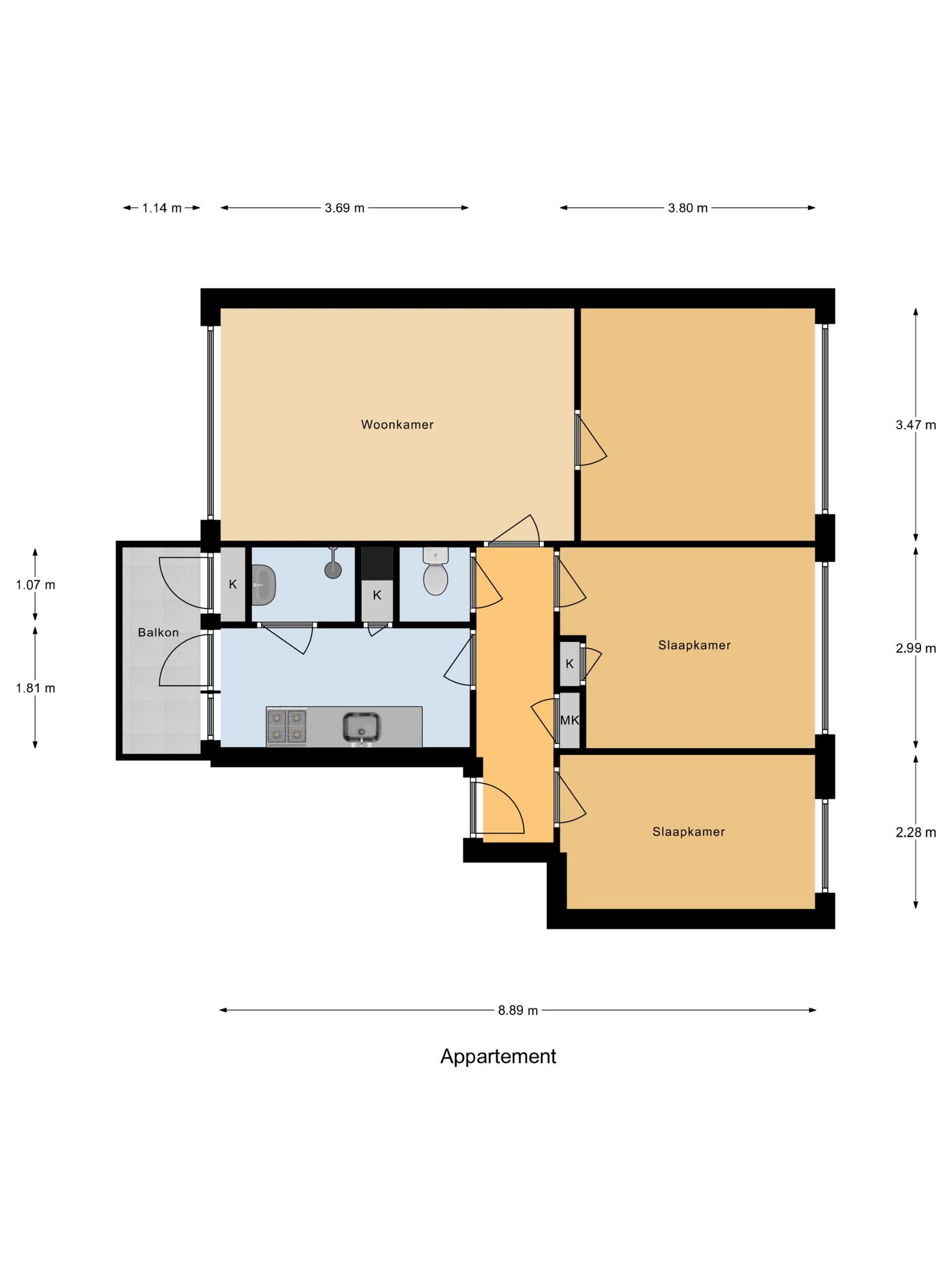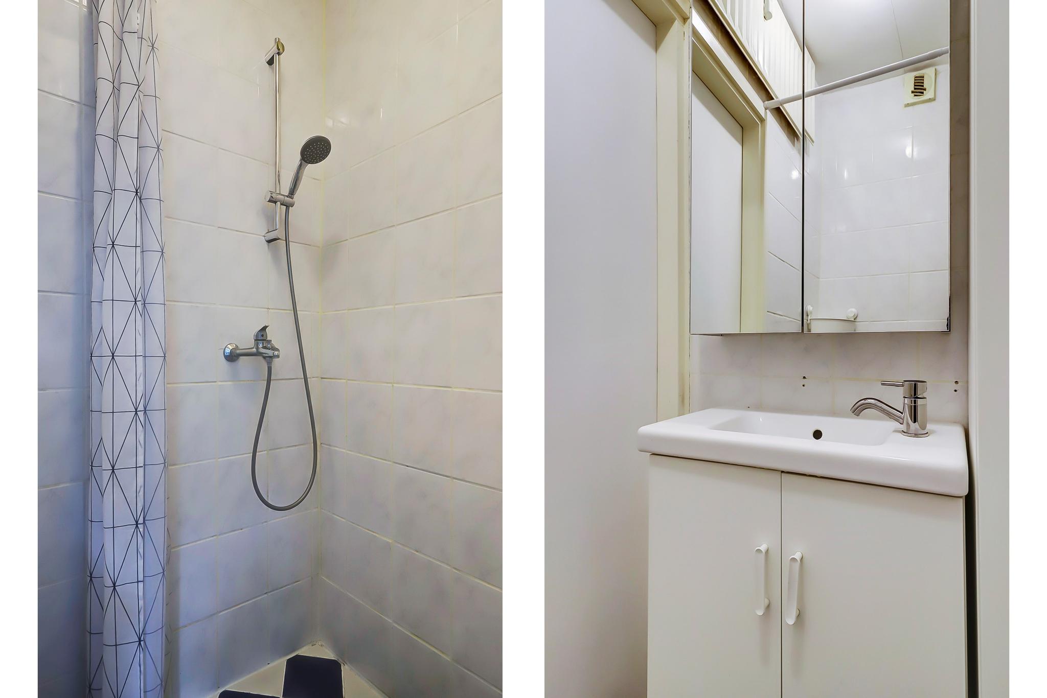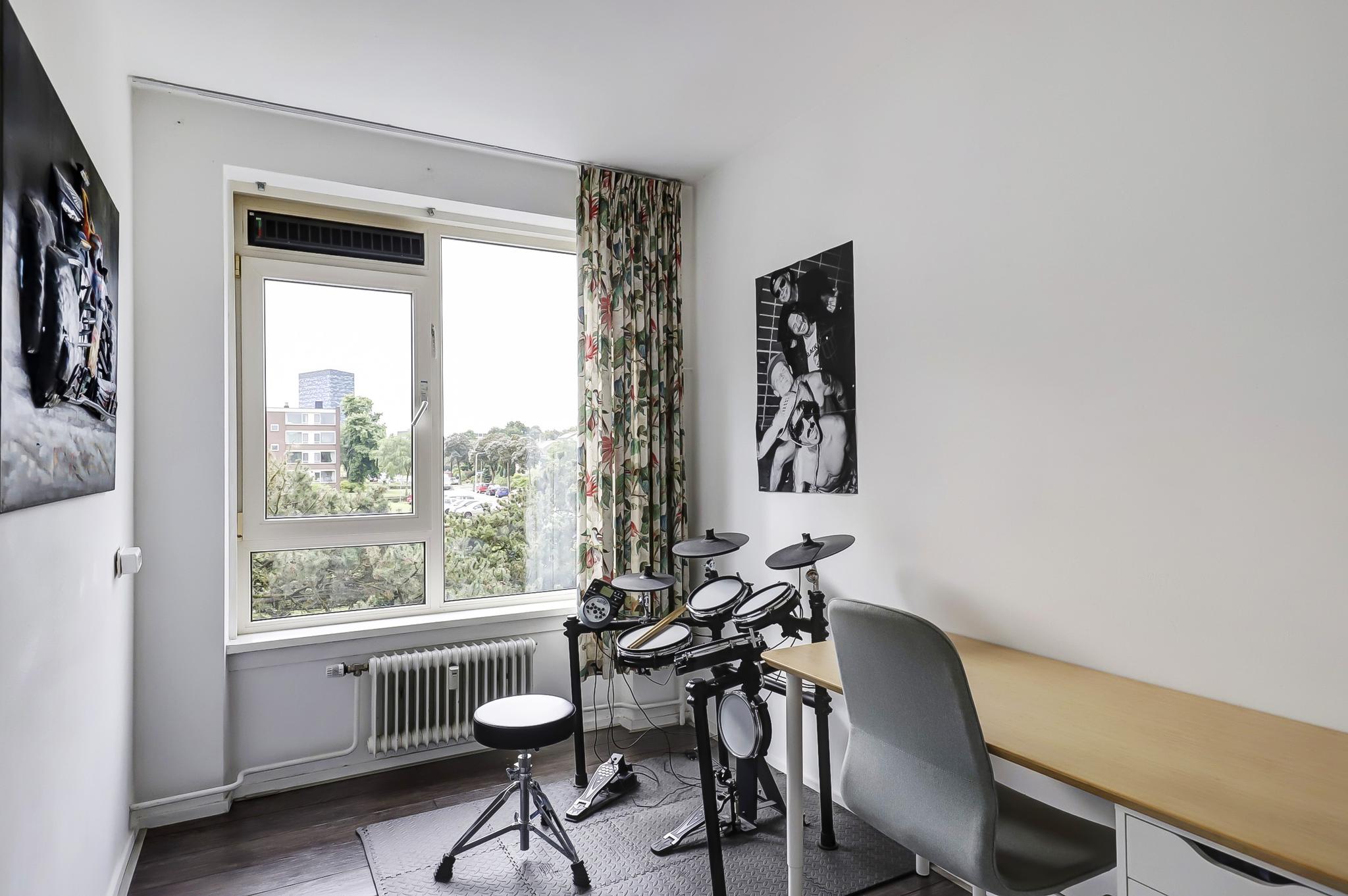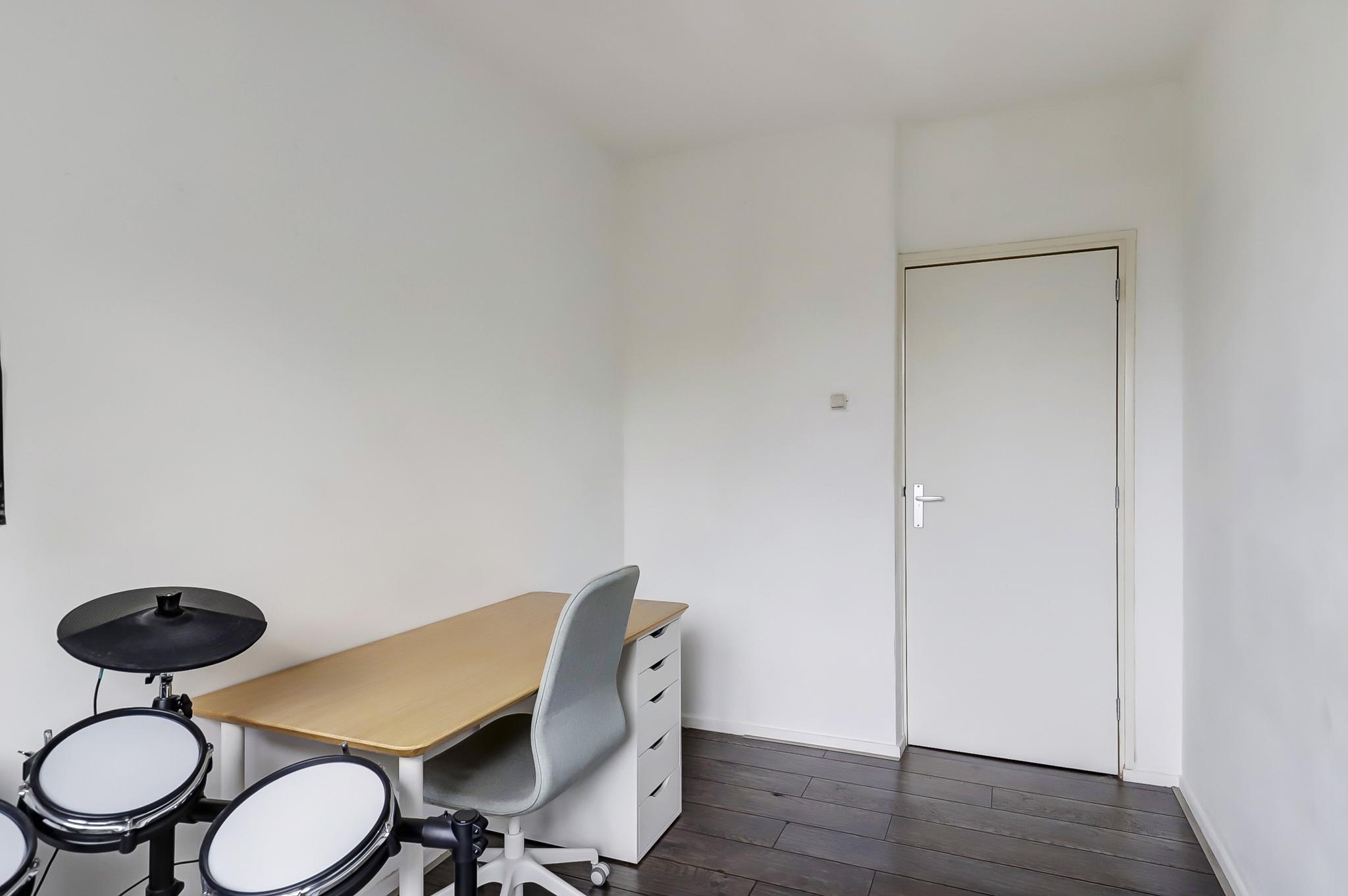 Entree, gang, recent vervangen keuken met diverse apparatuur (oven, gaskookplaat en afzuigkap) en balkon op het noordwesten waar je lekker van de namiddag- en avondzon kunt genieten. Via de keuken is de eenvoudige doucheruimte met vaste wastafel en inloopdouche bereikbaar. Aan de gang zijn de meterkast met vernieuwde inrichting en het toilet. De woonkamer heeft aan de voorzijde een mooi uitzicht op het groen. Grenzend aan de woonkamer is een slaapkamer; deze scheidingswand is ook weer eenvoudig te verwijderen zodat er een grote doorzonwoonkamer te realiseren is. Ten slotte zijn er nog 2 slaapkamers (circa 8,5 en 11 m2) waarvan de grootste met een vaste kast is uitgerust.