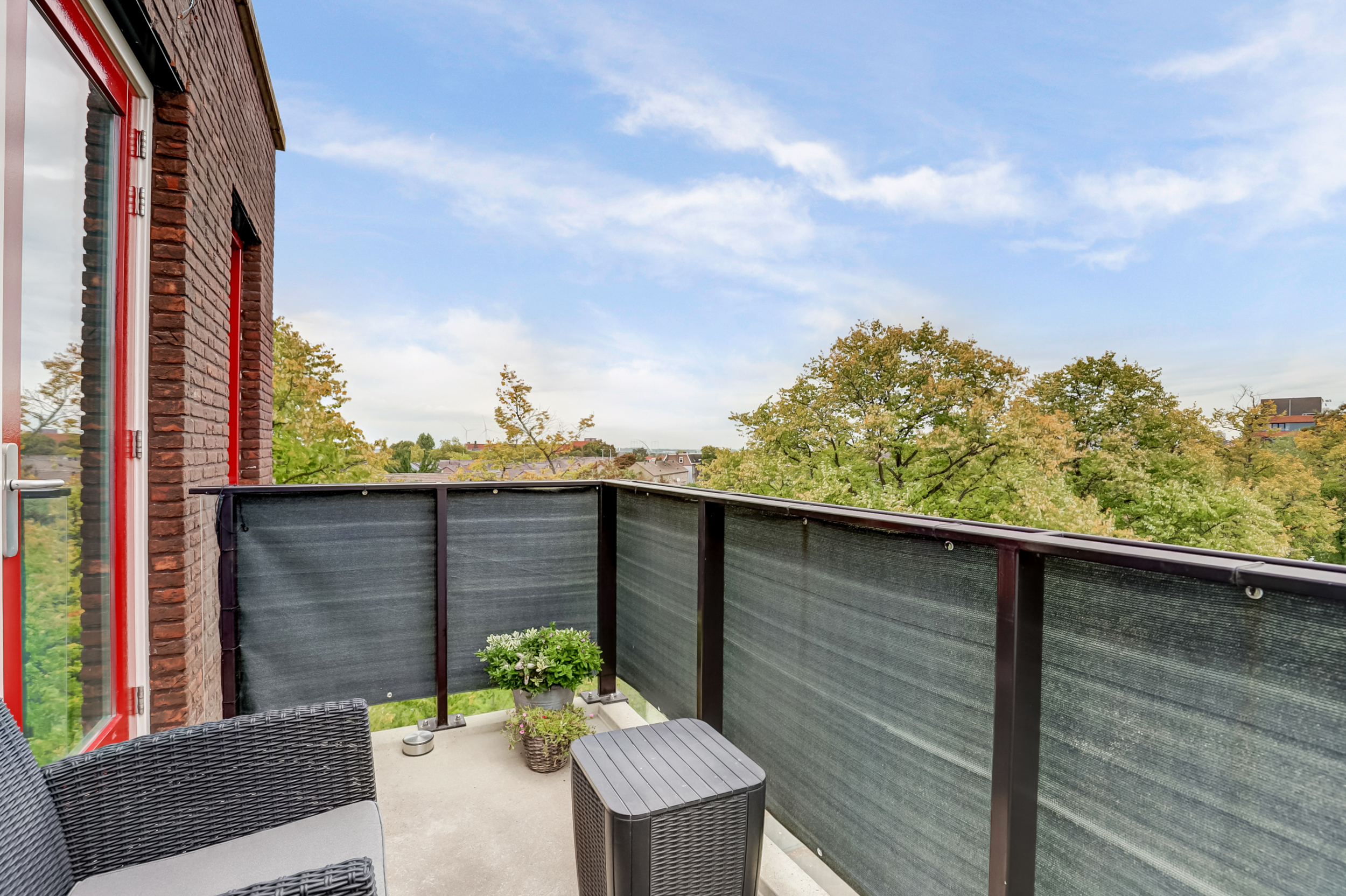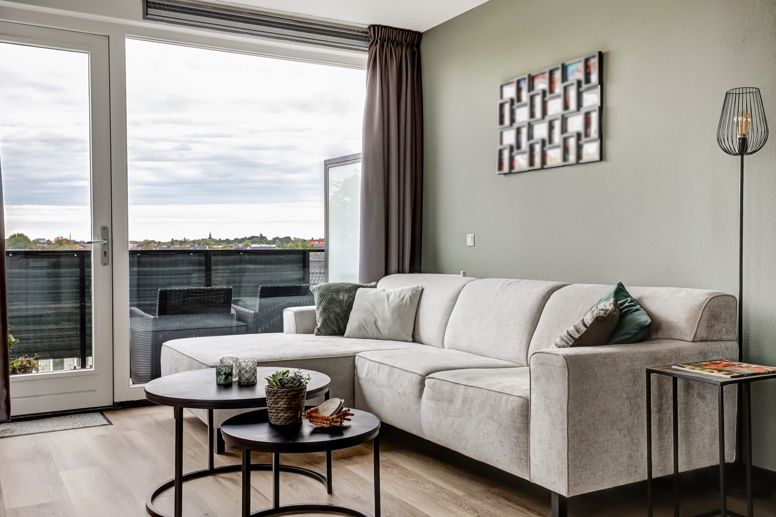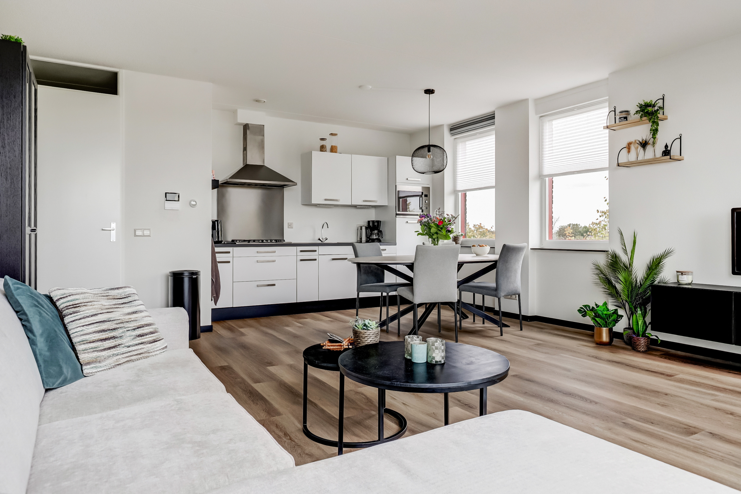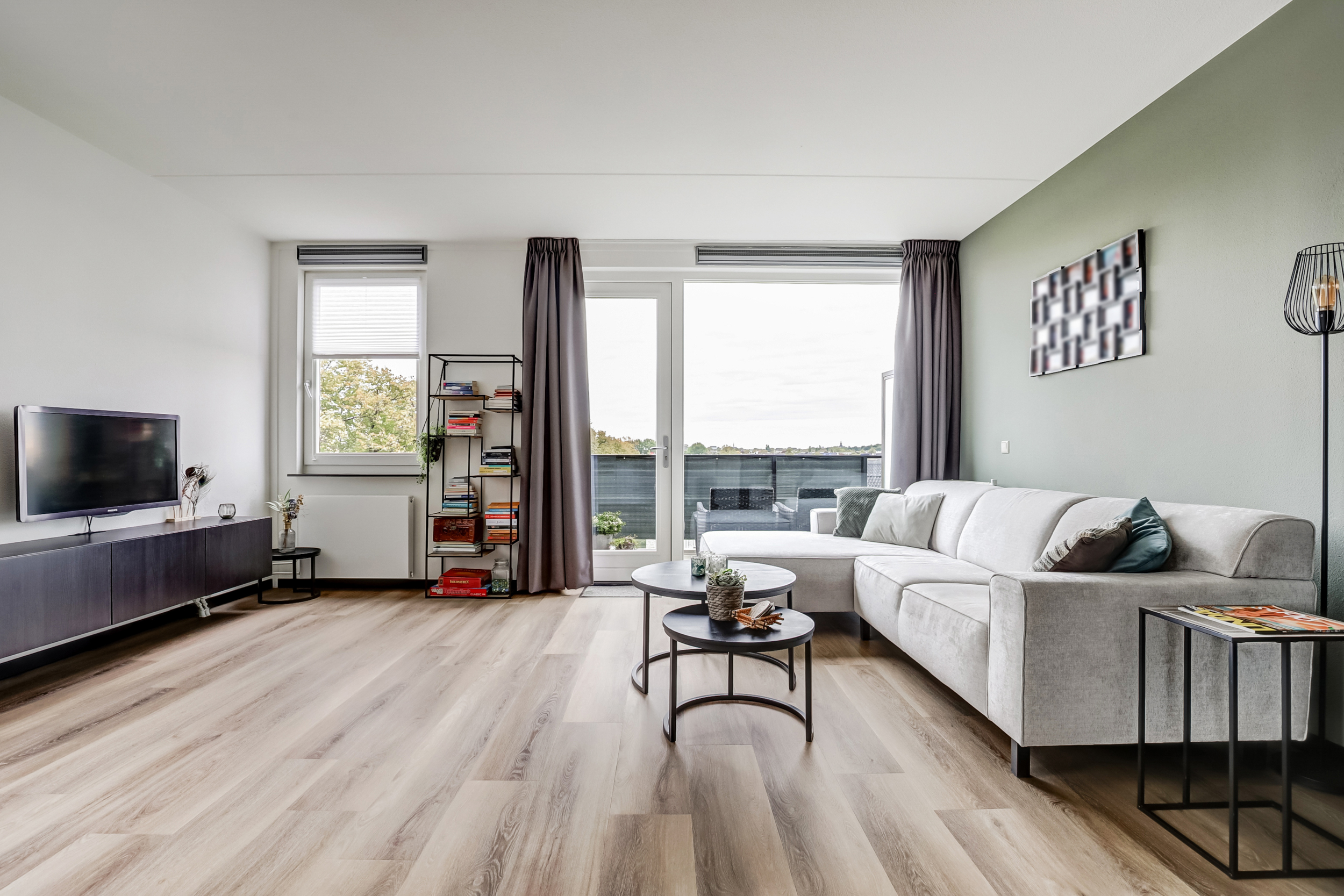 De woonkamer is voorzien van veel raamwerk waardoor het een ontzettend lichte ruimte is en je overal ver van je af kijkt. Door de hoekligging geniet je van diverse vergezichten. Vanuit de woonkamer is het balkon bereikbaar, deze ligt op het noorden en biedt in de zomer tot circa 13.30 uur nog zon.