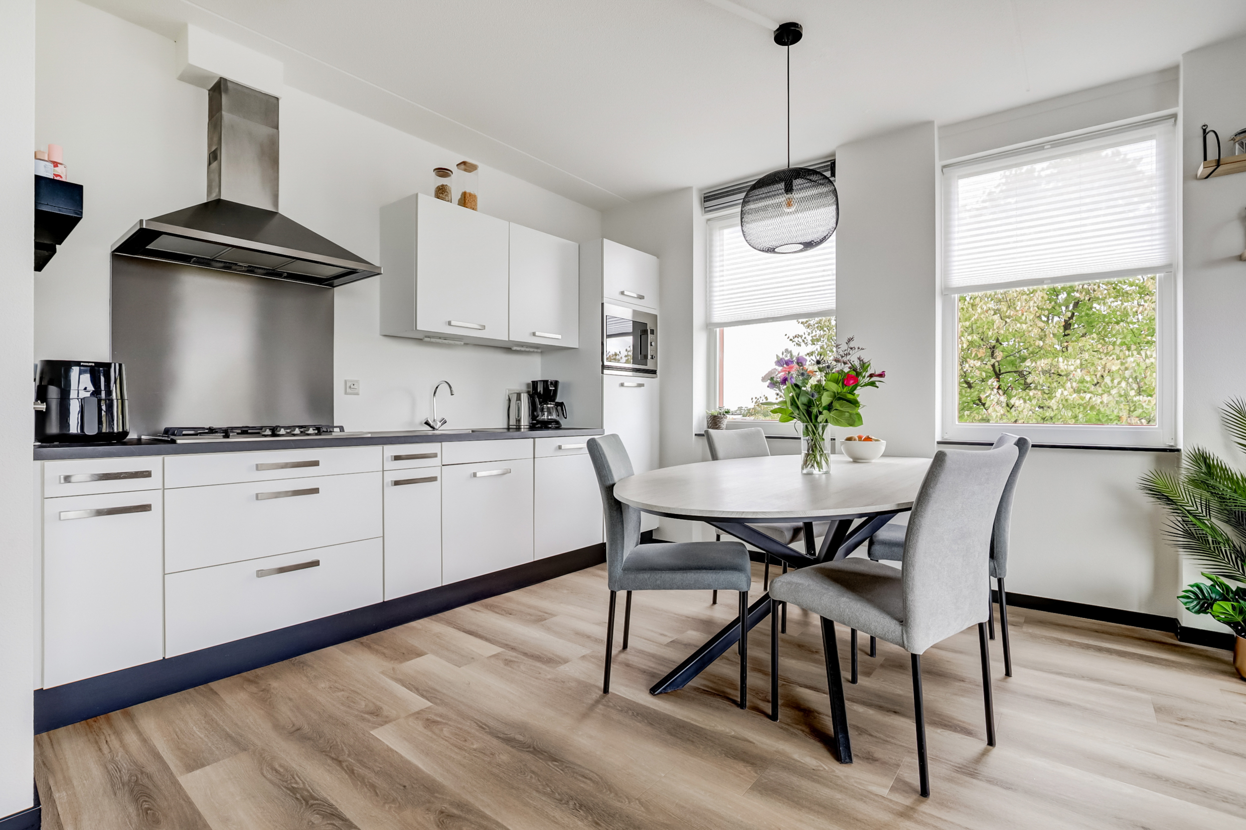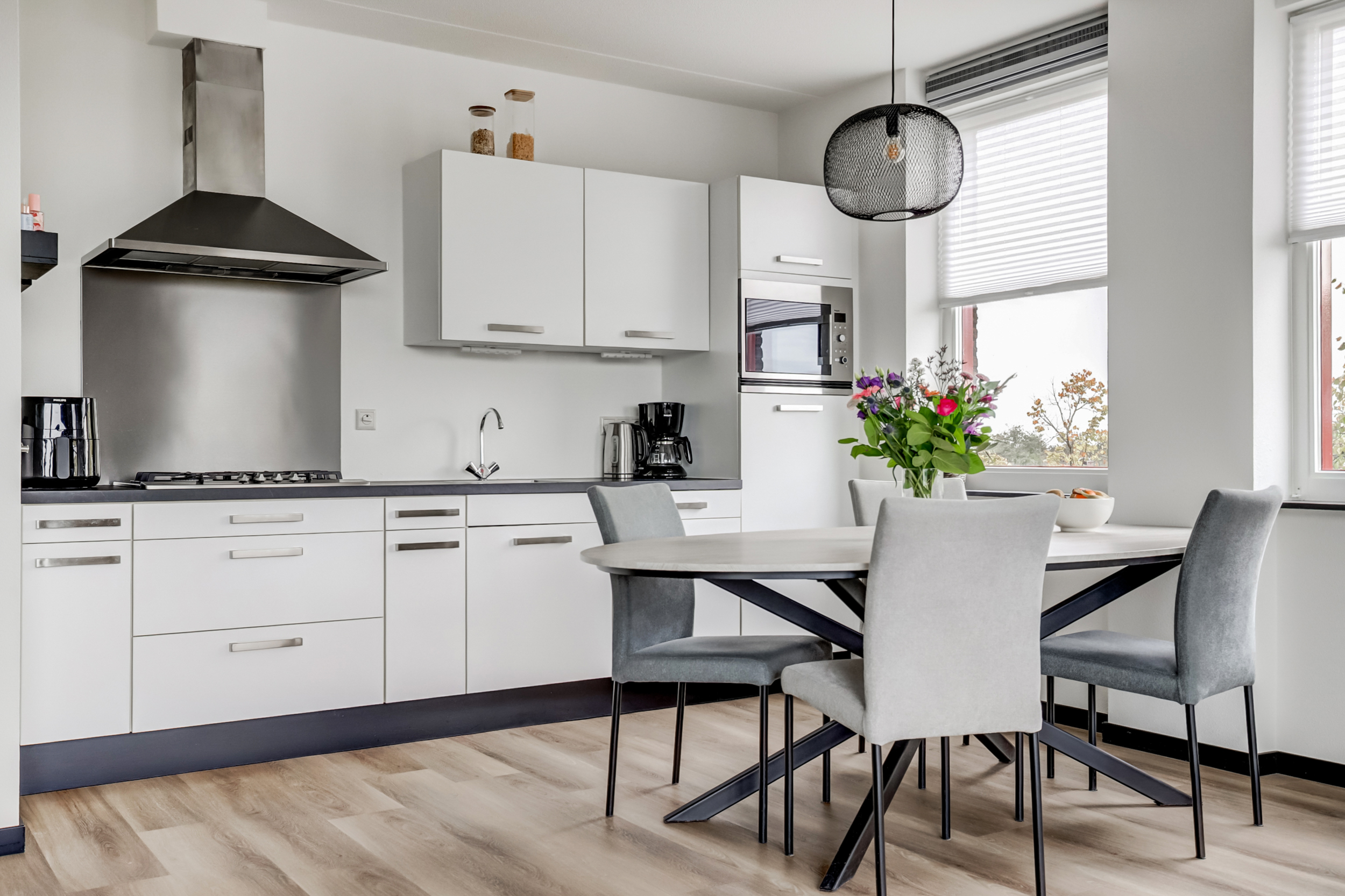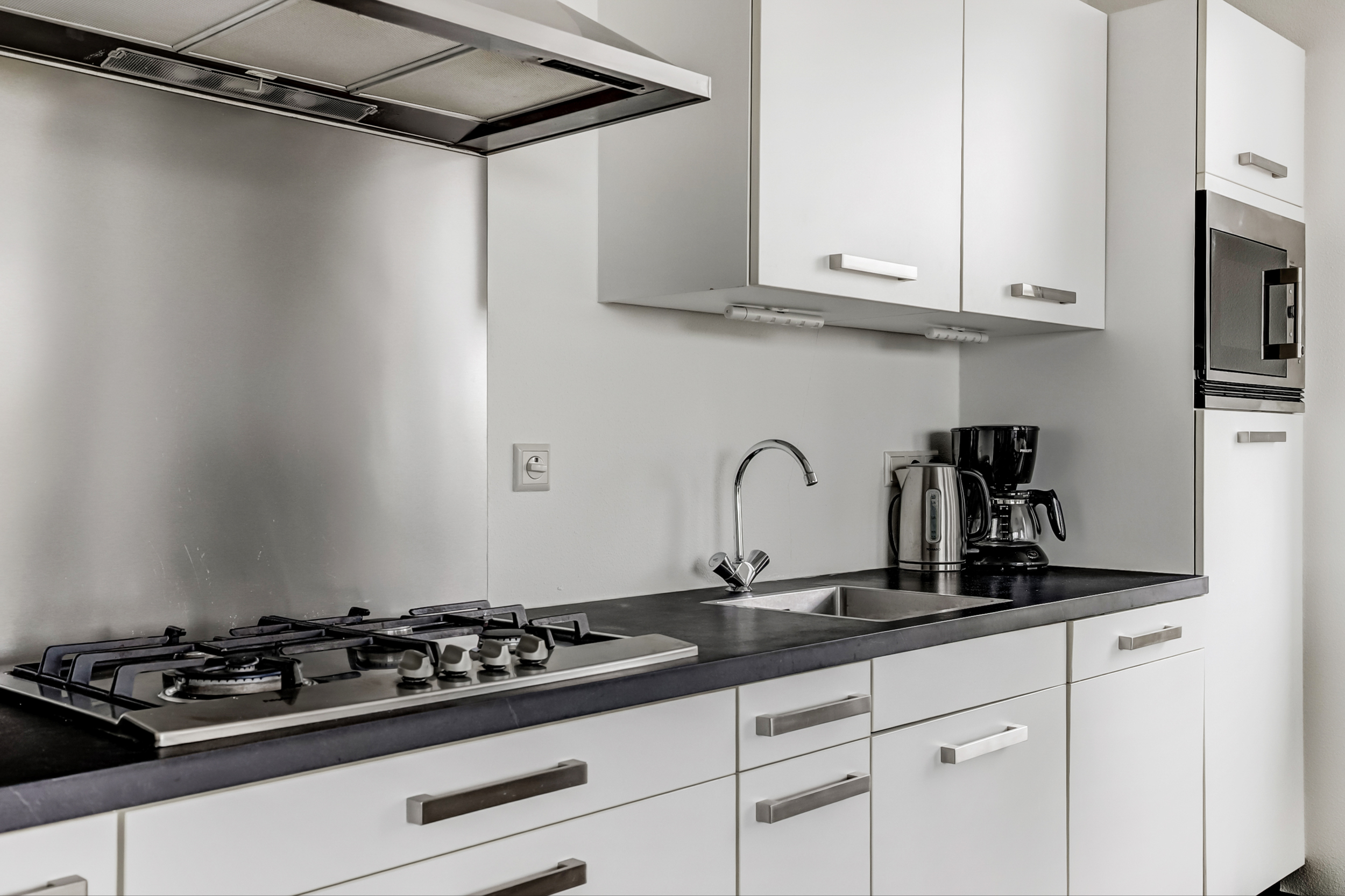 - de keuken is voorzien van de volgende apparatuur: combi-magnetron, vaatwasser, afzuigkap en gasfornuis