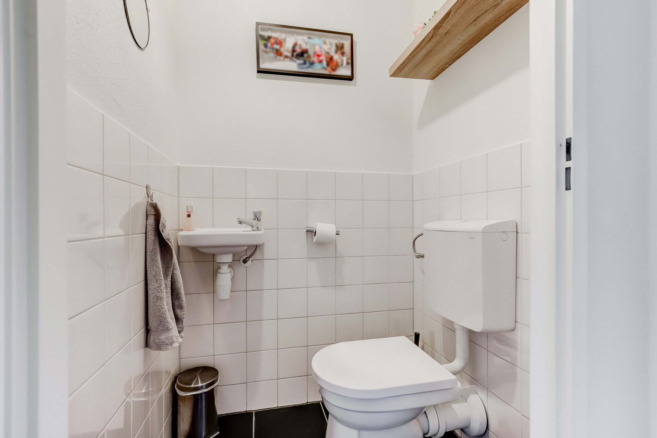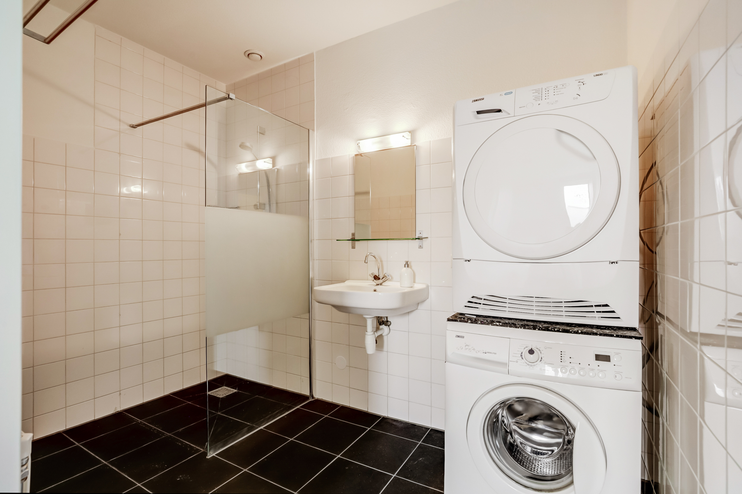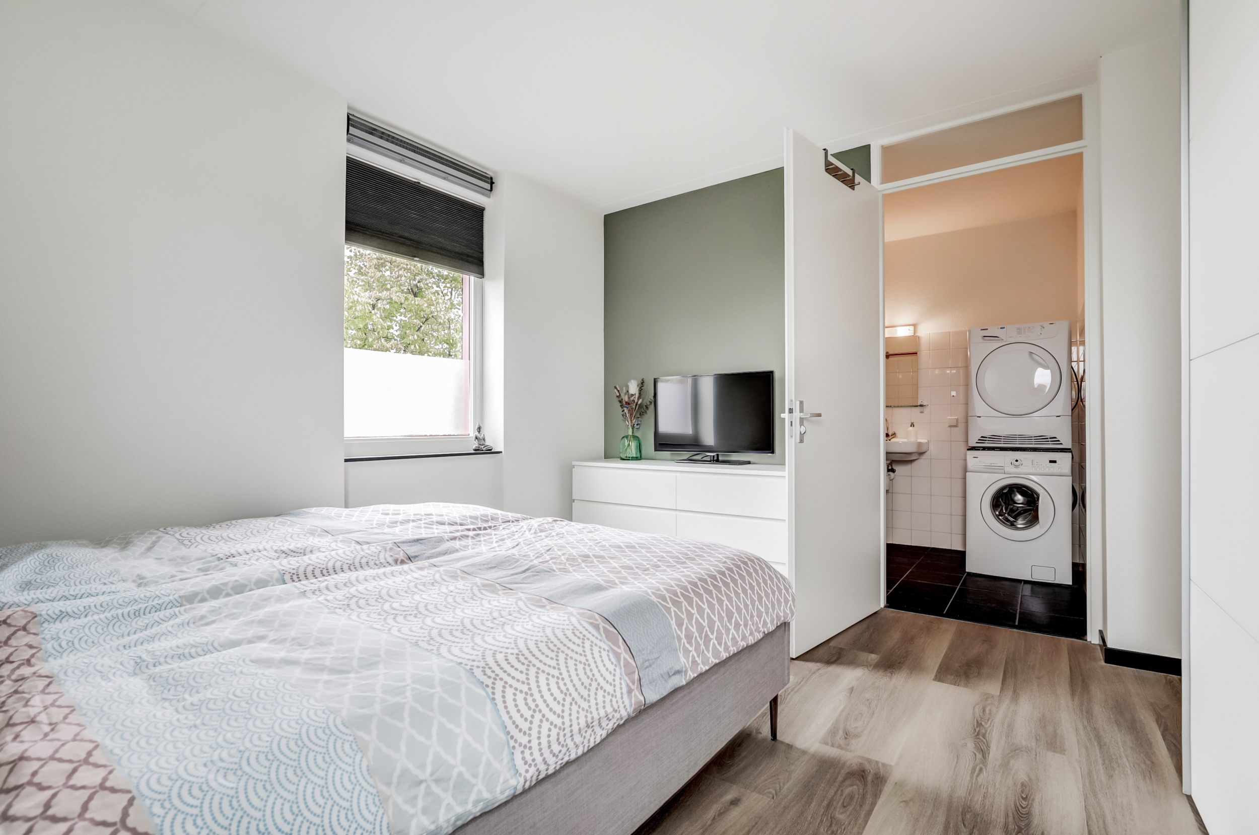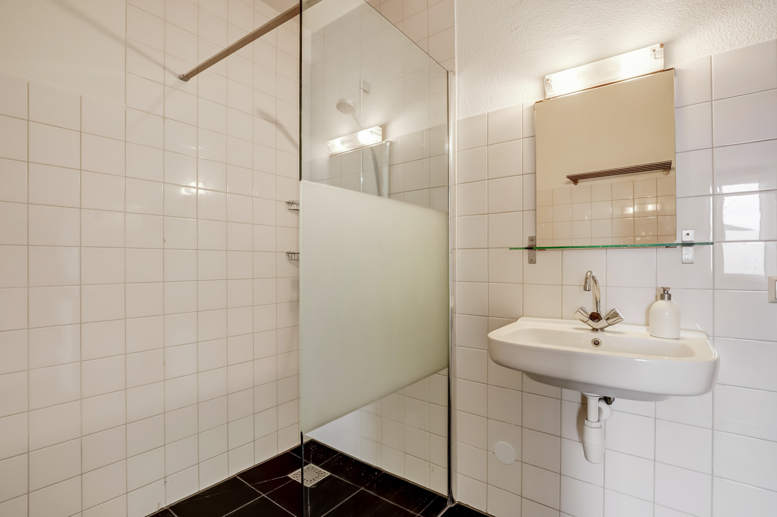 4e verdieping: entree/gang, toilet met wc en fonteintje, meterkast, berging met cv-ketel (2025). De ruime slaapkamer biedt toegang tot de moderne badkamer die is voorzien van een wastafel, een inloopdouche met glazen douchewand en de wasmachine-aansluiting.