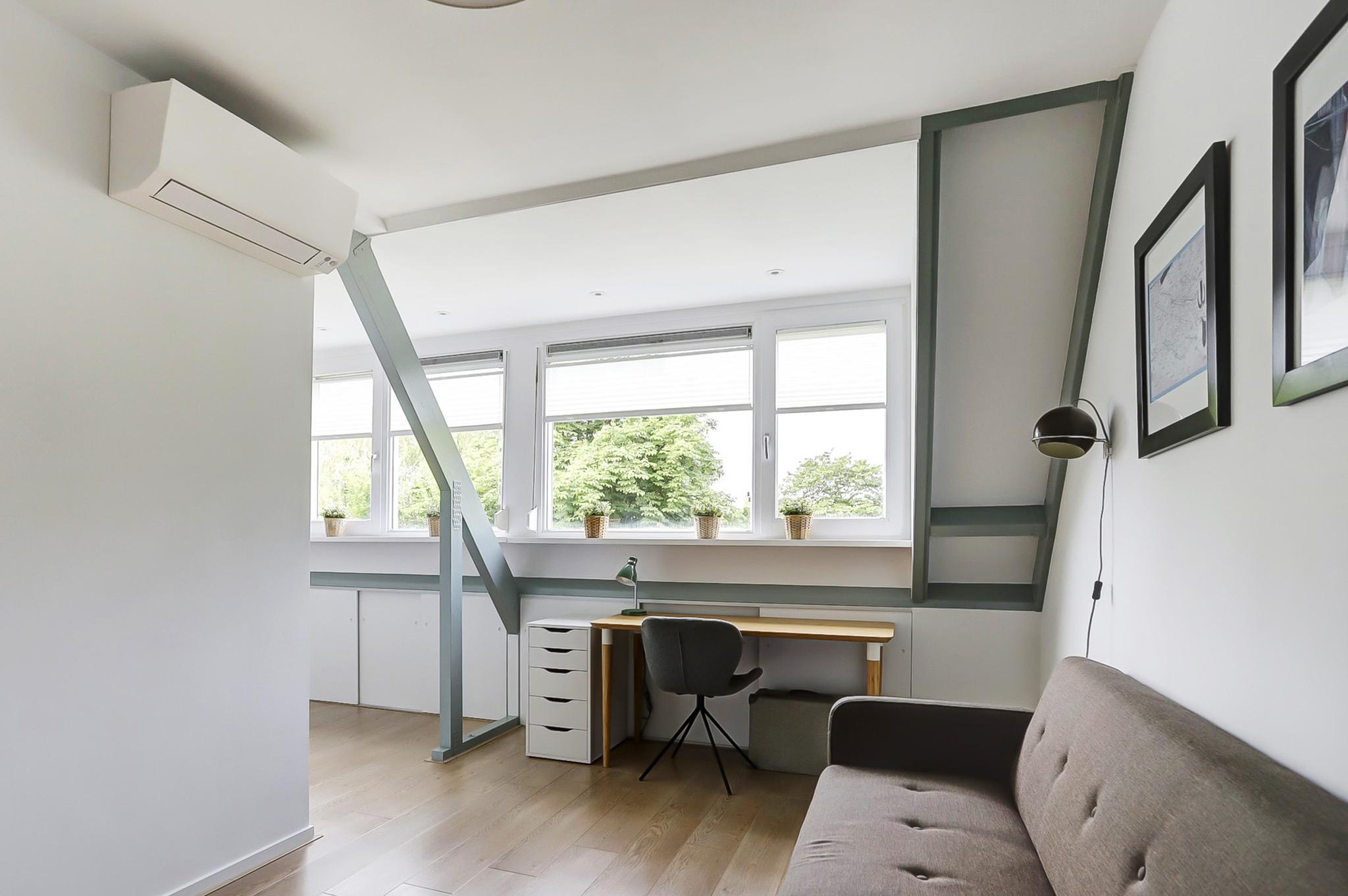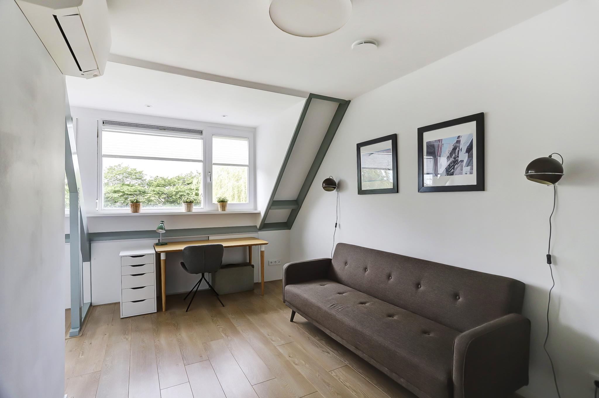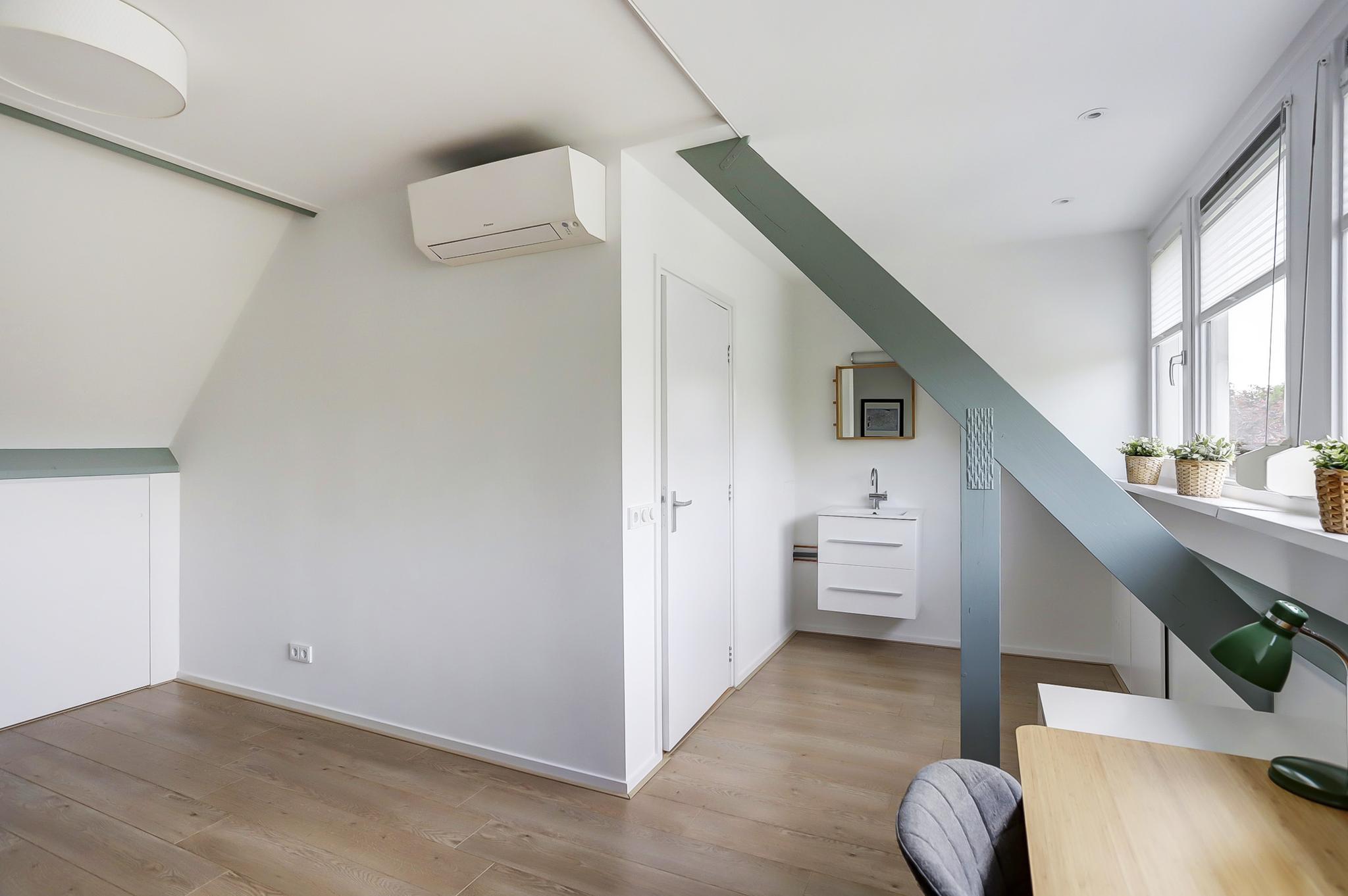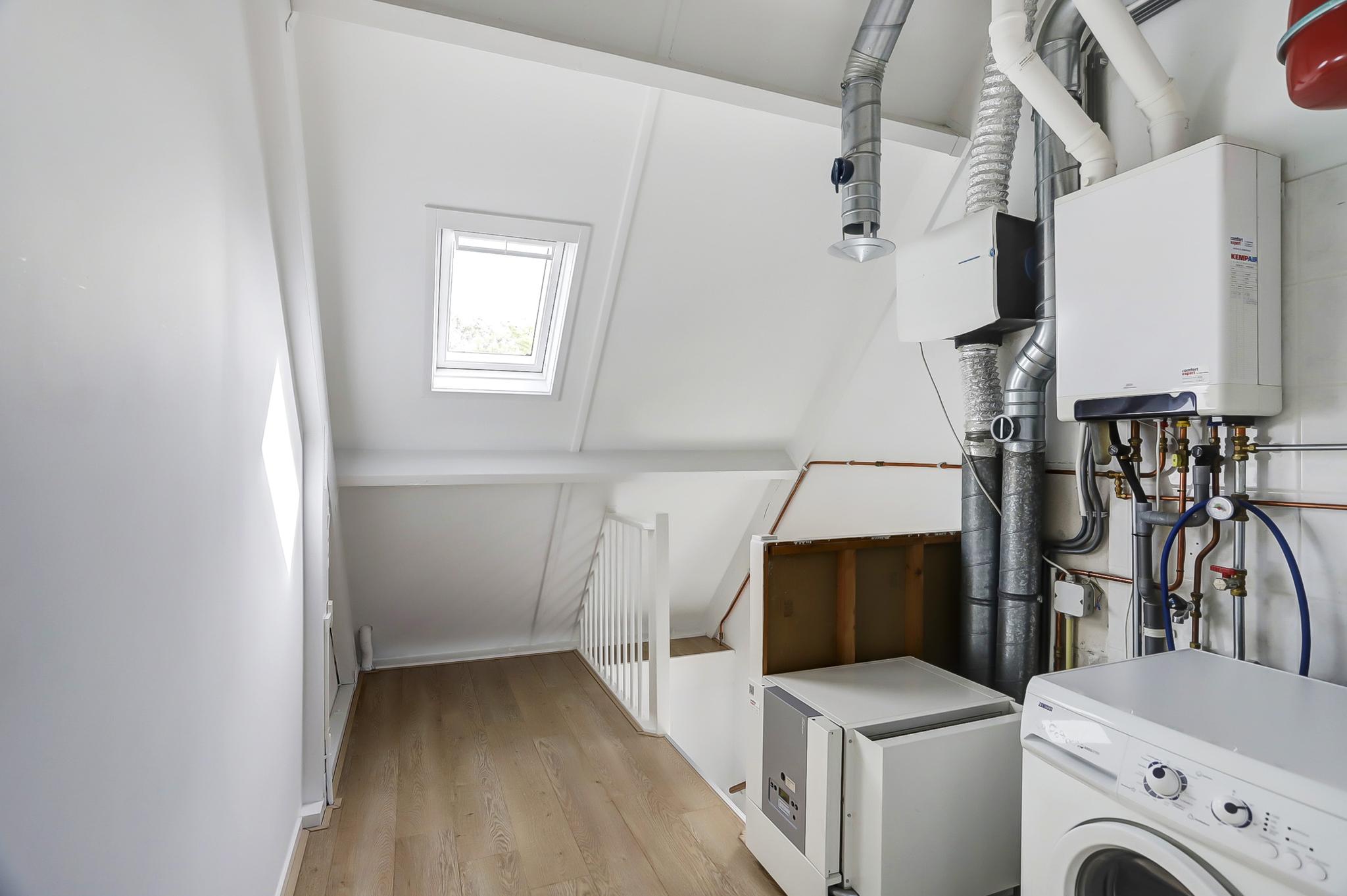 Tweede verdieping: voorzolder met cv-ketel (Brink heteluchtverwarming 2014 en Brink/Intergas HR 2014 voor het warme water) en wasmachine-aansluiting, uitgebouwde zolderkamer met airco.