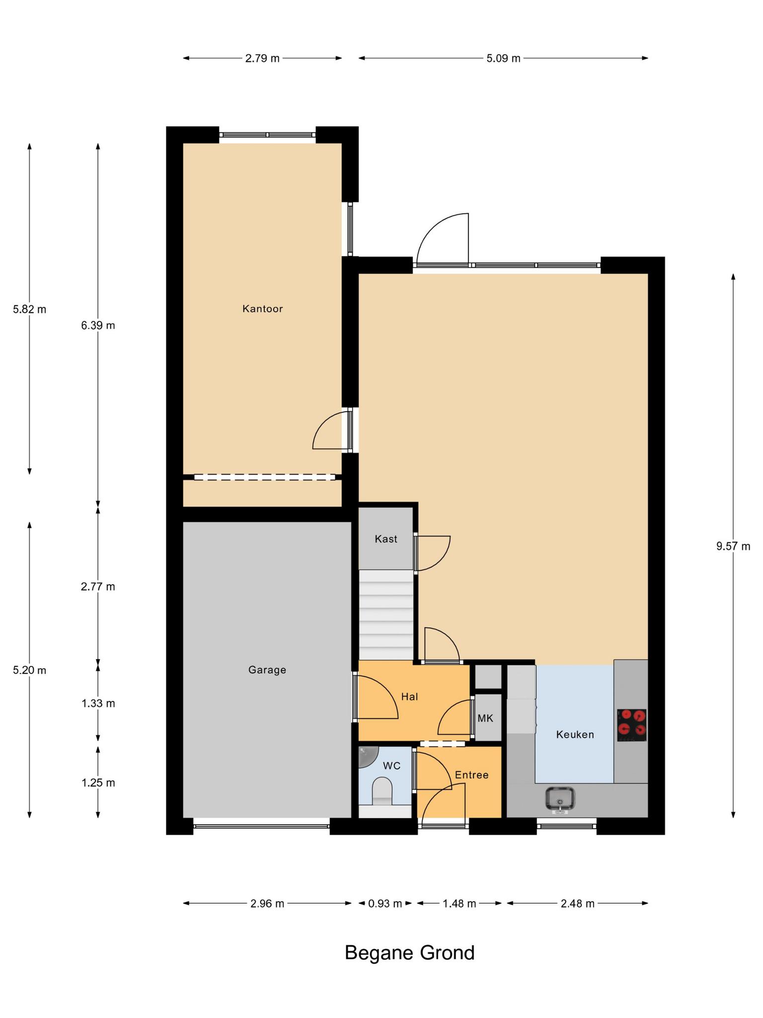 Begane grond: entree/gang, toilet (wandcloset met fonteintje), meterkast, deur naar garage, woonkamer met open keuken. De keuken is aan de voorzijde van de woning en is voorzien van alle benodigde inbouwapparatuur. Via de woonkamer is de werkkamer bereikbaar. De woonkamer is voorzien van een trapkast, een airco en een schuifpui naar de achtertuin. Deze ligt op het zuidwesten, is voorzien van een houten berging en grenst aan het water.