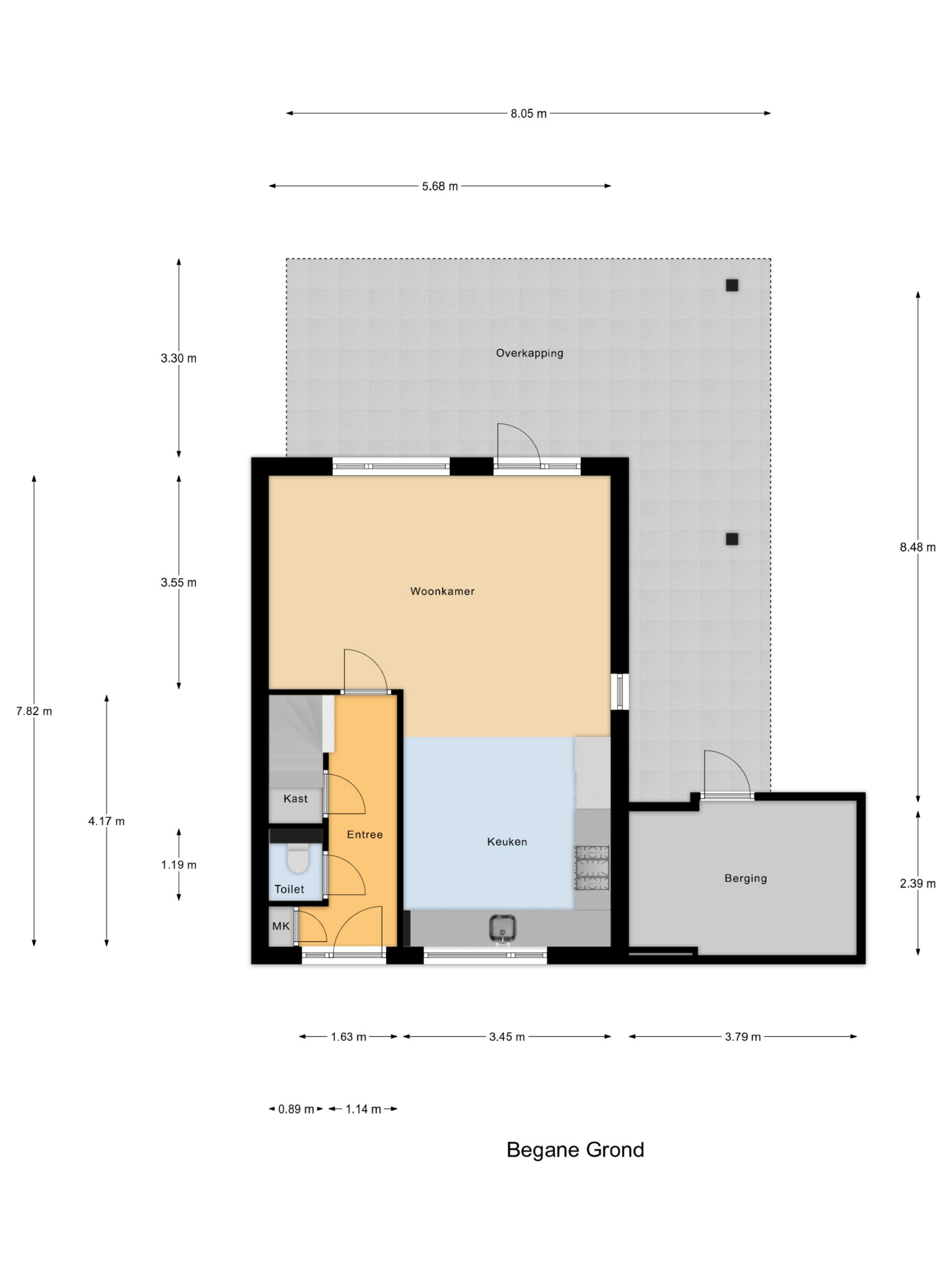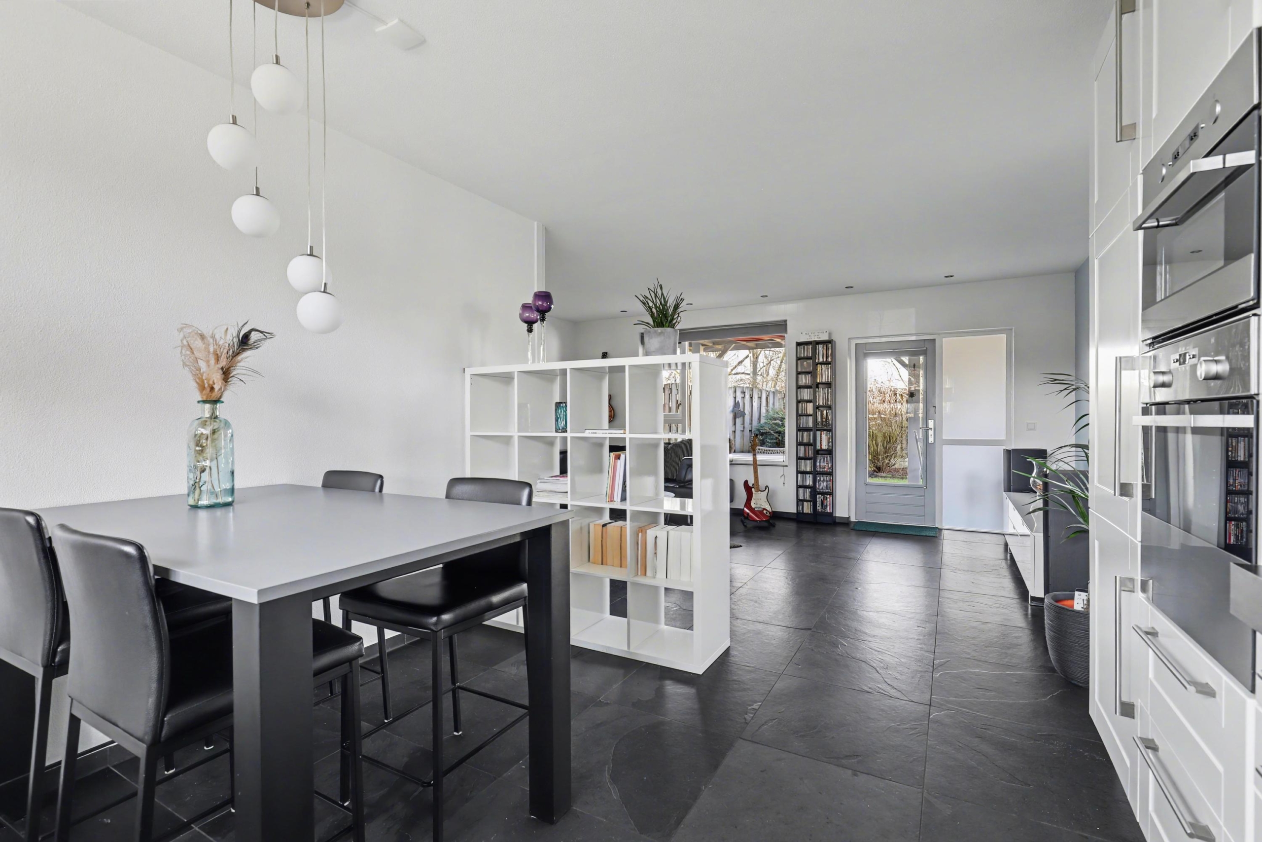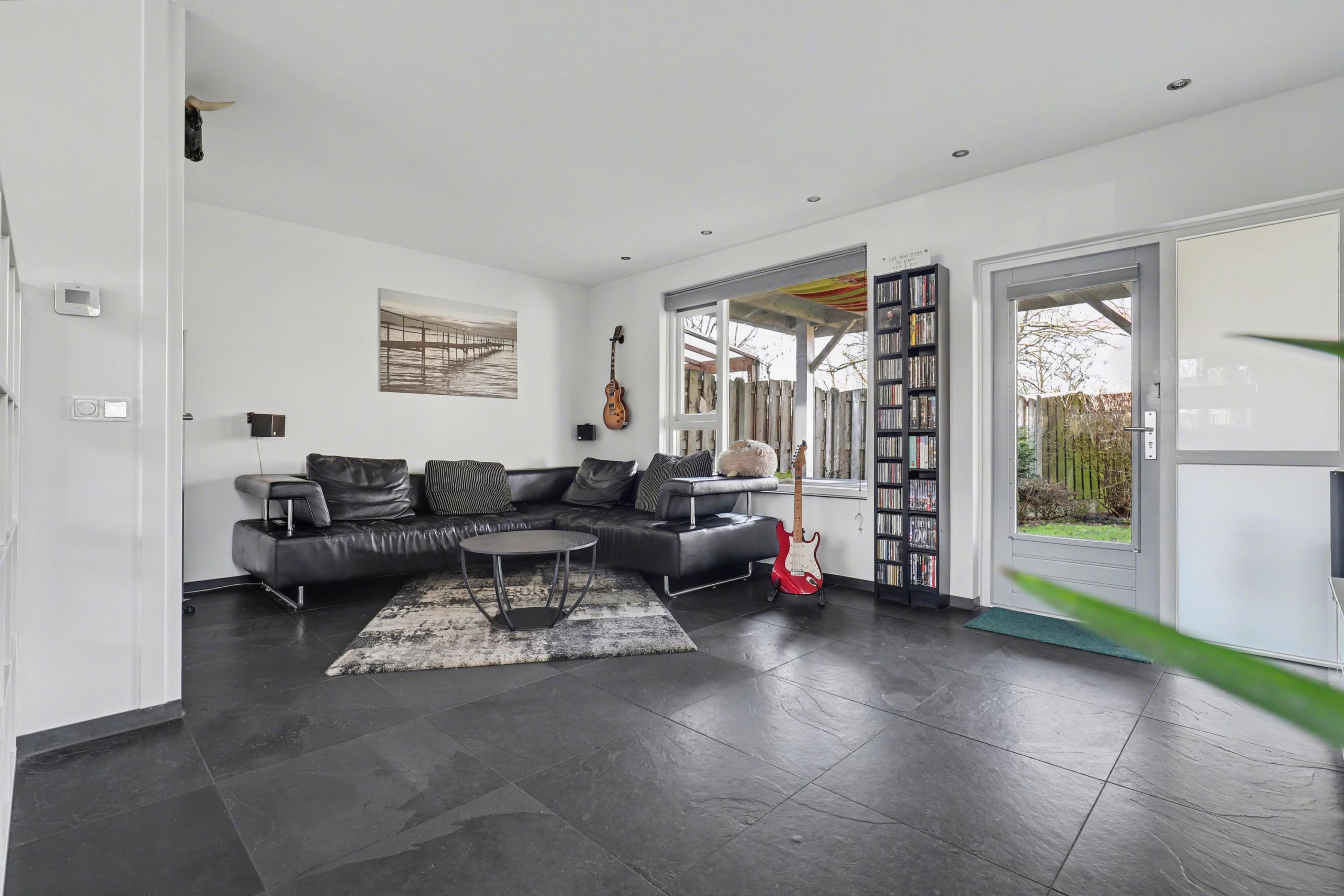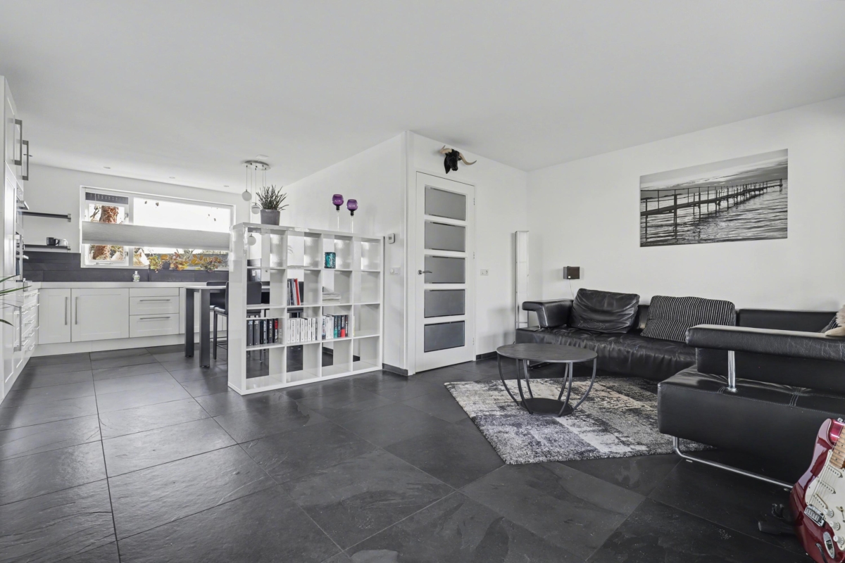 Begane grond: entree/gang, meterkast, toilet, trapkast met de nodige bergruimte. De moderne open keuken zit aan de voorzijde van de woning en heeft naast veel kastruimte ook diverse inbouwapparatuur. De woonkamer biedt een mooi, vrij uitzicht over de ruime tuin. De begane grond is voorzien van een plavuizenvloer die is voorzien van vloerverwarming.