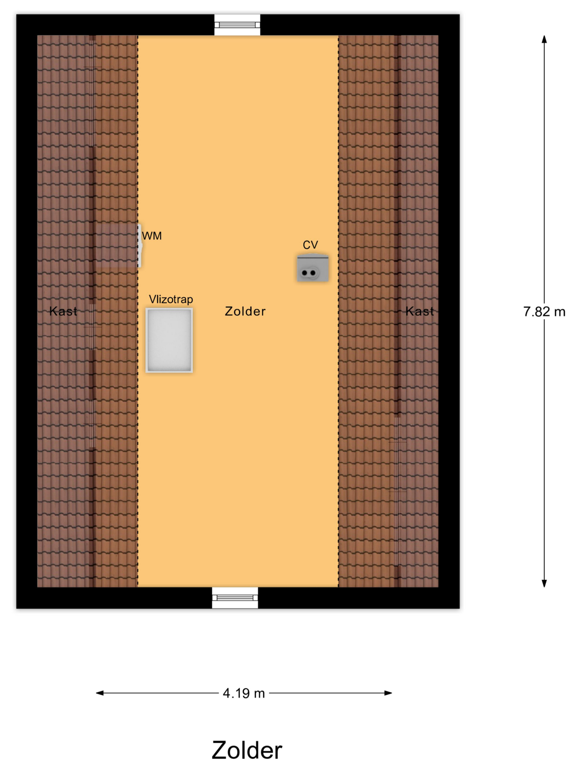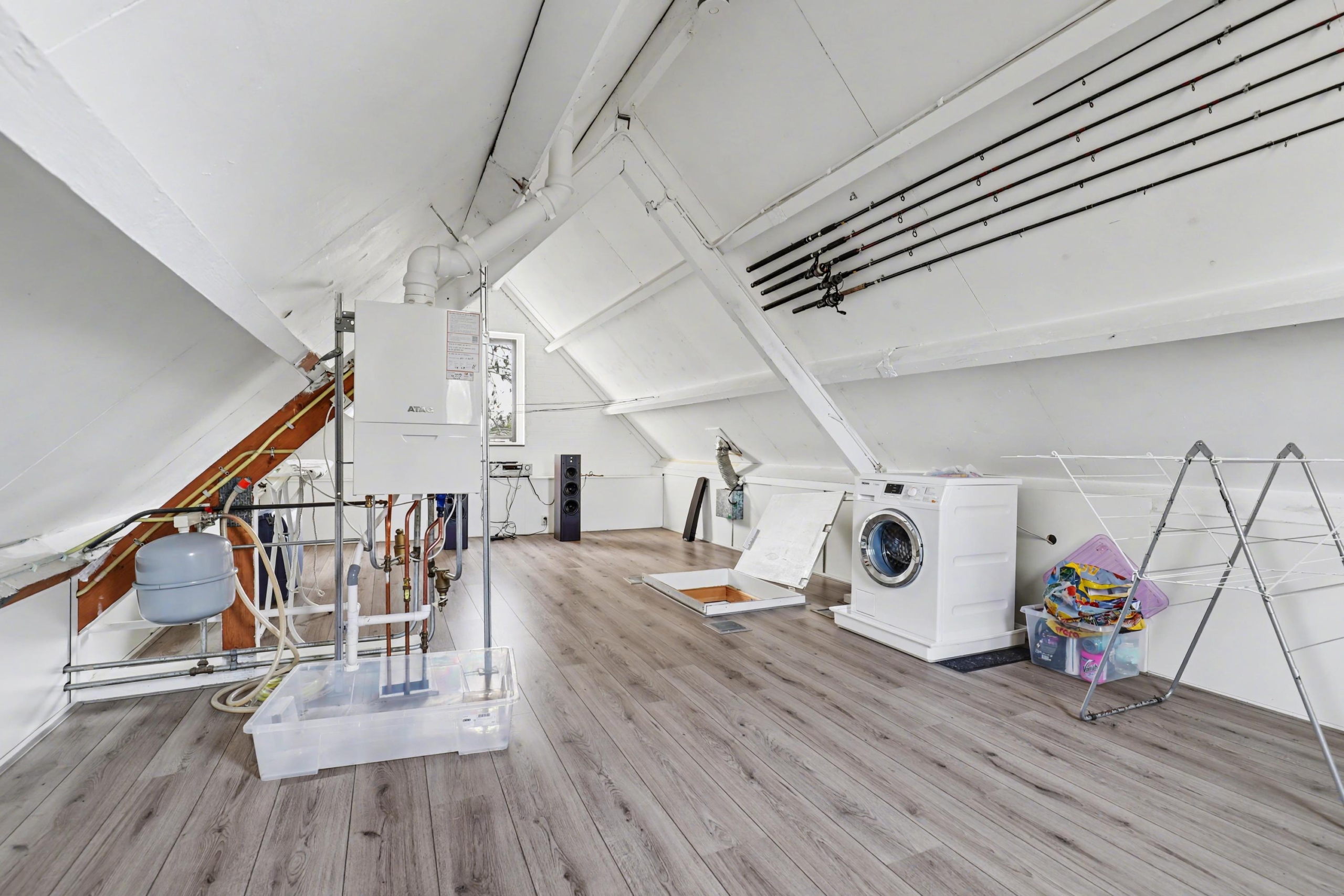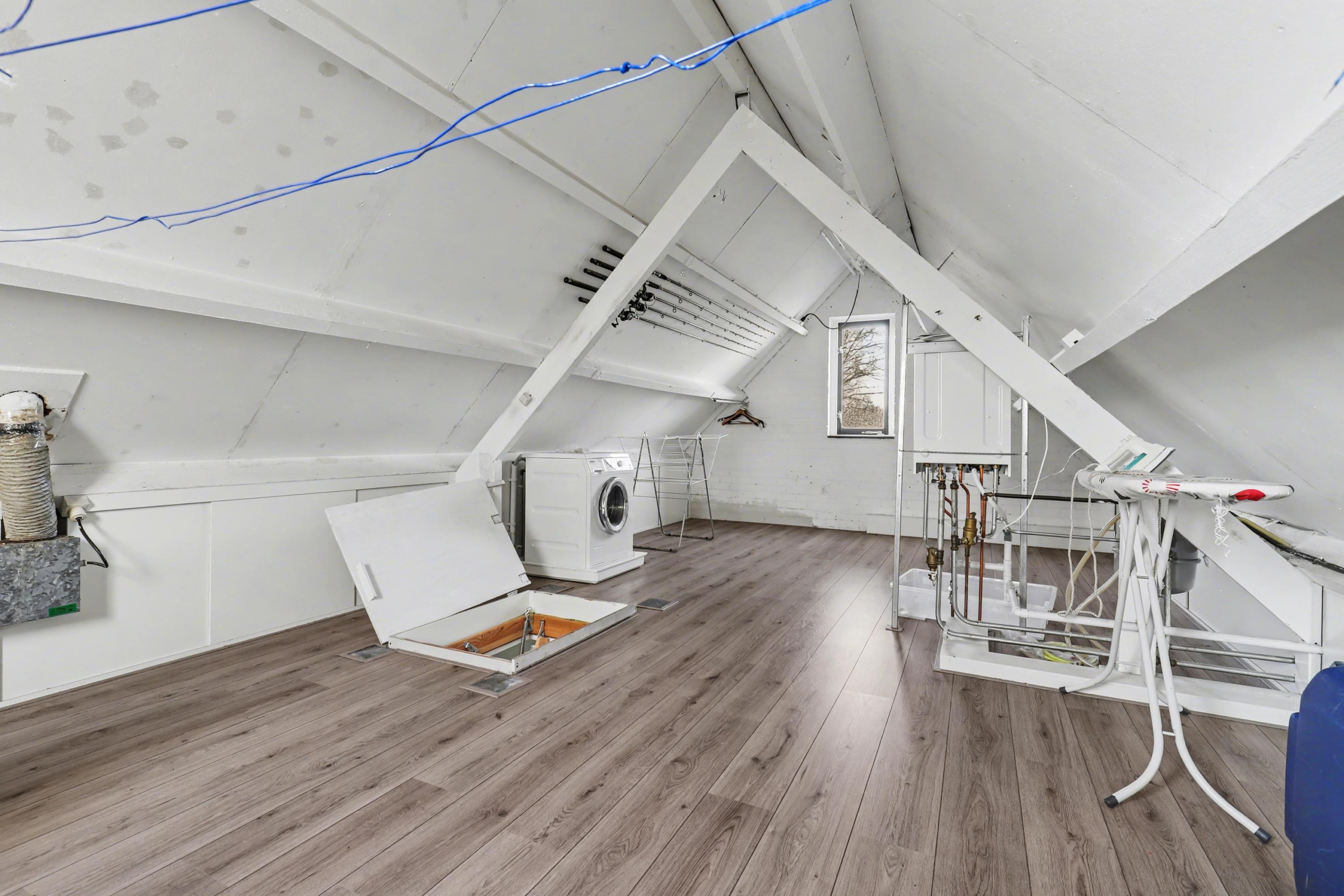 Tweede verdieping: via een vlizotrap bereik je de zolderverdieping. Hier staat momenteel de wasmachine en hangt de cv-ketel. Op deze woonlaag heb je de mogelijkheid om 2 slaapkamers te realiseren.