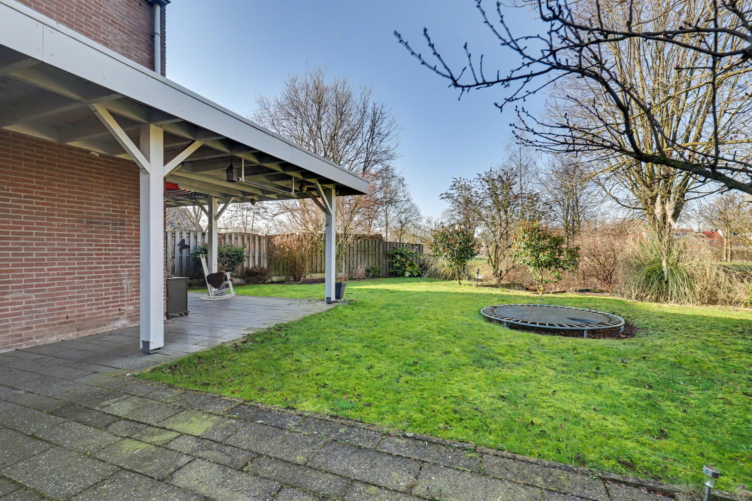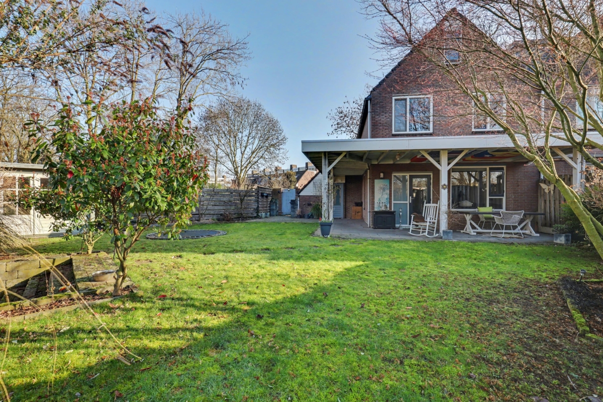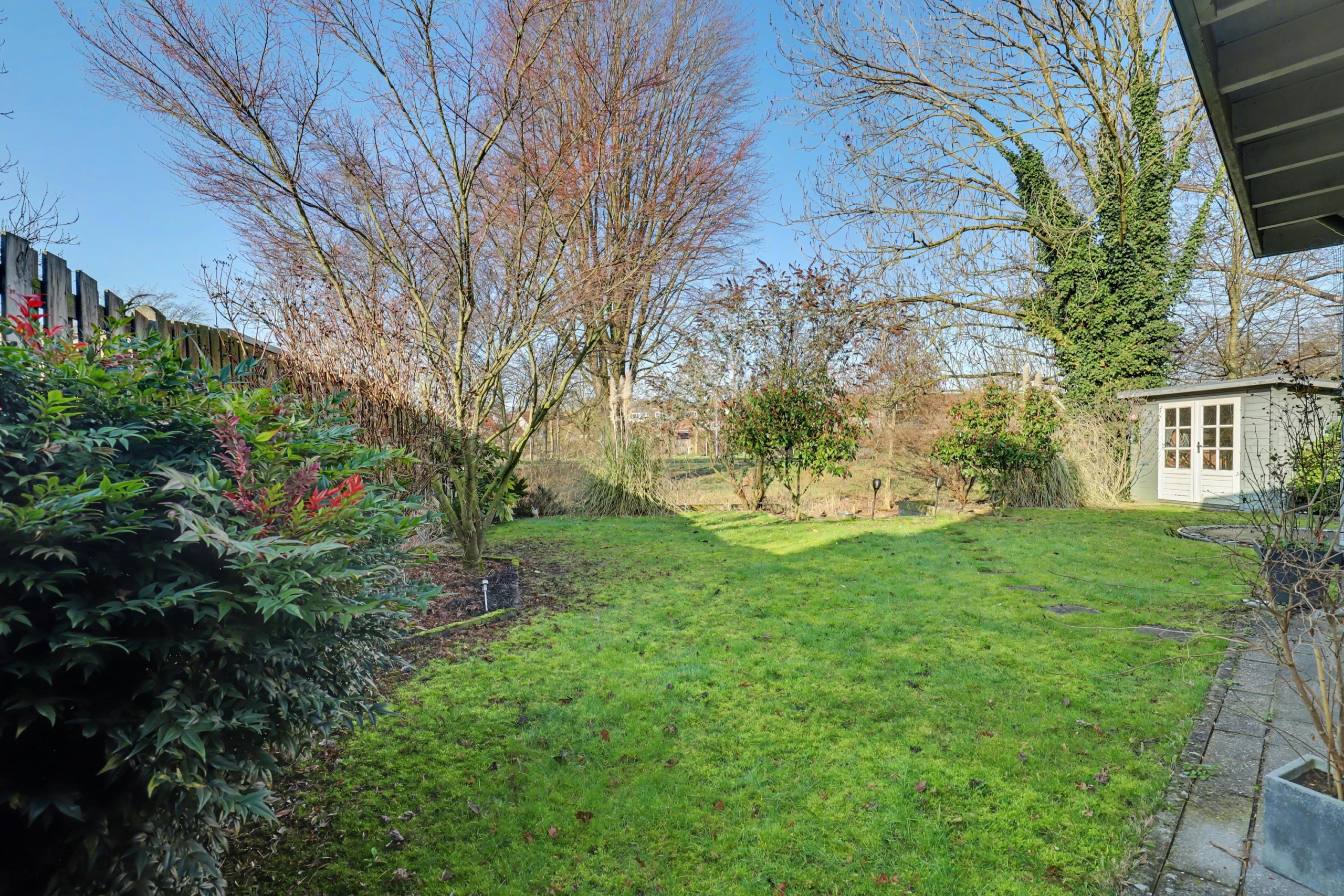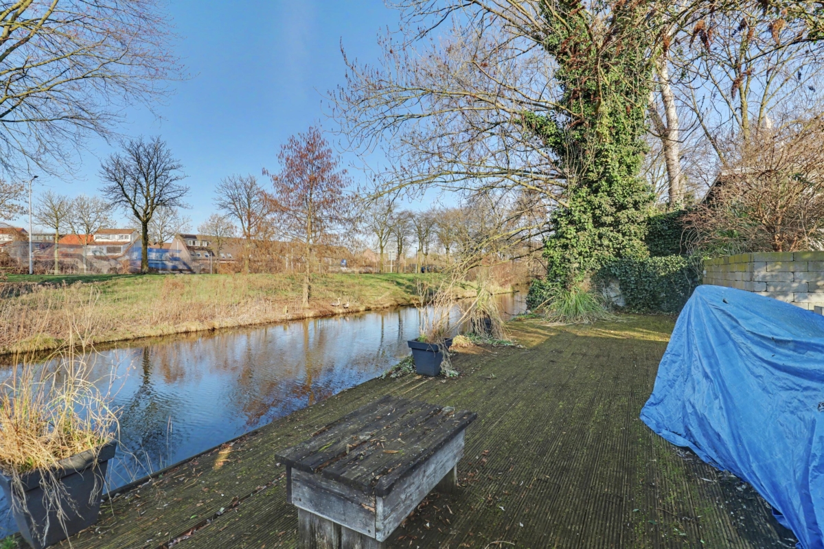 De tuin ligt op het westen en is grofweg 15x15 meter. Aan de woning is een fraaie overkapping gebouwd zodat je hier heerlijk op warme dagen in de schaduw kunt zitten. Verder is de tuin voorzien van een tuinhuis én een stenen berging en is er een achterom. De tuin grenst aan de achterzijde aan water.