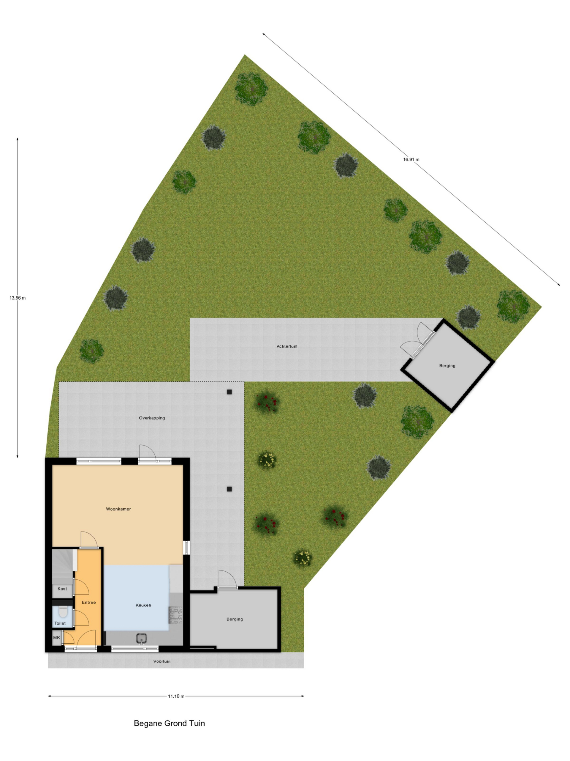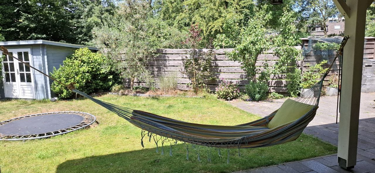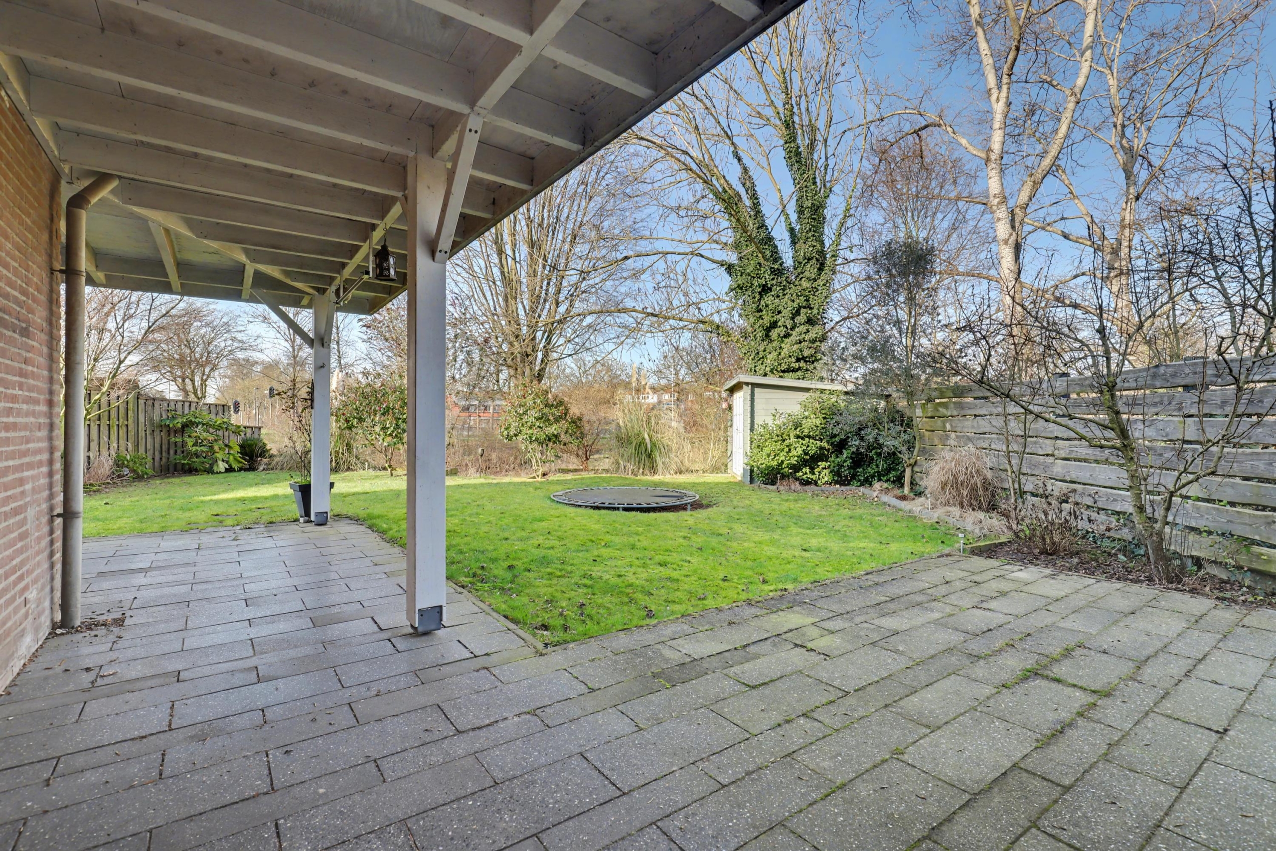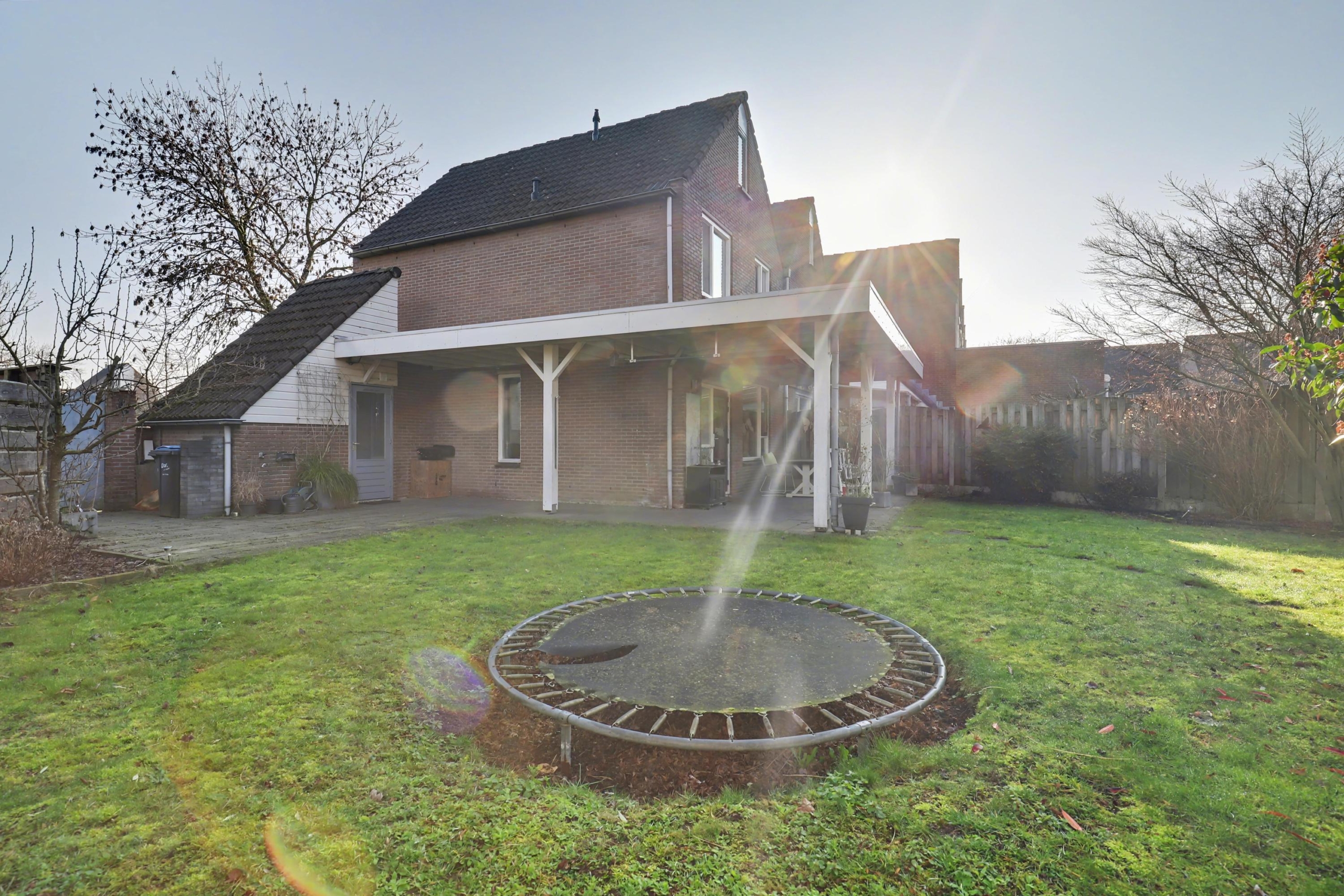De tuin ligt op het westen en is grofweg 15x15 meter. Aan de woning is een fraaie overkapping gebouwd zodat je hier heerlijk op warme dagen in de schaduw kunt zitten. Verder is de tuin voorzien van een tuinhuis én een stenen berging en is er een achterom. De tuin grenst aan de achterzijde aan water.