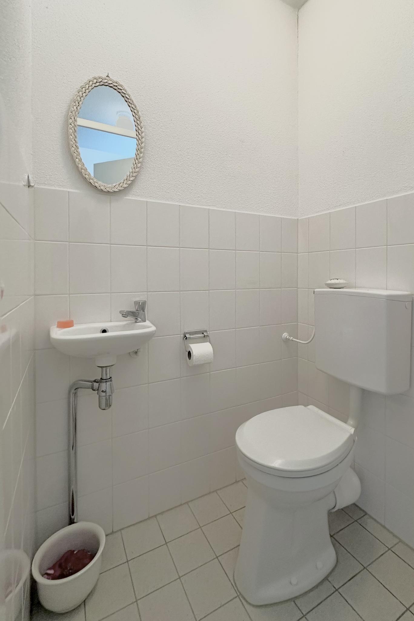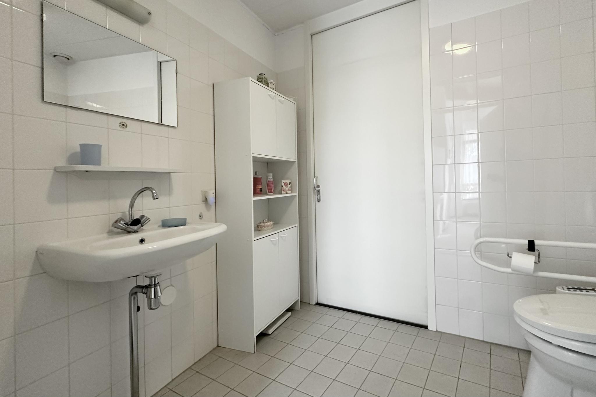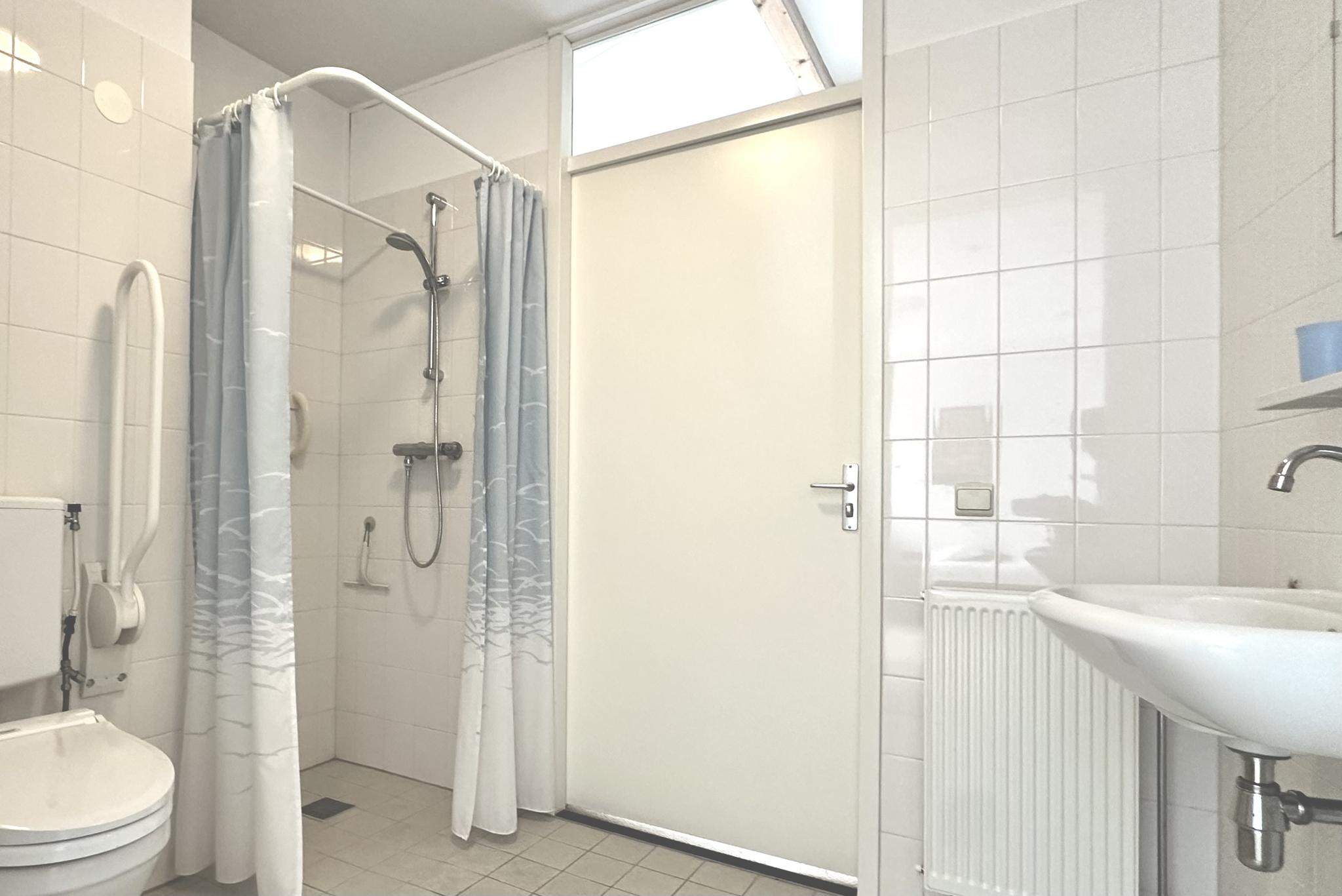 De woning heeft verder twee slaapkamers die beide toegang geven tot een ruime badkamer. Deze is voorzien van licht tegelwerk en een douche, wastafel en toilet.