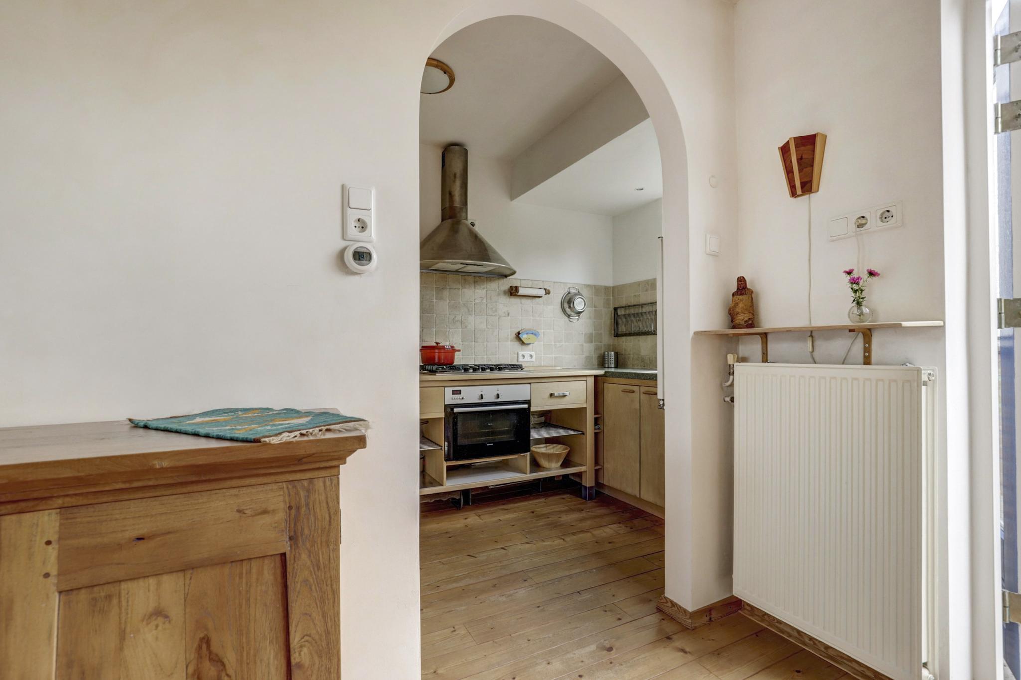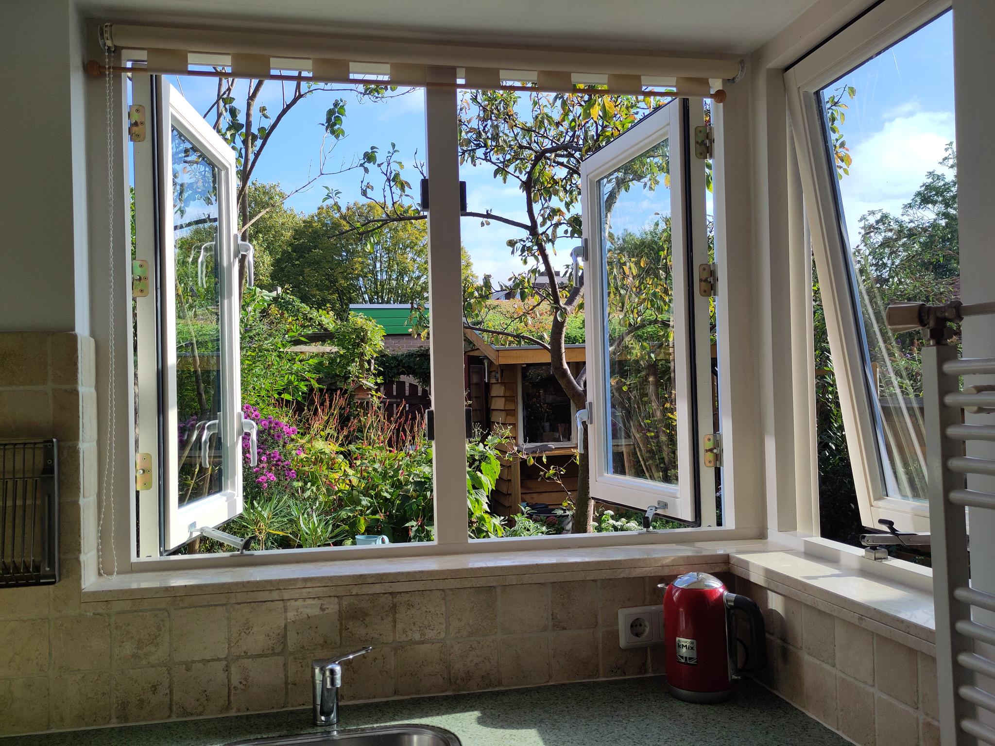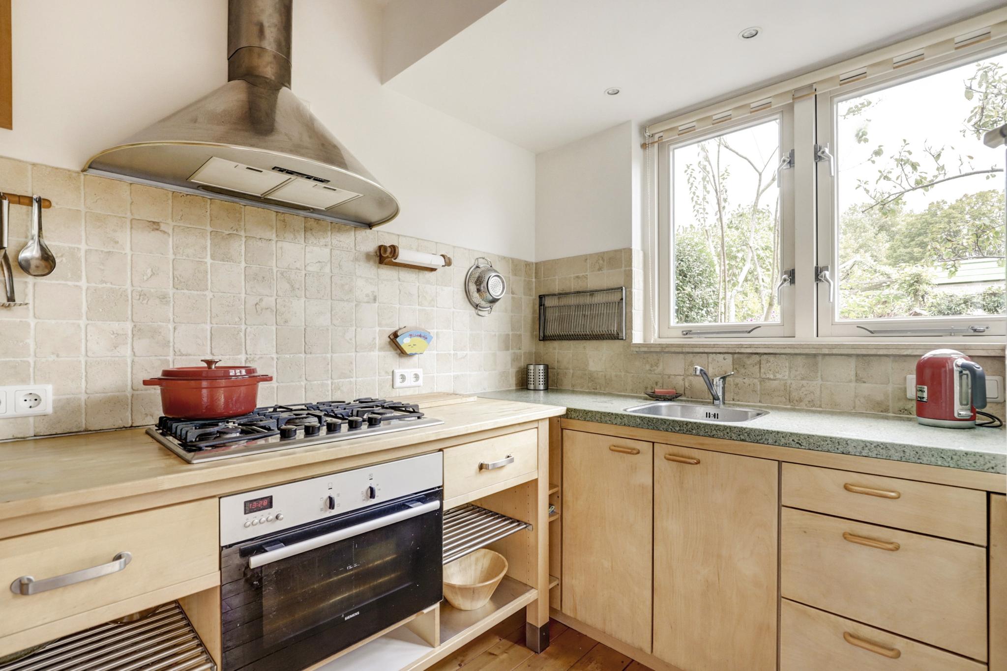 Begane grond: entree, hal, toegang tot een zeer praktische kelder, toilet, doorzonwoonkamer met zowel aan de voor- als achterzijde een vrij uitzicht. De open keuken heeft een keurige inrichting inclusief diverse inbouwapparatuur. Vanuit de woonkamer is via de dubbele deuren de fraai aangelegde en groene achtertuin te bereiken. Deze ligt op het noordoosten en is voorzien van een houten berging en een achterom. In de zomer is er zon van de vroege morgen tot in de late avond.