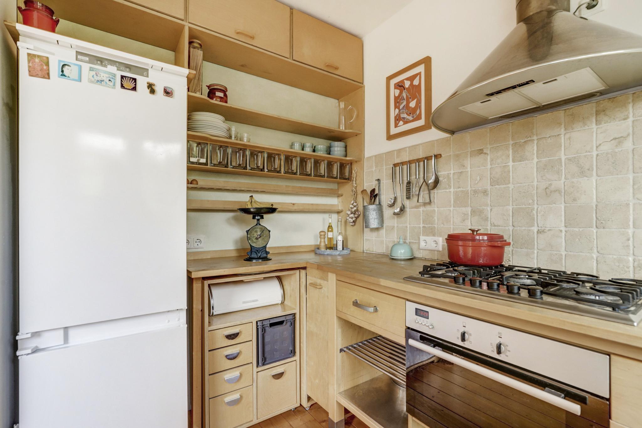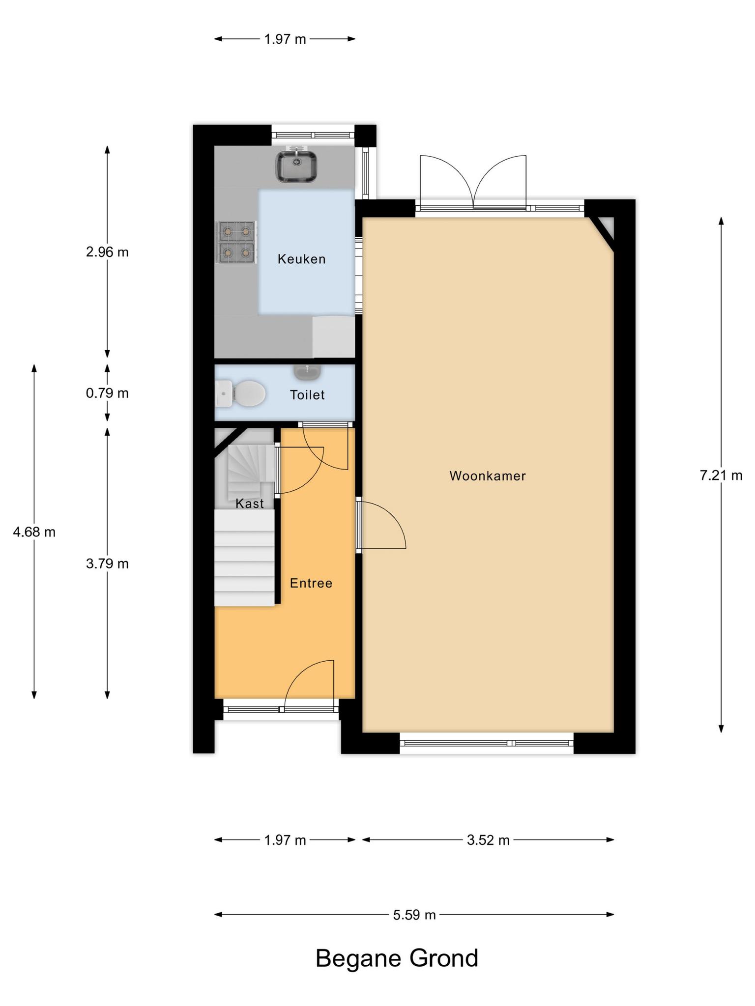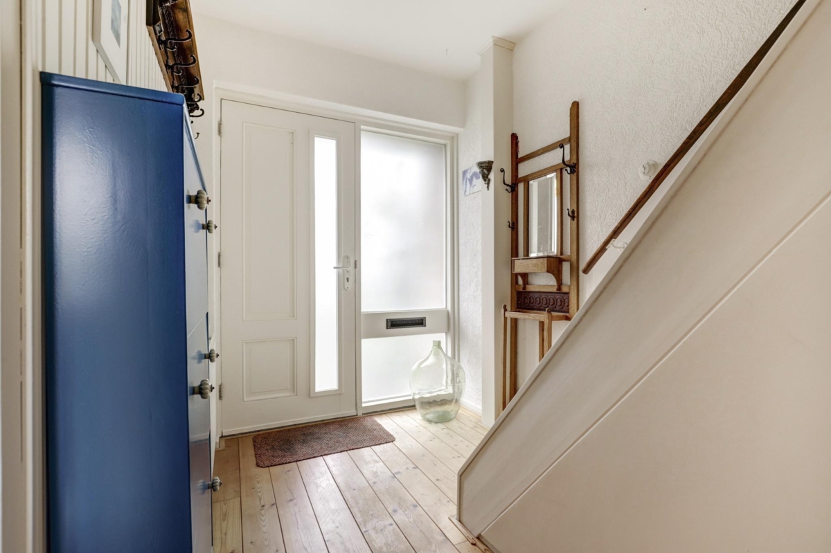 Begane grond: entree, hal, toegang tot een zeer praktische kelder, toilet, doorzonwoonkamer met zowel aan de voor- als achterzijde een vrij uitzicht. De open keuken heeft een keurige inrichting inclusief diverse inbouwapparatuur. Vanuit de woonkamer is via de dubbele deuren de fraai aangelegde en groene achtertuin te bereiken. Deze ligt op het noordoosten en is voorzien van een houten berging en een achterom. In de zomer is er zon van de vroege morgen tot in de late avond.