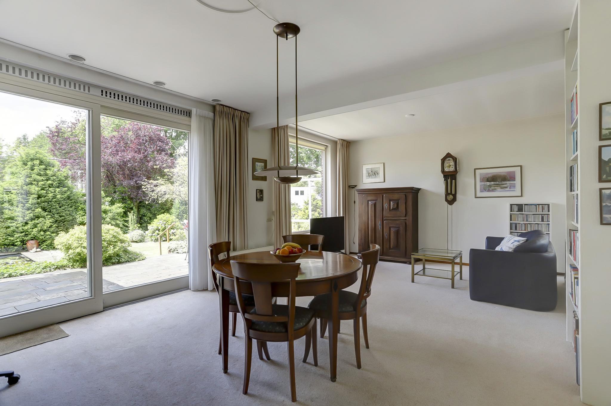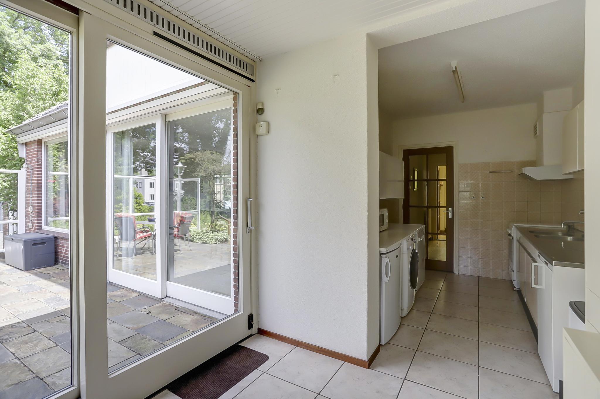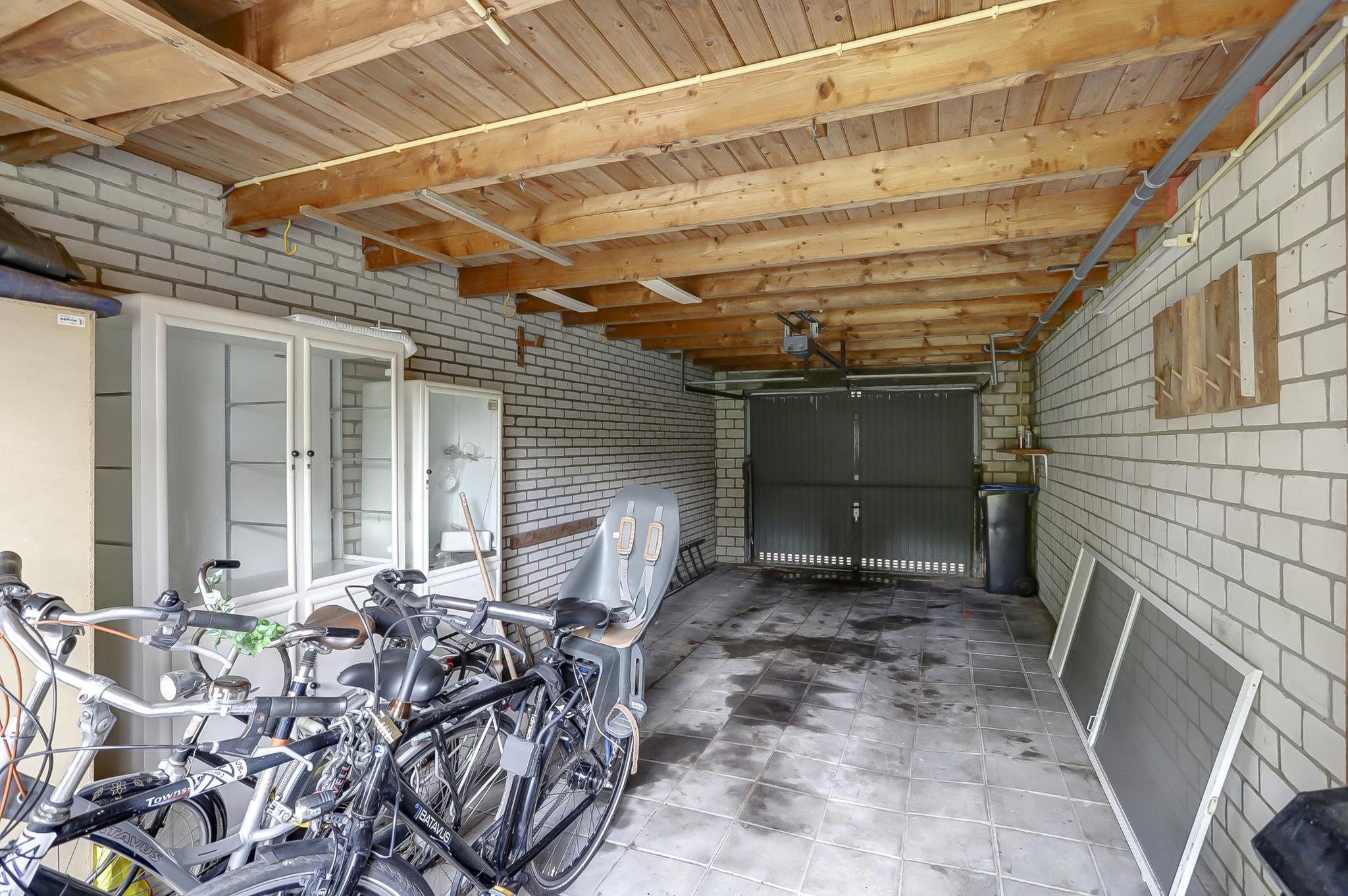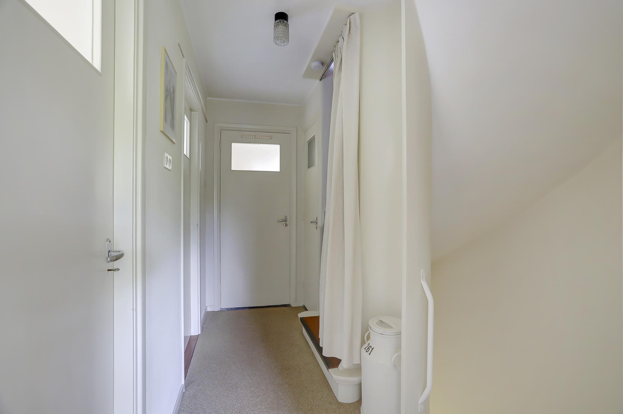 Begane grond: entree, vestibule, gang met toilet en deur naar de kelder. De gesloten keuken is voorzien van een eenvoudige keukeninrichting en is aan de achterzijde in 1971 uitgebouwd. Deze uitbouw geeft toegang tot de achtertuin. De woonkamer is royaal bemeten door een naderhand geplaatste uitbouw (eveneens 1971) aan de zijkant. Middels een schuifpui betreed je de op het zuidwesten gelegen achtertuin. Deze is voorzien van een stenen berging en een stenen garage die is voorzien van een elektrische kanteldeur. Voor de garage is nog een eigen oprit.