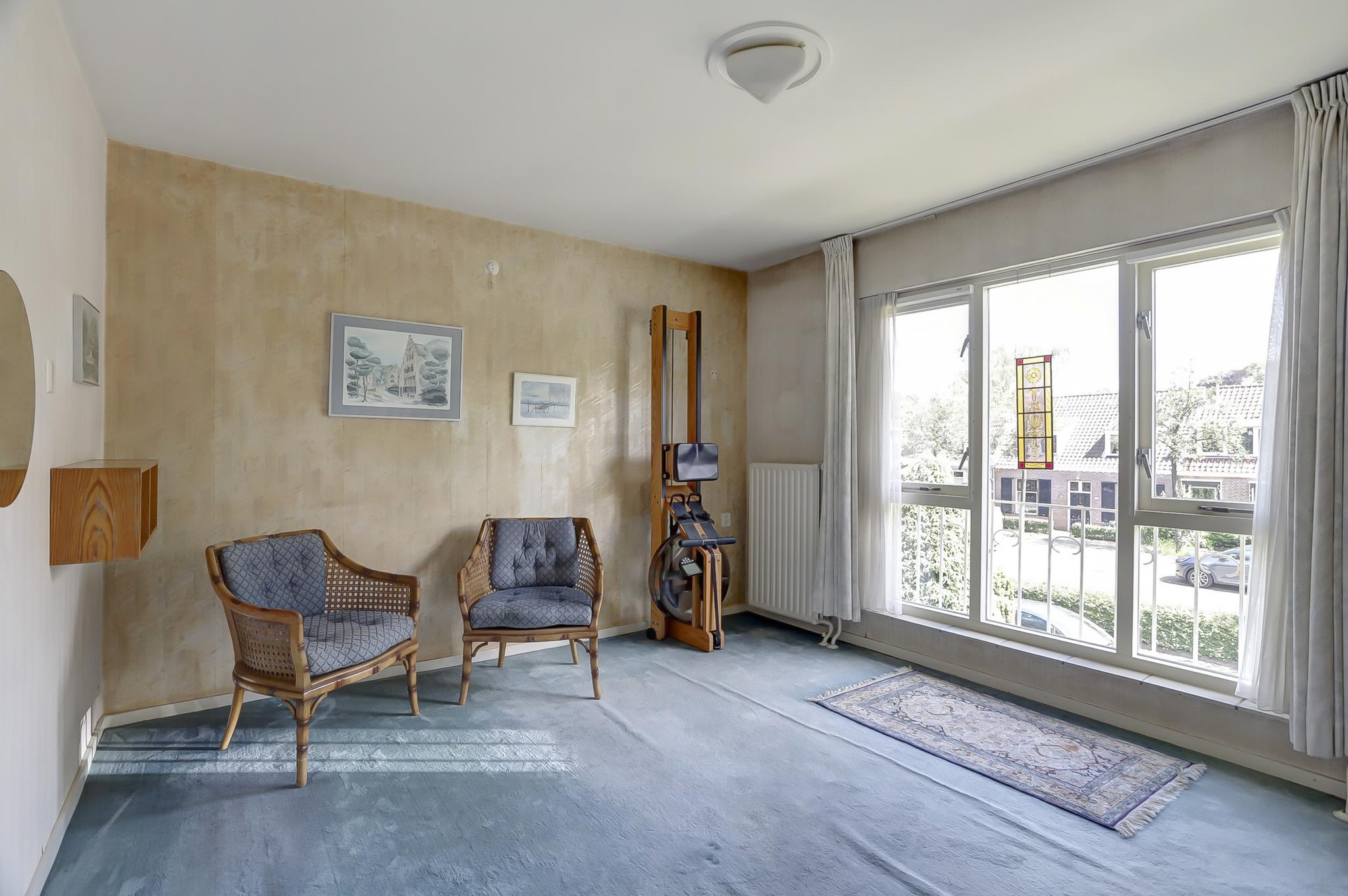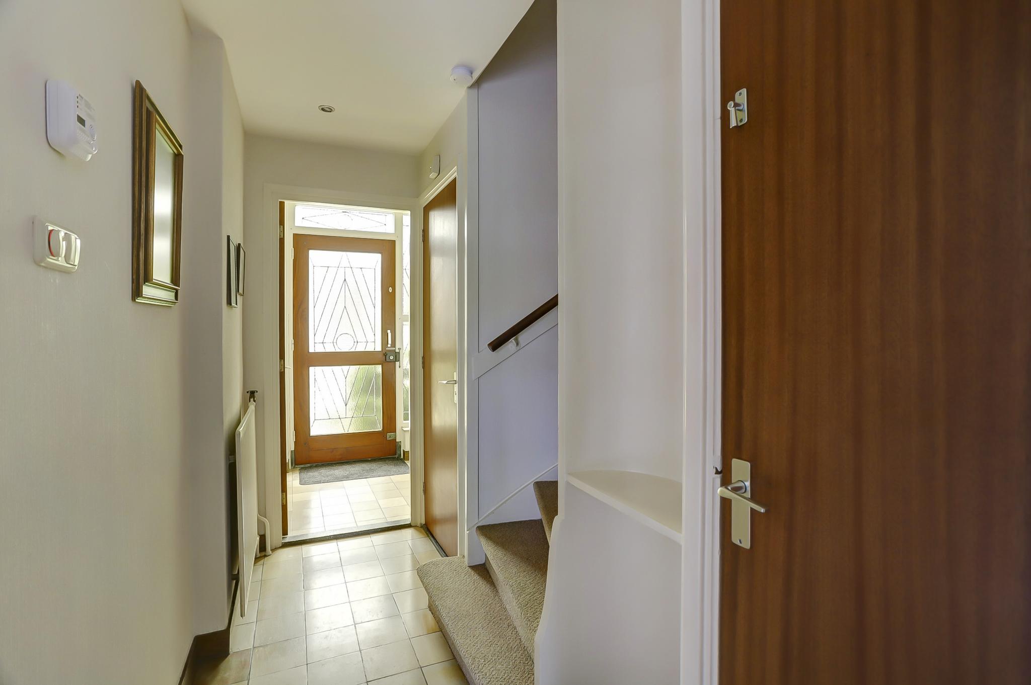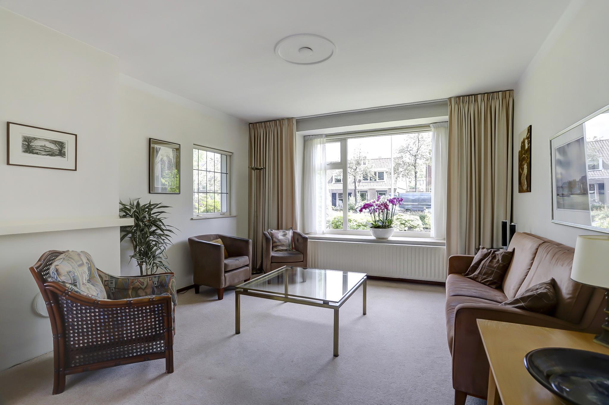 Begane grond: entree, vestibule, gang met toilet en deur naar de kelder. De gesloten keuken is voorzien van een eenvoudige keukeninrichting en is aan de achterzijde in 1971 uitgebouwd. Deze uitbouw geeft toegang tot de achtertuin. De woonkamer is royaal bemeten door een naderhand geplaatste uitbouw (eveneens 1971) aan de zijkant. Middels een schuifpui betreed je de op het zuidwesten gelegen achtertuin. Deze is voorzien van een stenen berging en een stenen garage die is voorzien van een elektrische kanteldeur. Voor de garage is nog een eigen oprit.