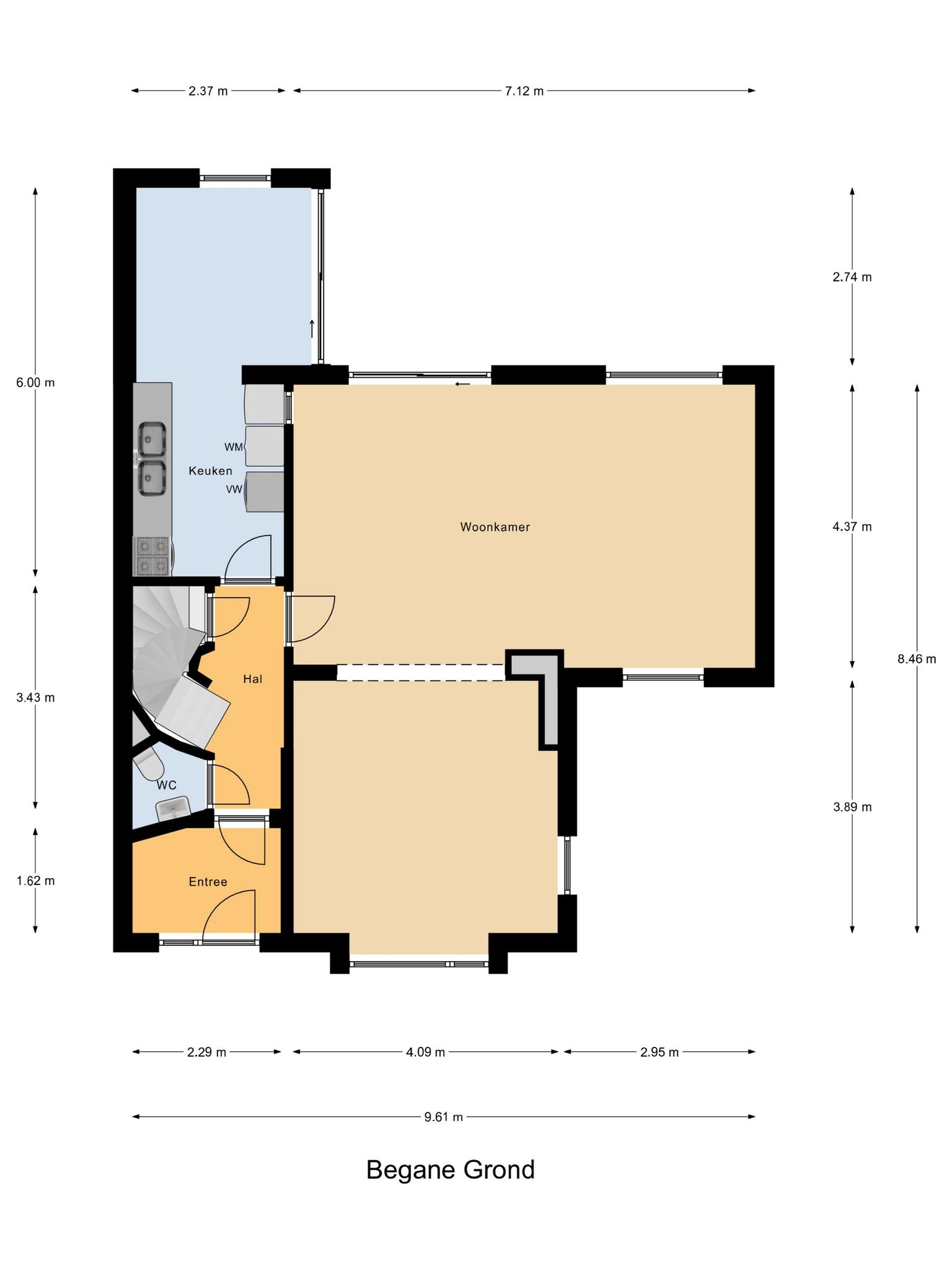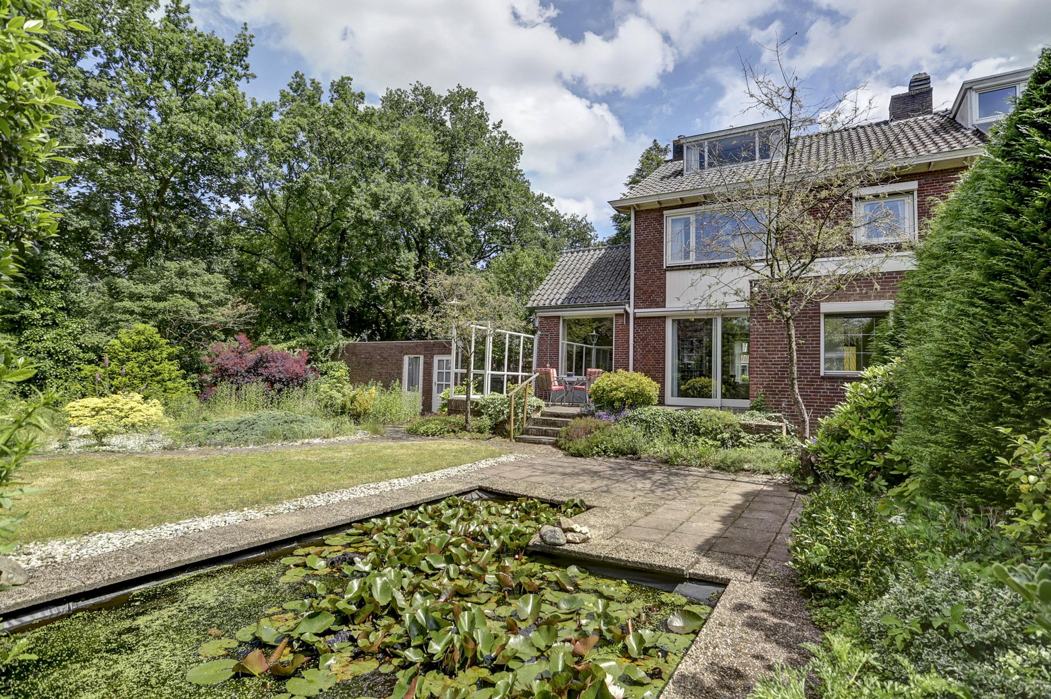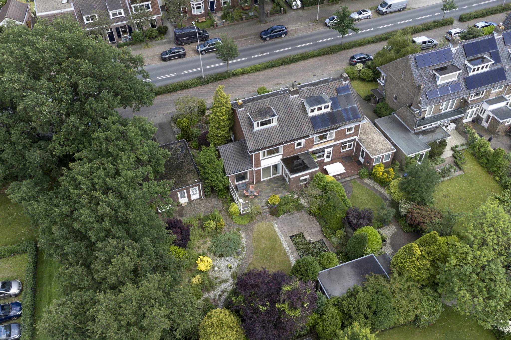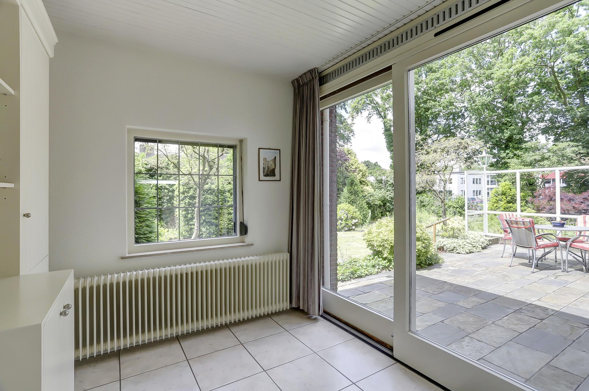 Begane grond: entree, vestibule, gang met toilet en deur naar de kelder. De gesloten keuken is voorzien van een eenvoudige keukeninrichting en is aan de achterzijde in 1971 uitgebouwd. Deze uitbouw geeft toegang tot de achtertuin. De woonkamer is royaal bemeten door een naderhand geplaatste uitbouw (eveneens 1971) aan de zijkant. Middels een schuifpui betreed je de op het zuidwesten gelegen achtertuin. Deze is voorzien van een stenen berging en een stenen garage die is voorzien van een elektrische kanteldeur. Voor de garage is nog een eigen oprit.