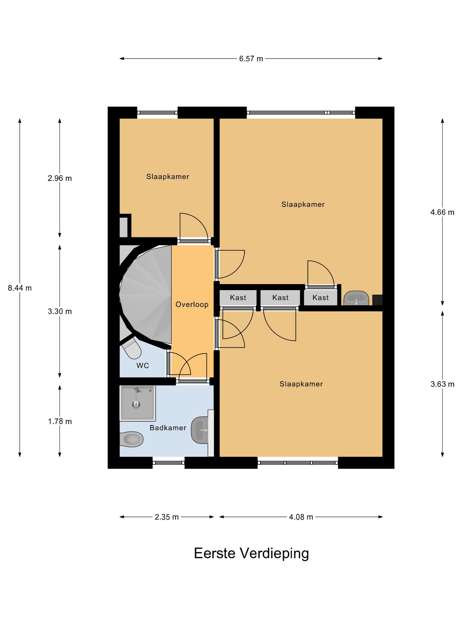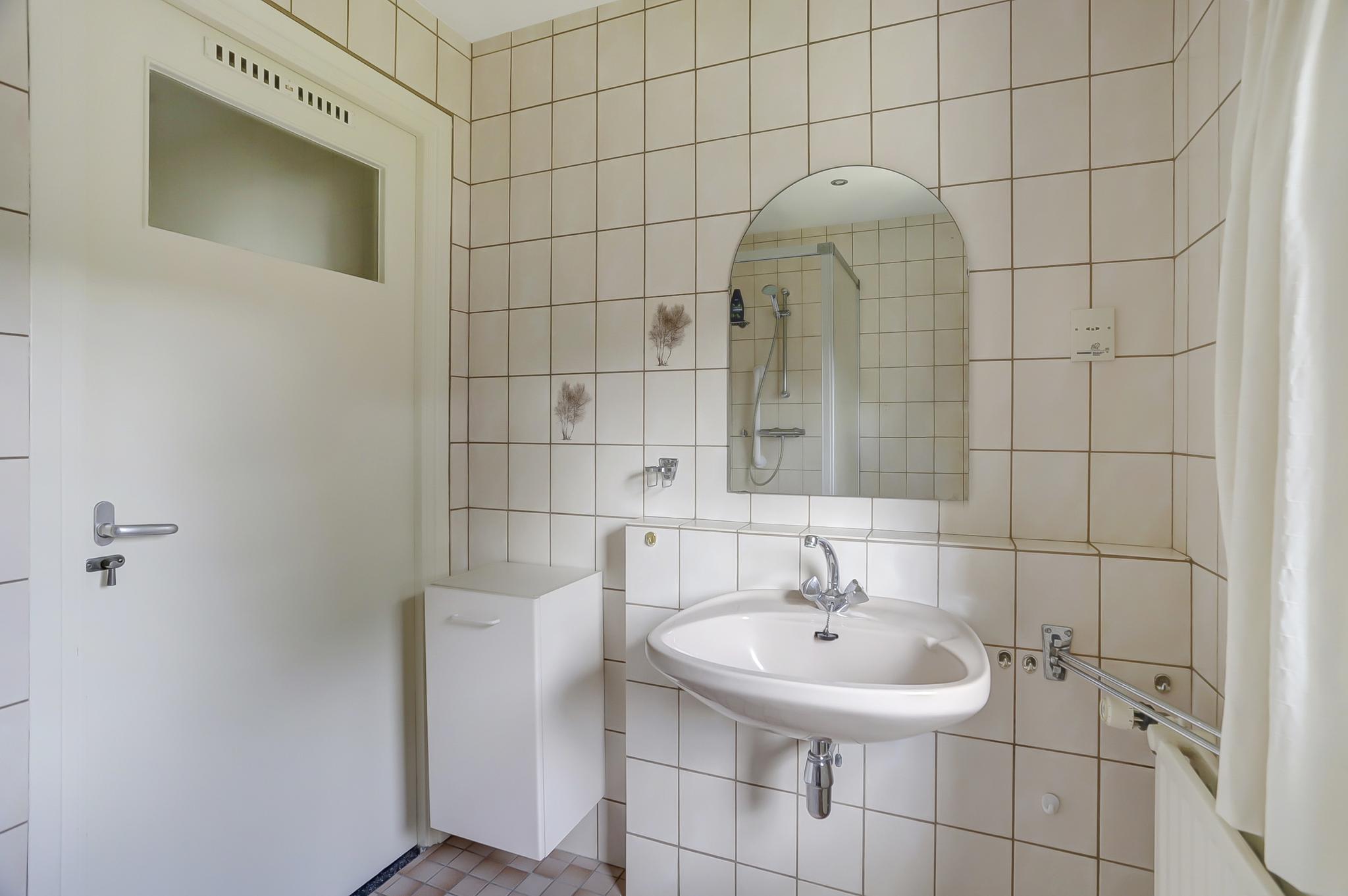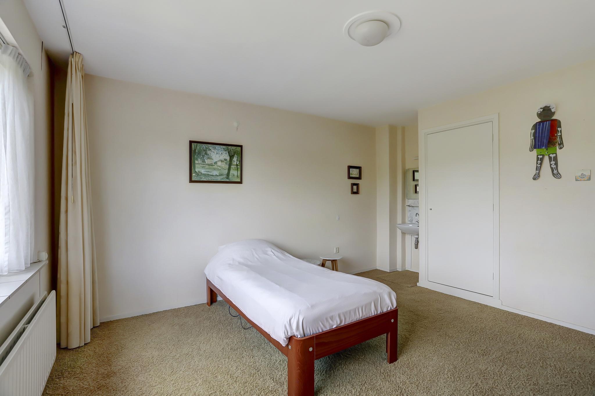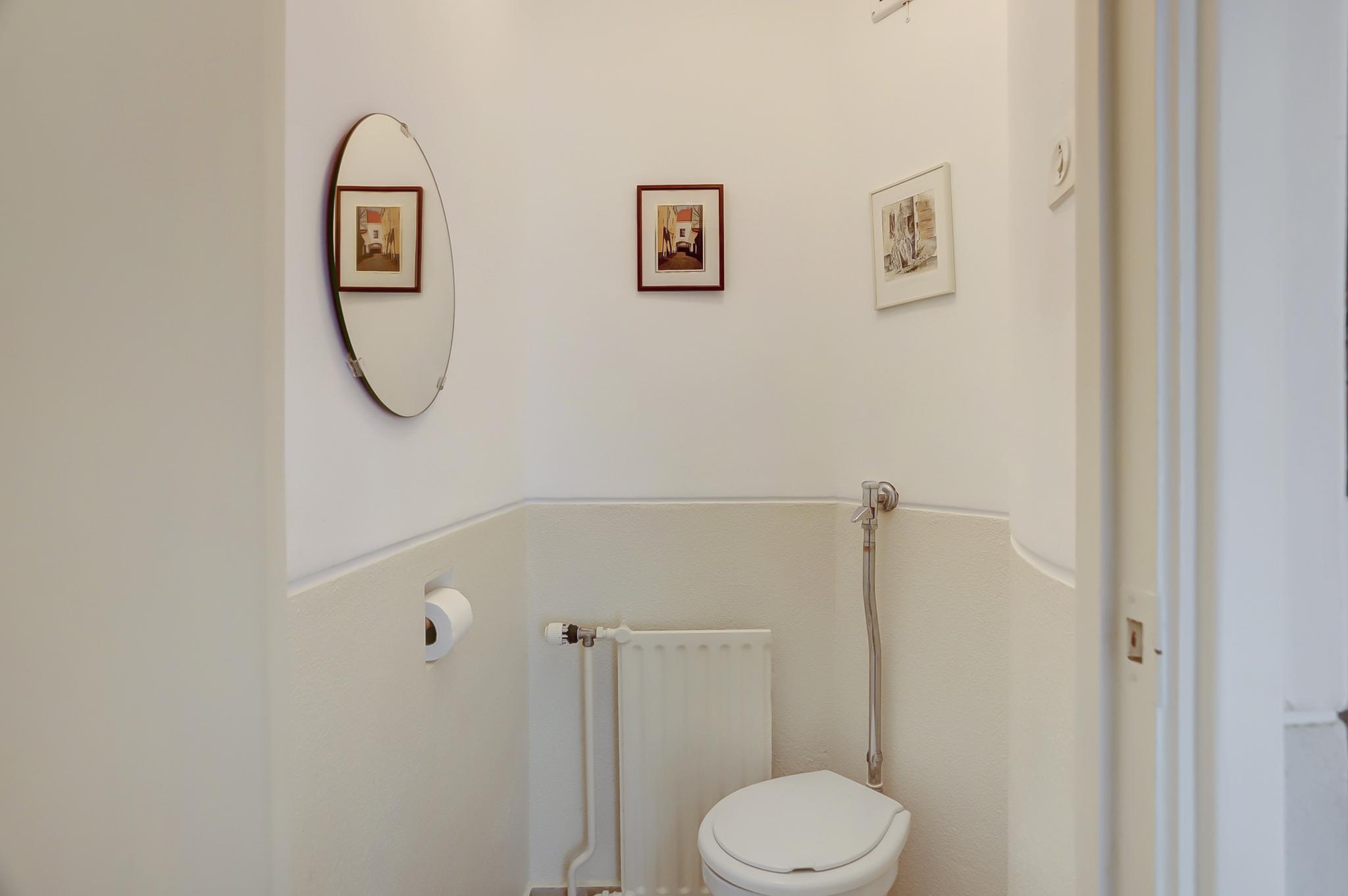 Eerste verdieping: overloop, toilet, eenvoudige badkamer met douche, bidet en wastafel, drie slaapkamers waarbij de grootste twee over inbouwkasten beschikken, en een slaapkamer heeft een vaste wastafel.