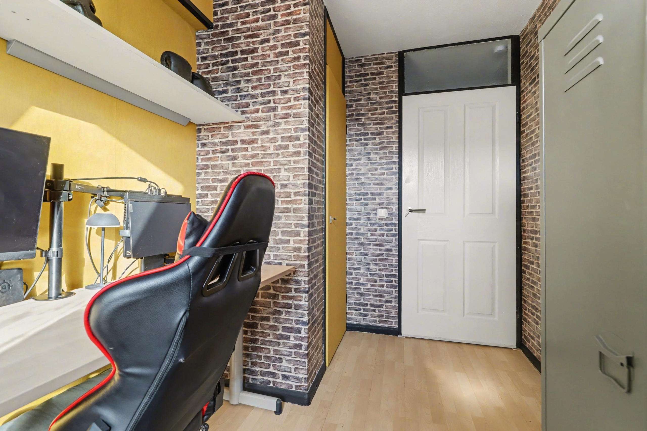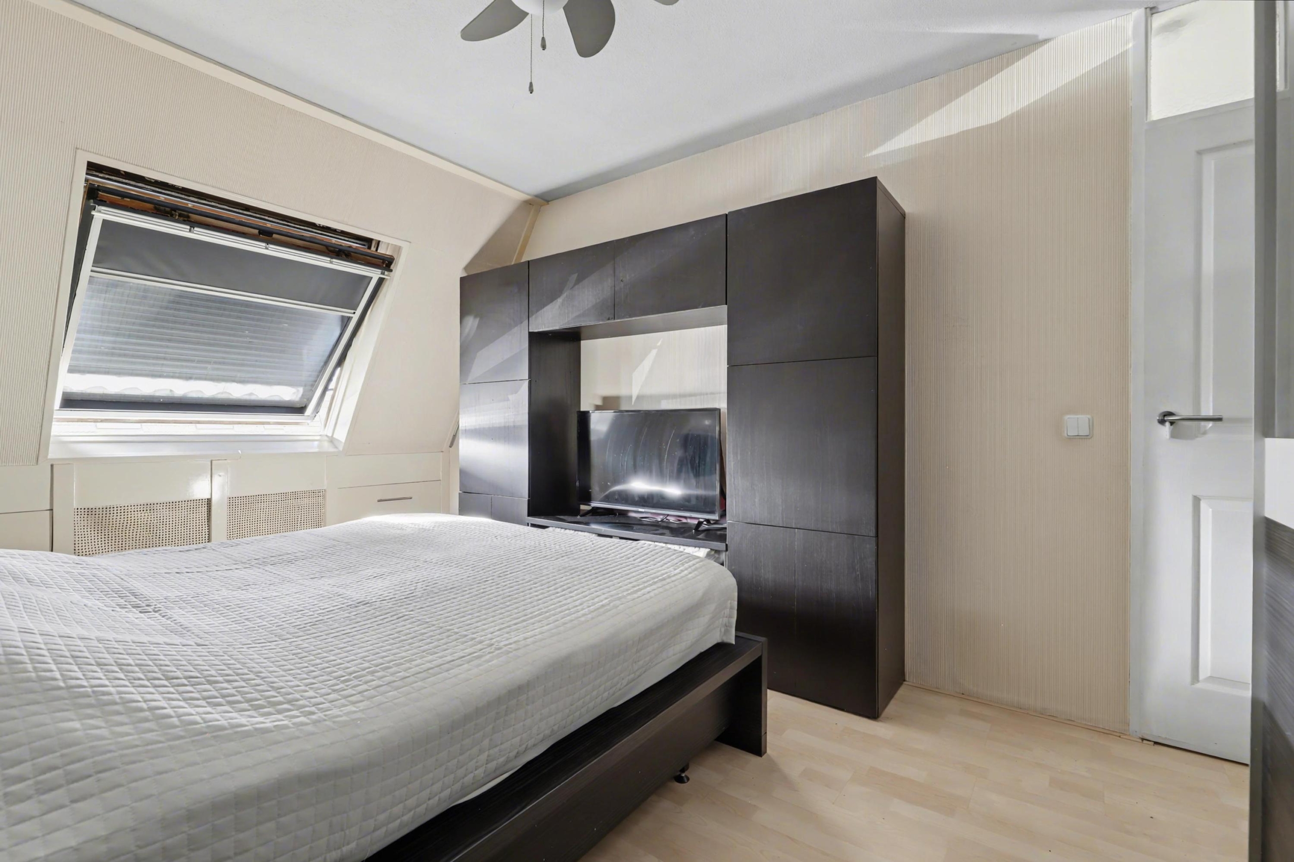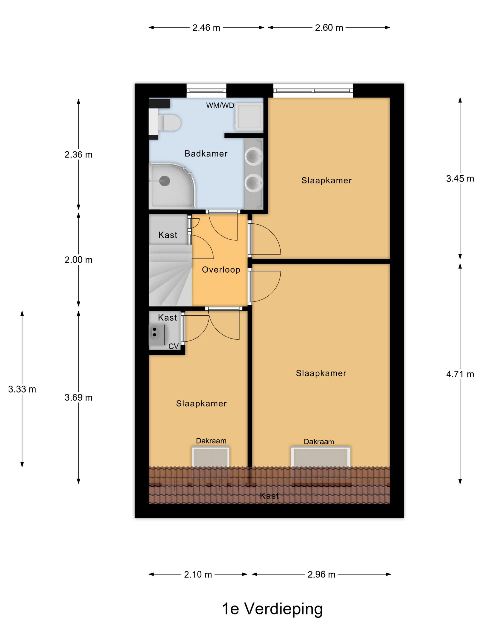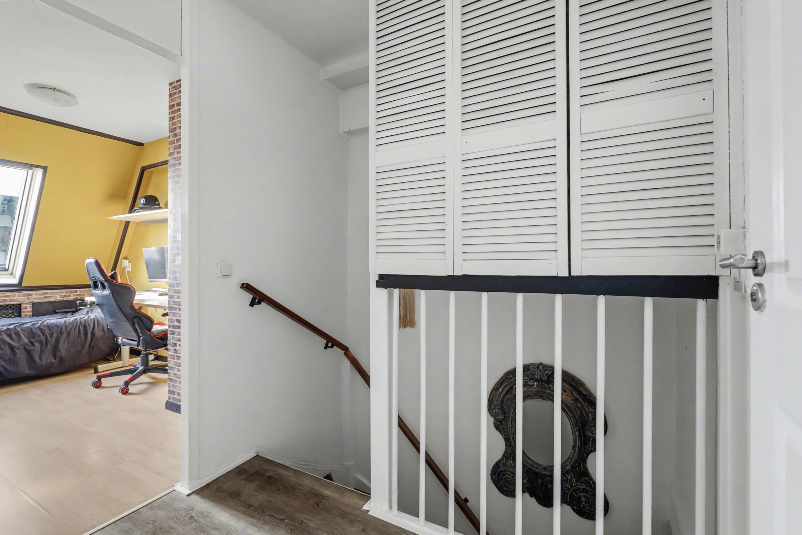 Eerste verdieping: overloop met bergruimte boven de trap, drie slaapkamers waarvan een kamer is voorzien van een vaste kast met cv-ketel. De badkamer is uitgerust met een toilet, douchecabine en een elektrische designradiator. Op de badkamer is de wasmachine-aansluiting.