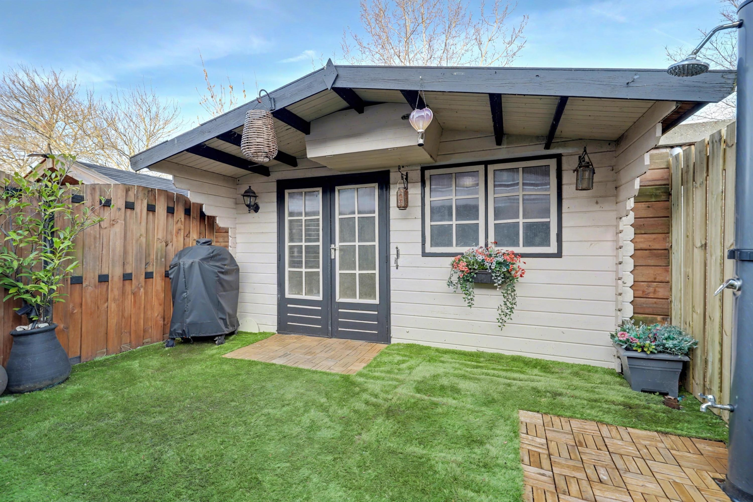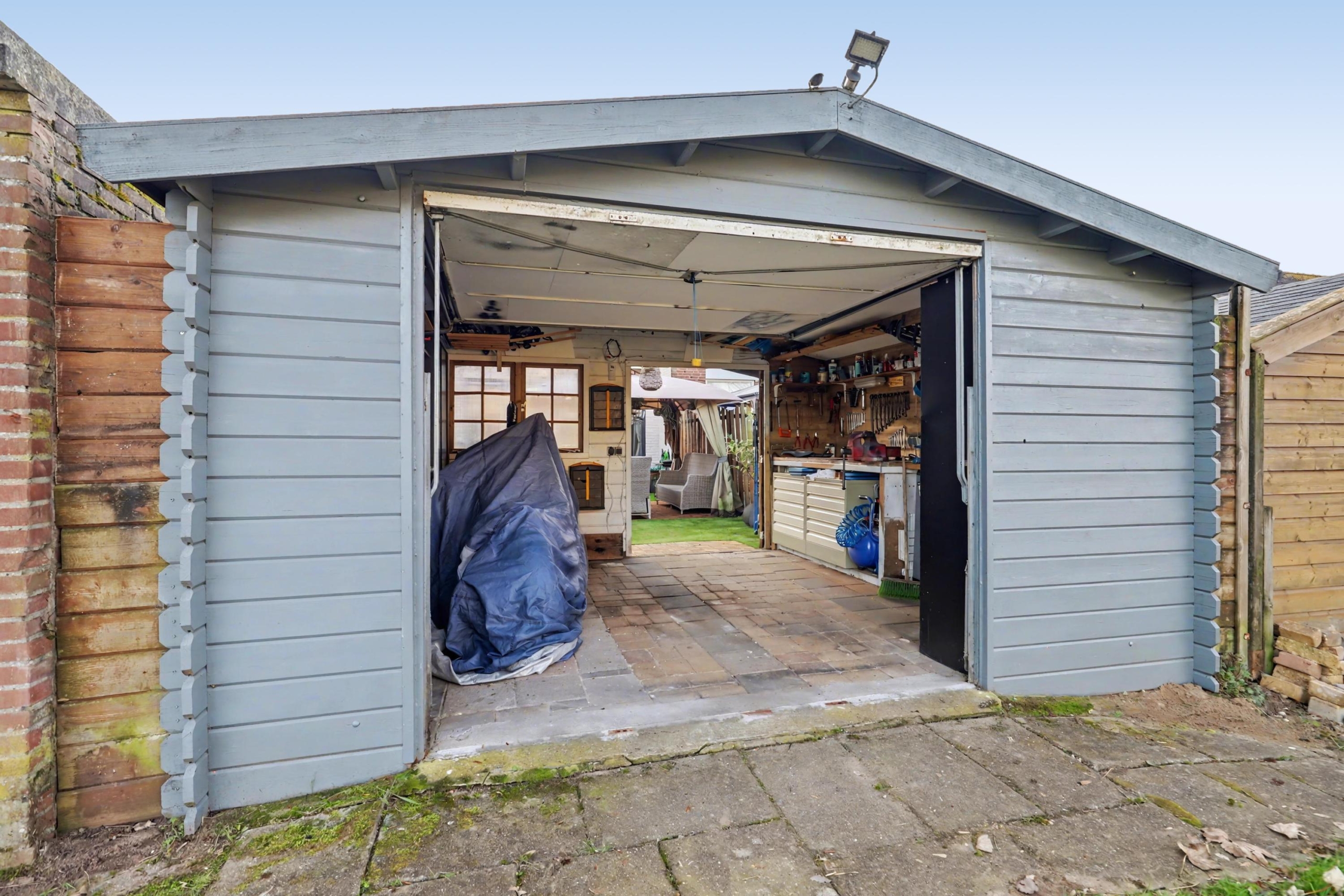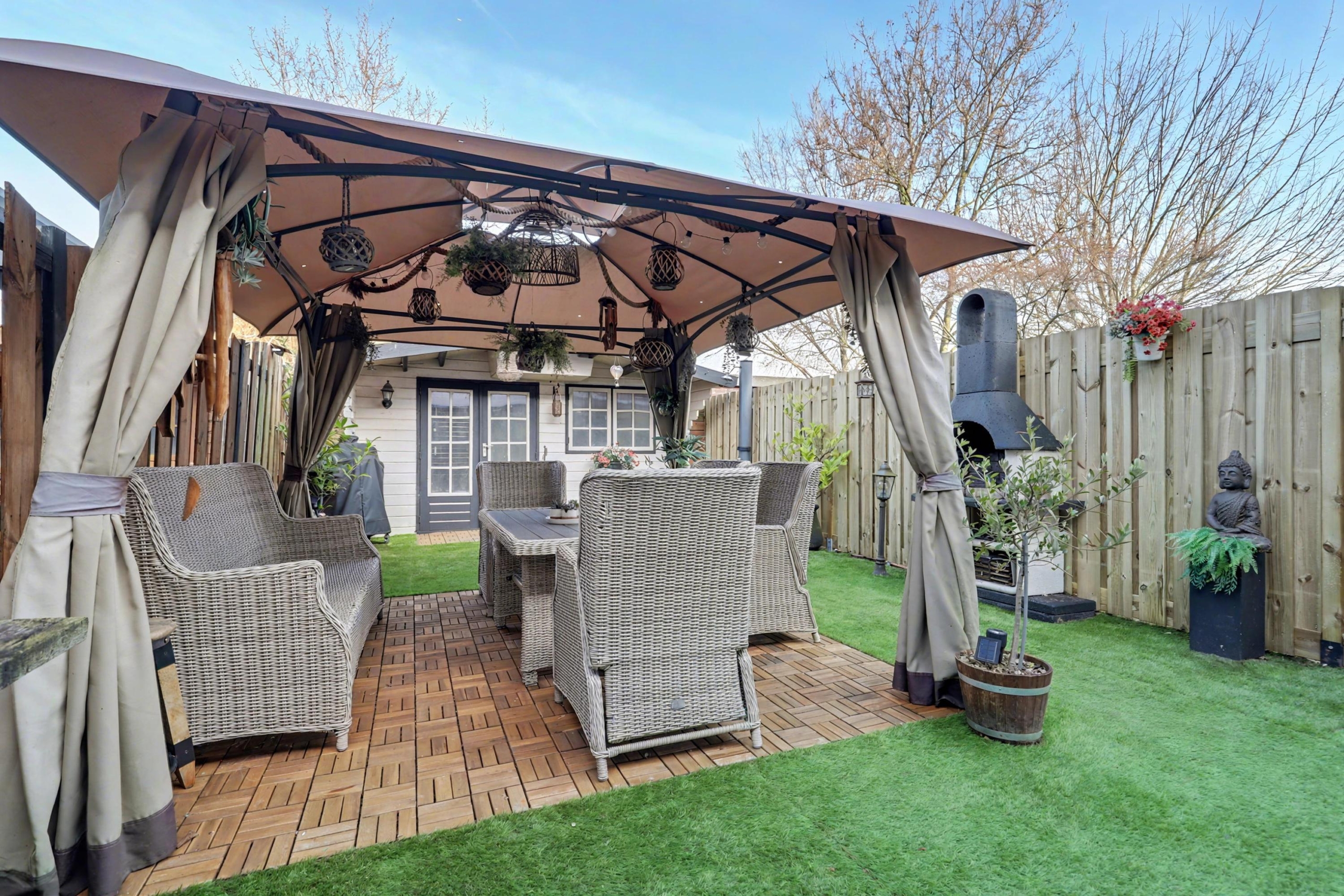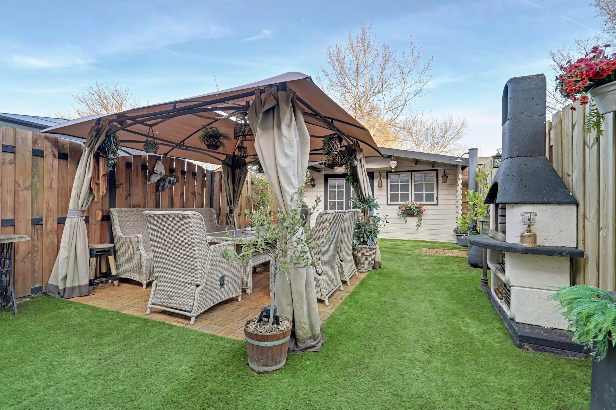 De verzorgde achtertuin heeft een achterom, ligt op het noordoosten en is voorzien van een grote houten berging met een kanteldeur.
