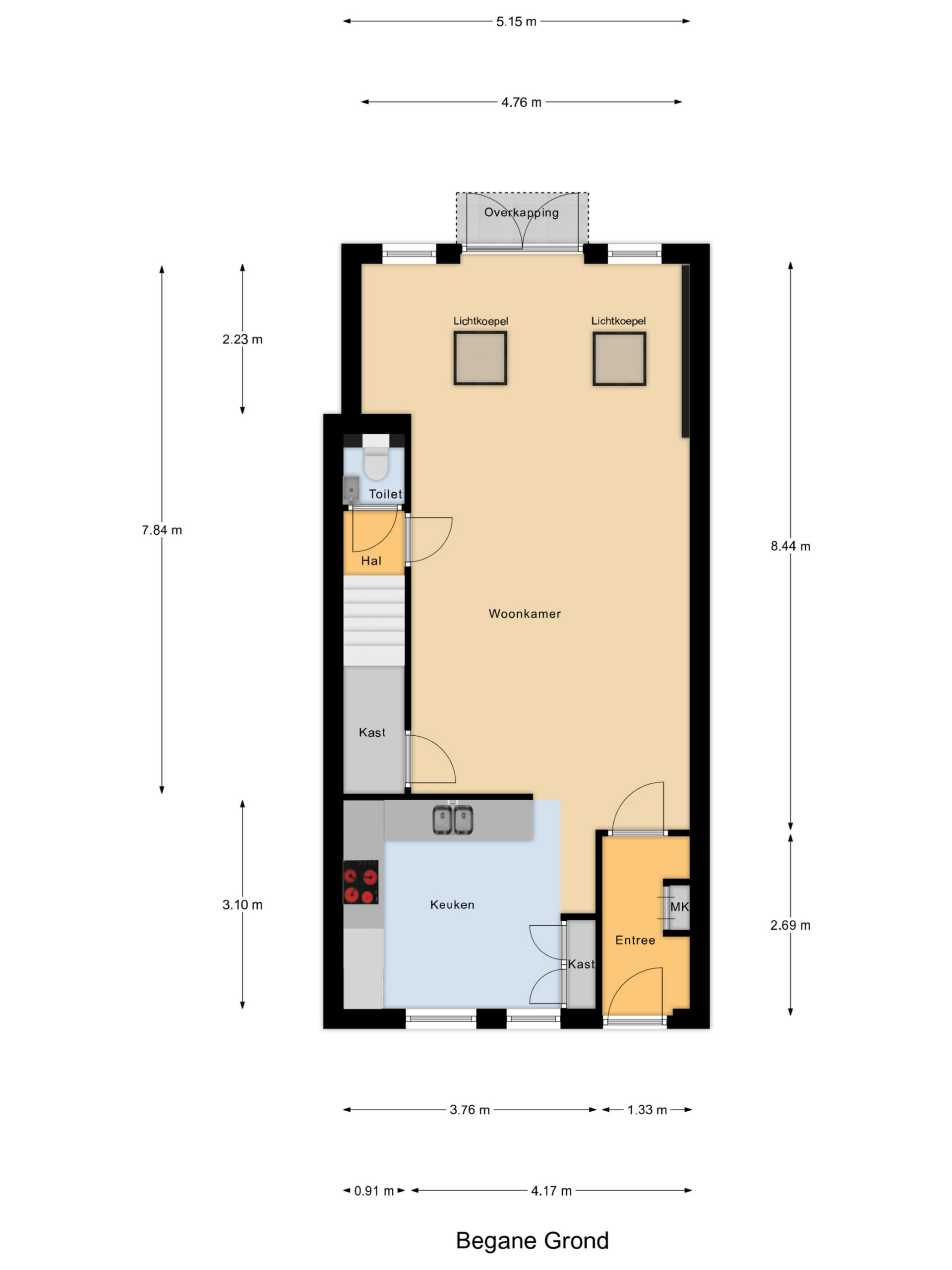 Begane grond: entree, hal met meterkast, open keuken aan de voorzijde met vernieuwde inrichting inclusief diverse inbouwapparatuur. De woonkamer is in 2004 uitgebouwd waardoor een ruime living is ontstaan. Via een tussenportaal is het toilet bereikbaar. De begane grond is voorzien van een pvc vloer.