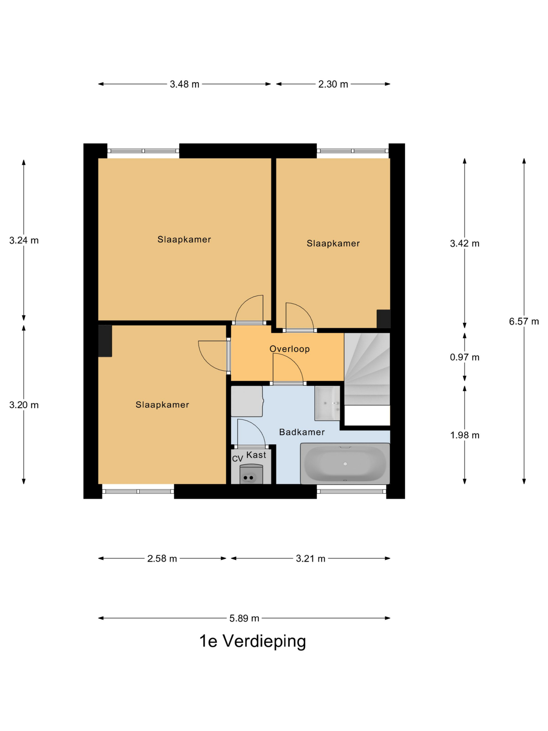 Eerste verdieping: overloop, badkamer met ligbad/douche en wastafel, cv-kast, 3 slaapkamers (ca. 8, 8 en 11 m2).