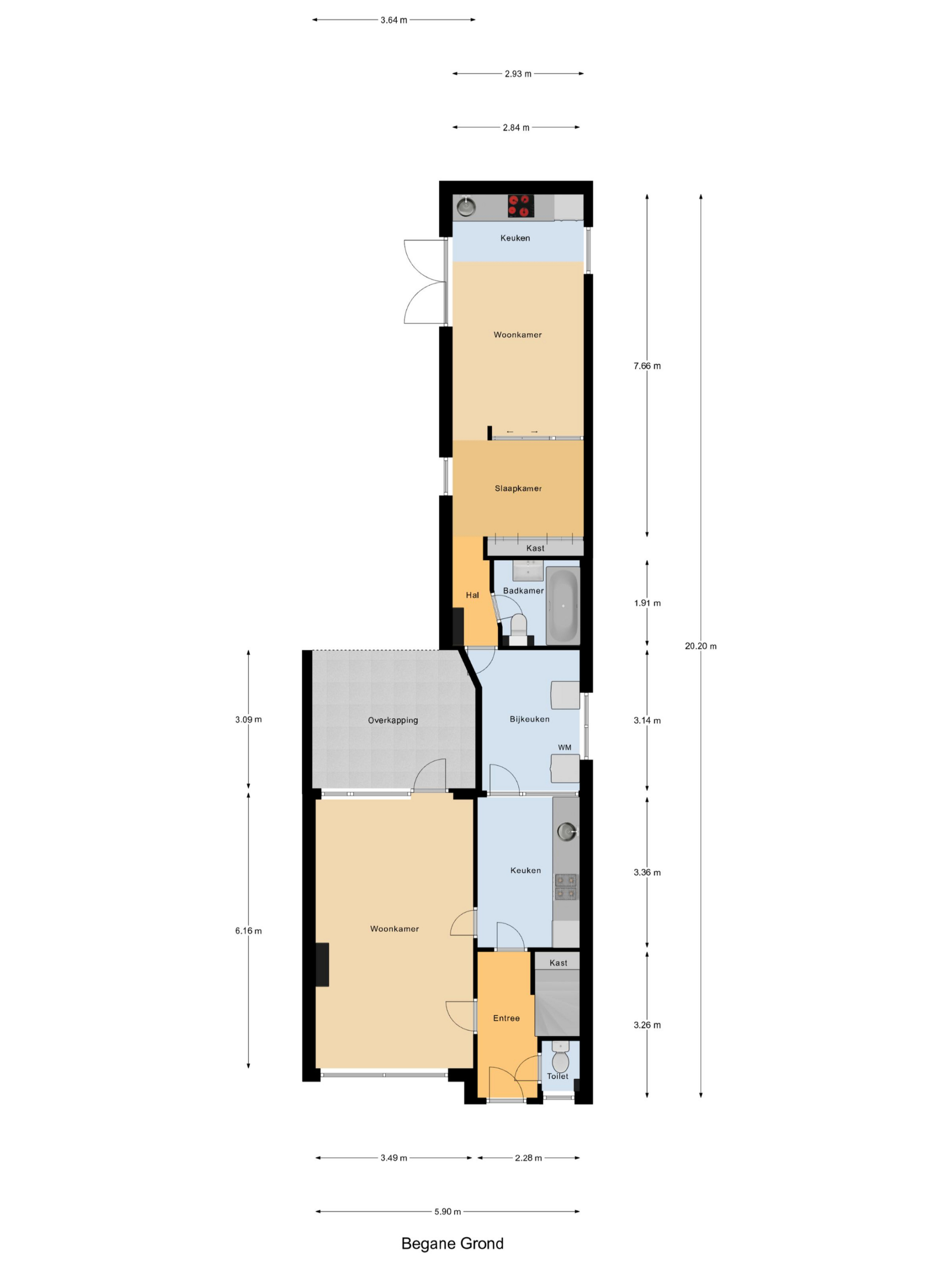 Begane grond: entree/hal, toilet, trapkast, woonkamer met aangebouwde overkapping en deur naar de overkapping en tuin, keuken met eenvoudige inrichting, doorgang naar bijkeuken. Via de bijkeuken is de tweede wooneenheid bereikbaar. Via een hal is er een badkamer (voorzien van ligbad/douche, wc en wastafel), een slaapkamer, woonkamer en open keuken met diverse apparatuur. Via de woonkamer is de achtertuin bereikbaar.