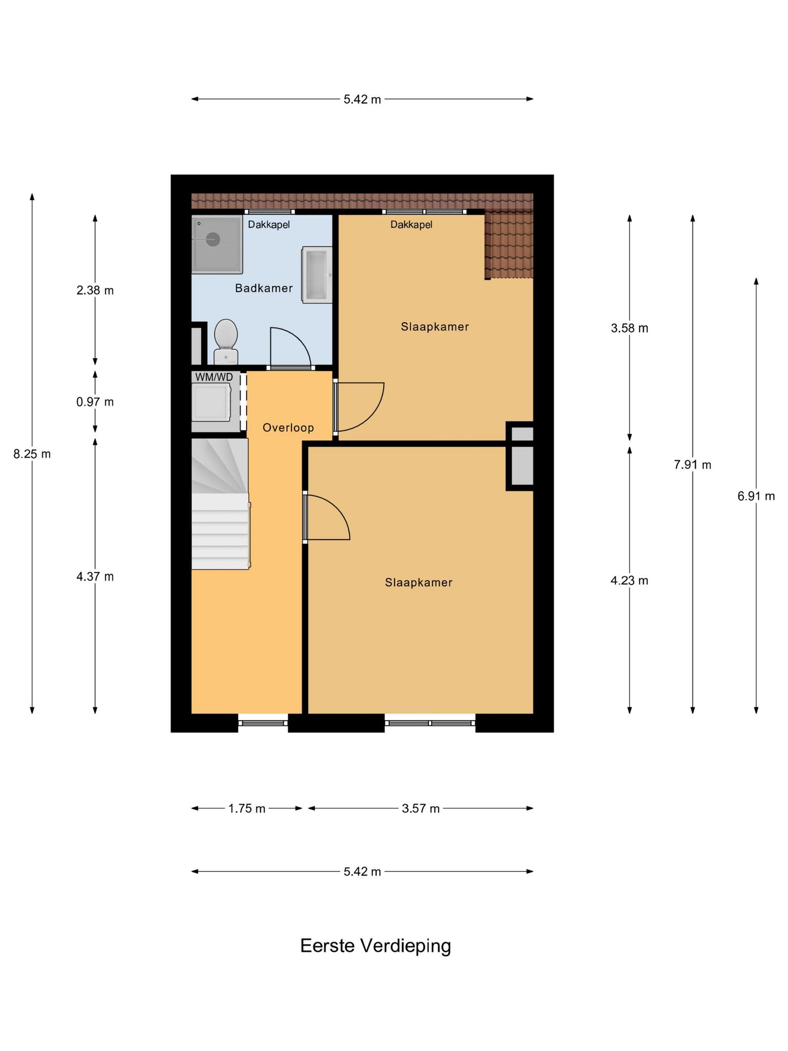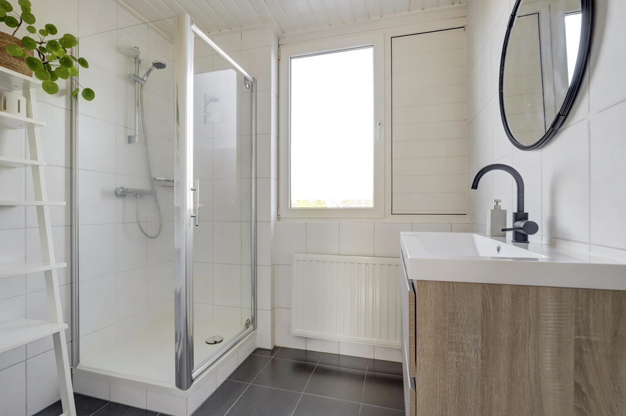 Eerste verdieping: overloop met fraaie parketvloer en wasmachine-/drogeraansluiting. Op de overloop staat nu een grote kledingkast, maar dat zou ook gebruikt kunnen worden als thuiswerkplek. Op deze verdieping zijn twee ruime slaapkamers en een lichte, moderne badkamer. Deze is voorzien van een douchecabine, wastafelmeubel en een toilet.