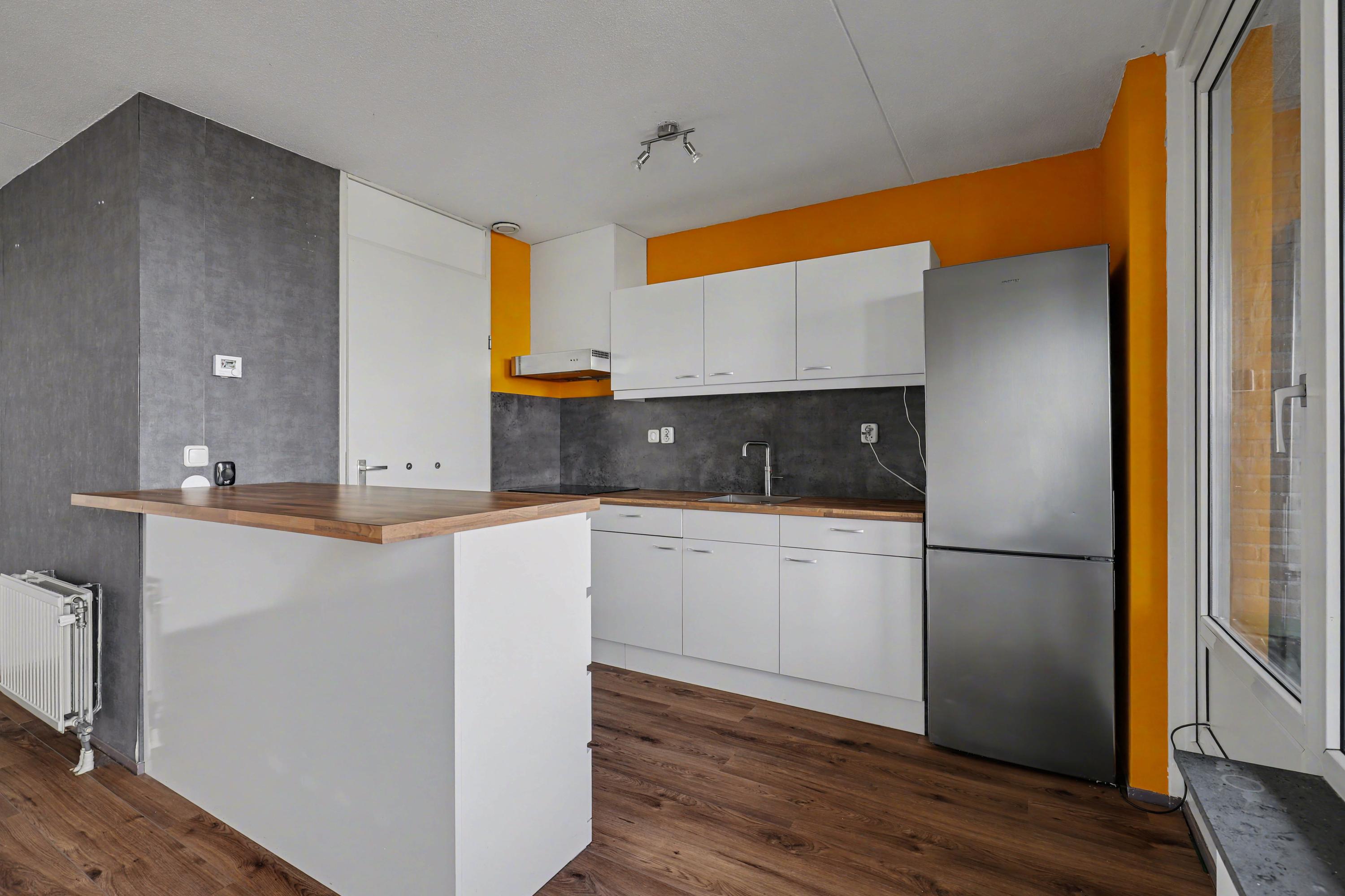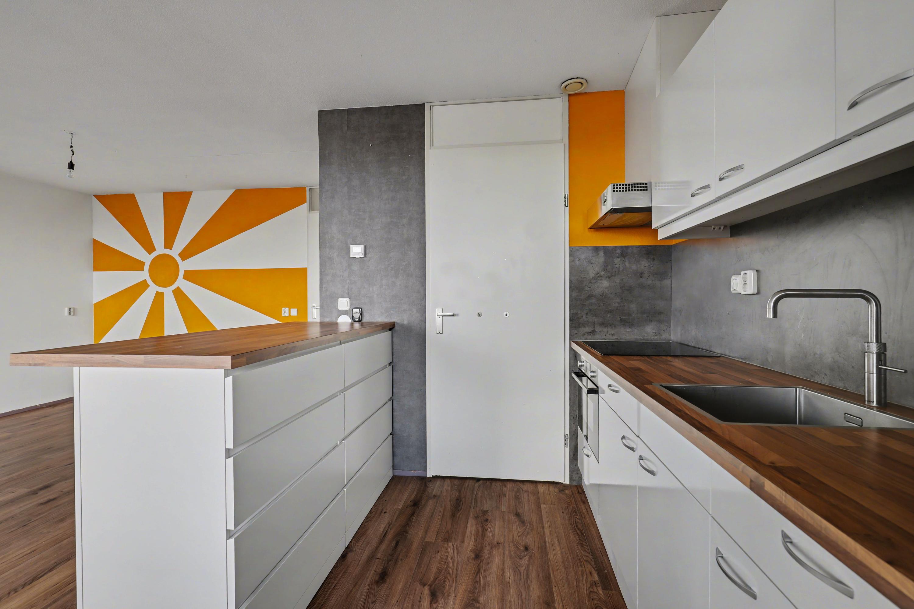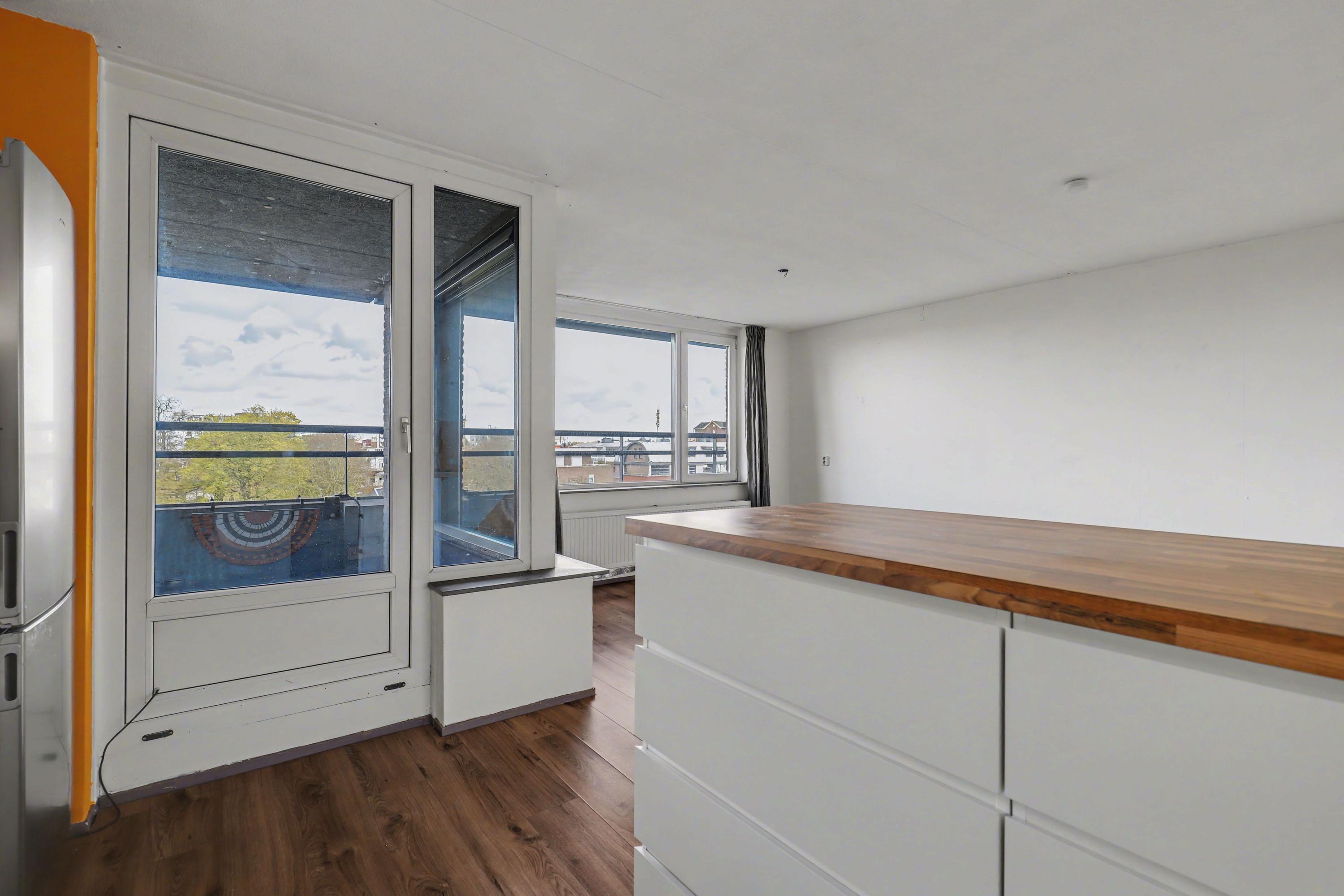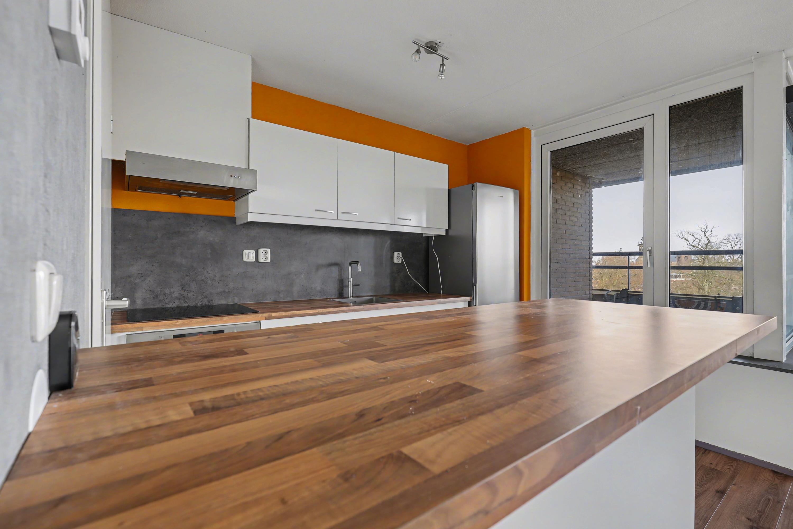 De moderne open keuken (renovatie 2020) is voorzien van diverse inbouwapparatuur zoals een Quooker, oven, inductiekookplaat, koel-/vriescombinatie en een afzuigkap. Verder is er veel bergruimte in de diverse kasten en laden. Het balkon grenst aan de keuken en bevindt zich daarmee aan de voorzijde van de woning. Hier geniet je eveneens van het fraaie uitzicht en de opkomende ochtendzon.