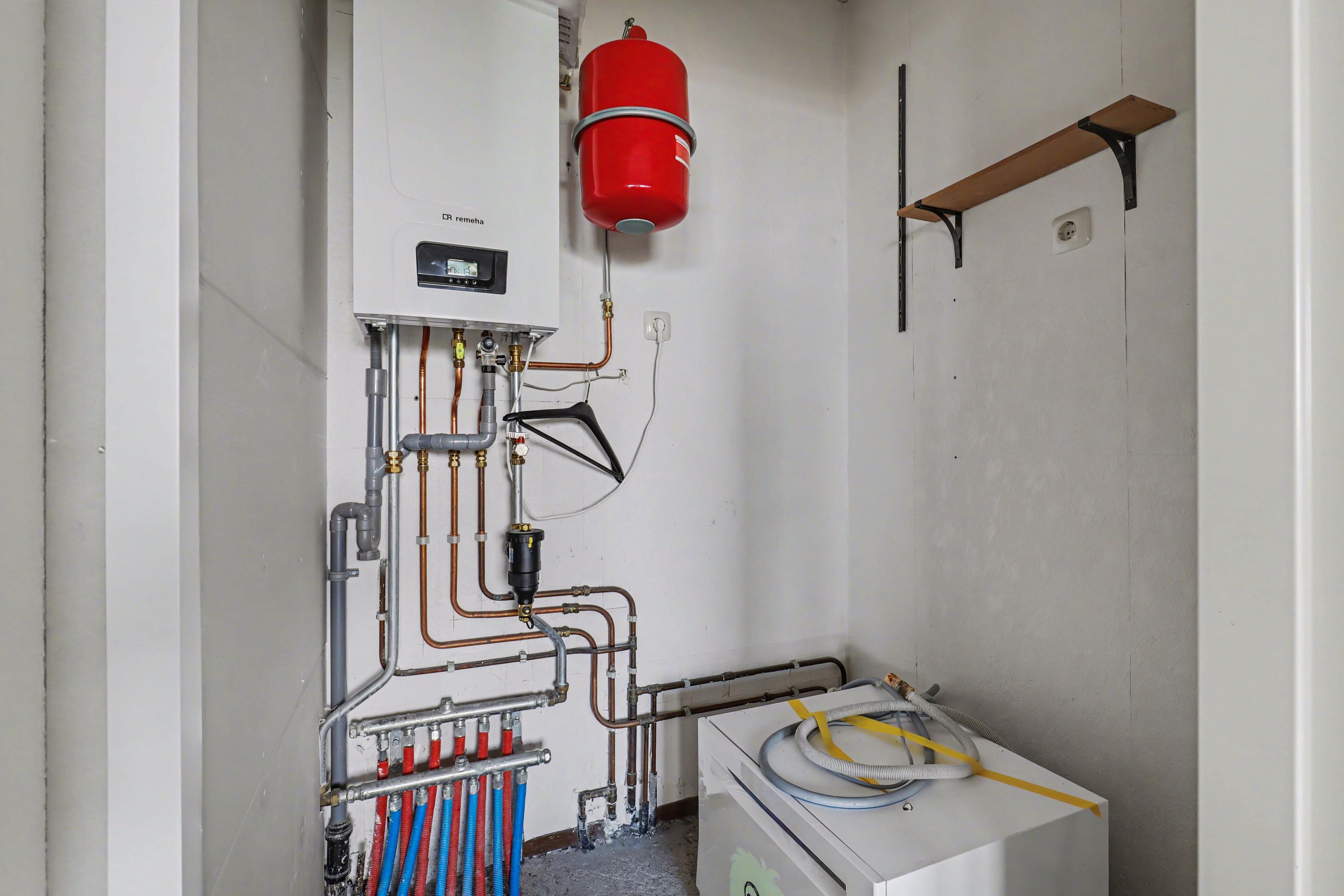 In de aan de keuken grenzende berging is de aansluiting voor de wasmachine en hier hangt tevens de cv-ketel die in 2024 is vervangen.