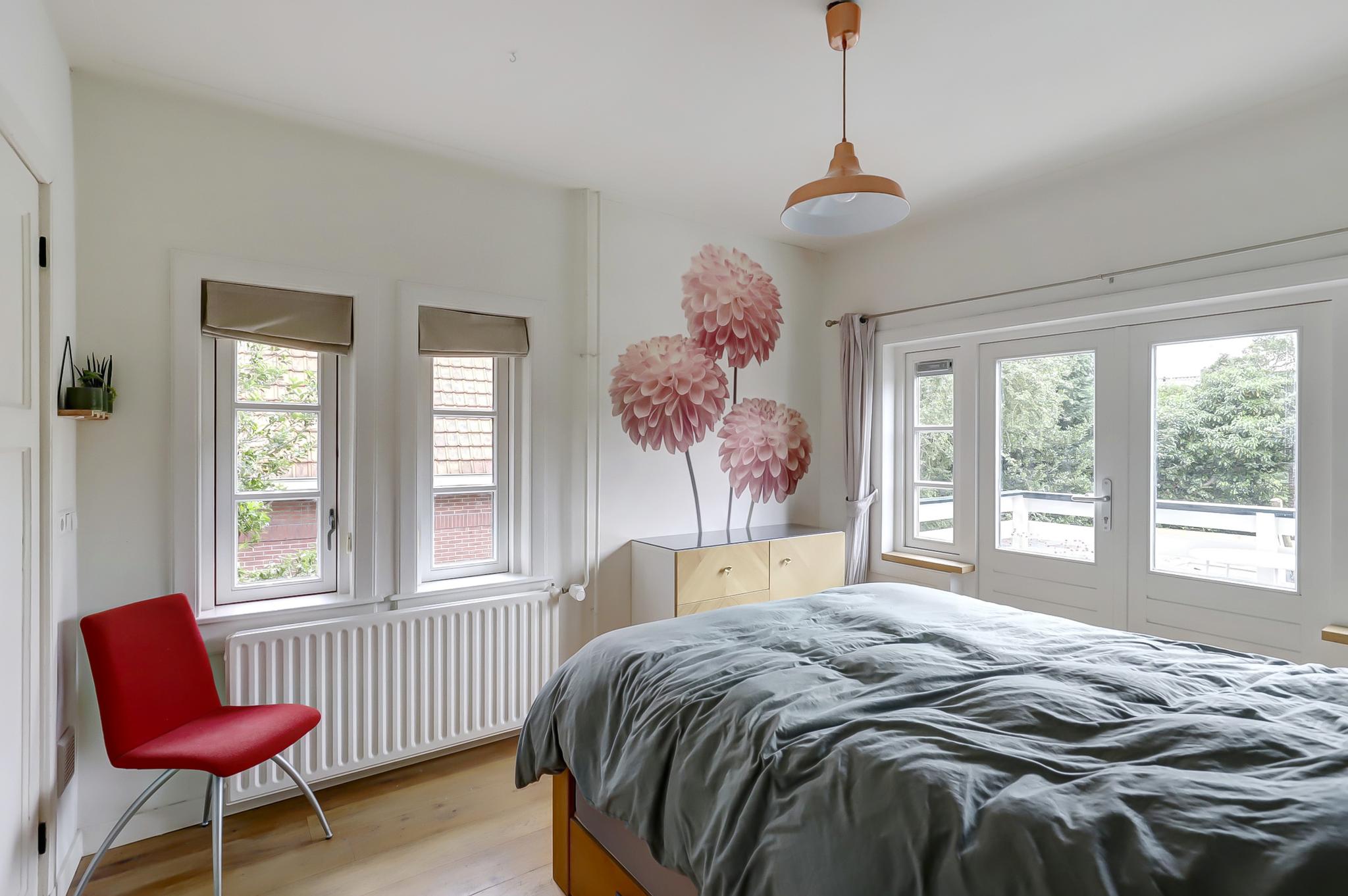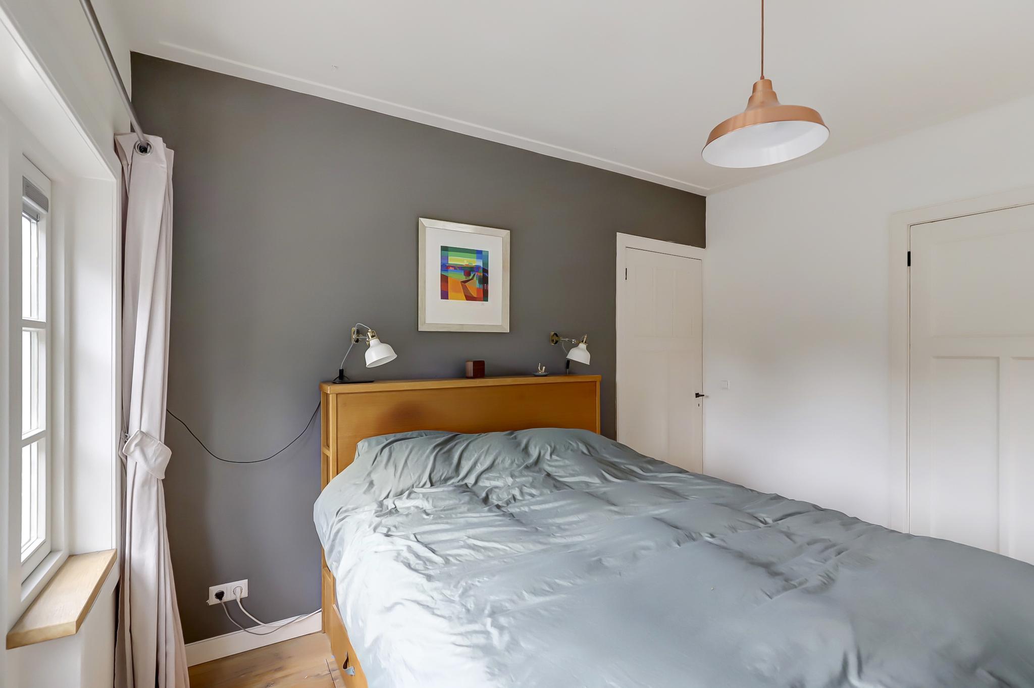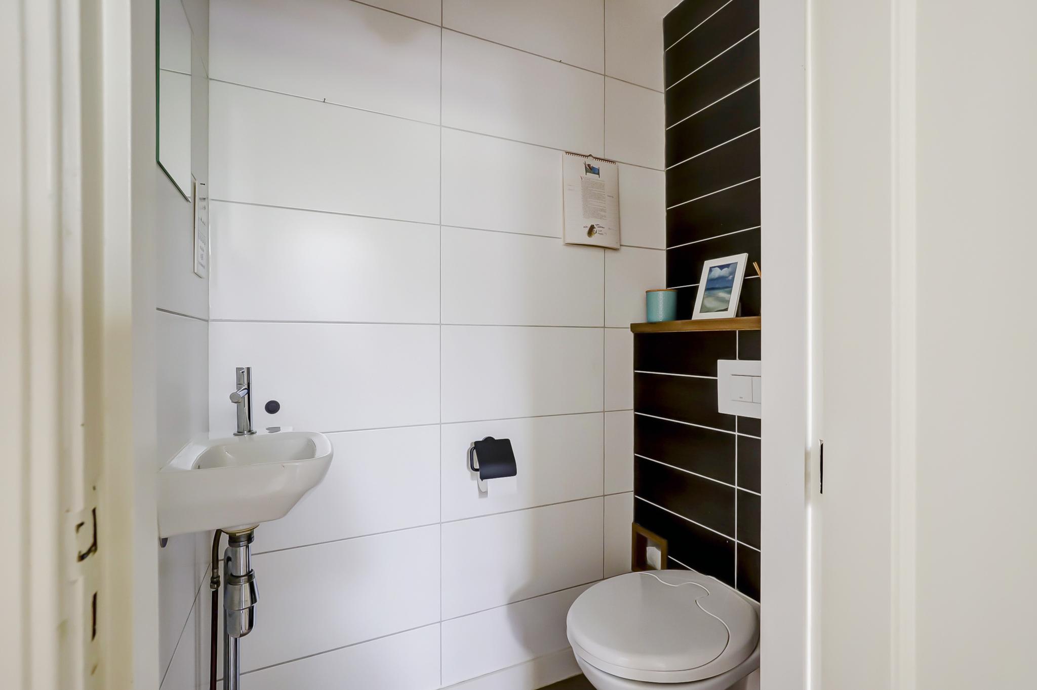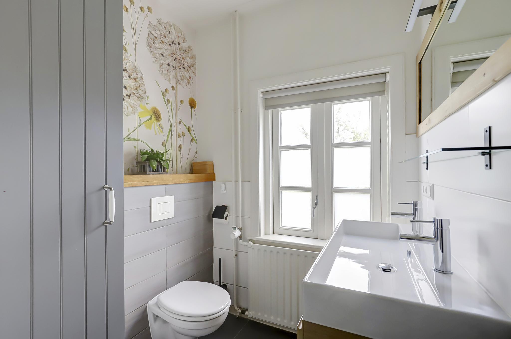 Eerste verdieping: overloop, toilet met wastafel en kastruimte, in totaal twee slaapkamers, waarbij de grootste kamer 2 inbouwkasten heeft en dubbele deuren naar het dakterras. De badkamer is voorzien van vloerverwarming, een ligbad, douche en wastafel.