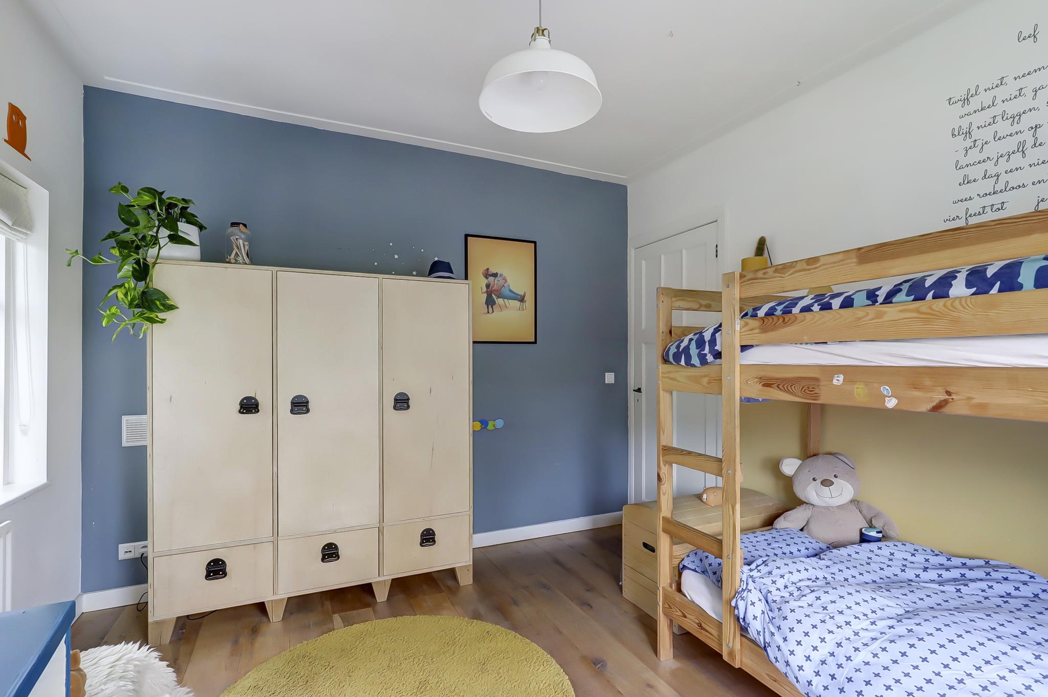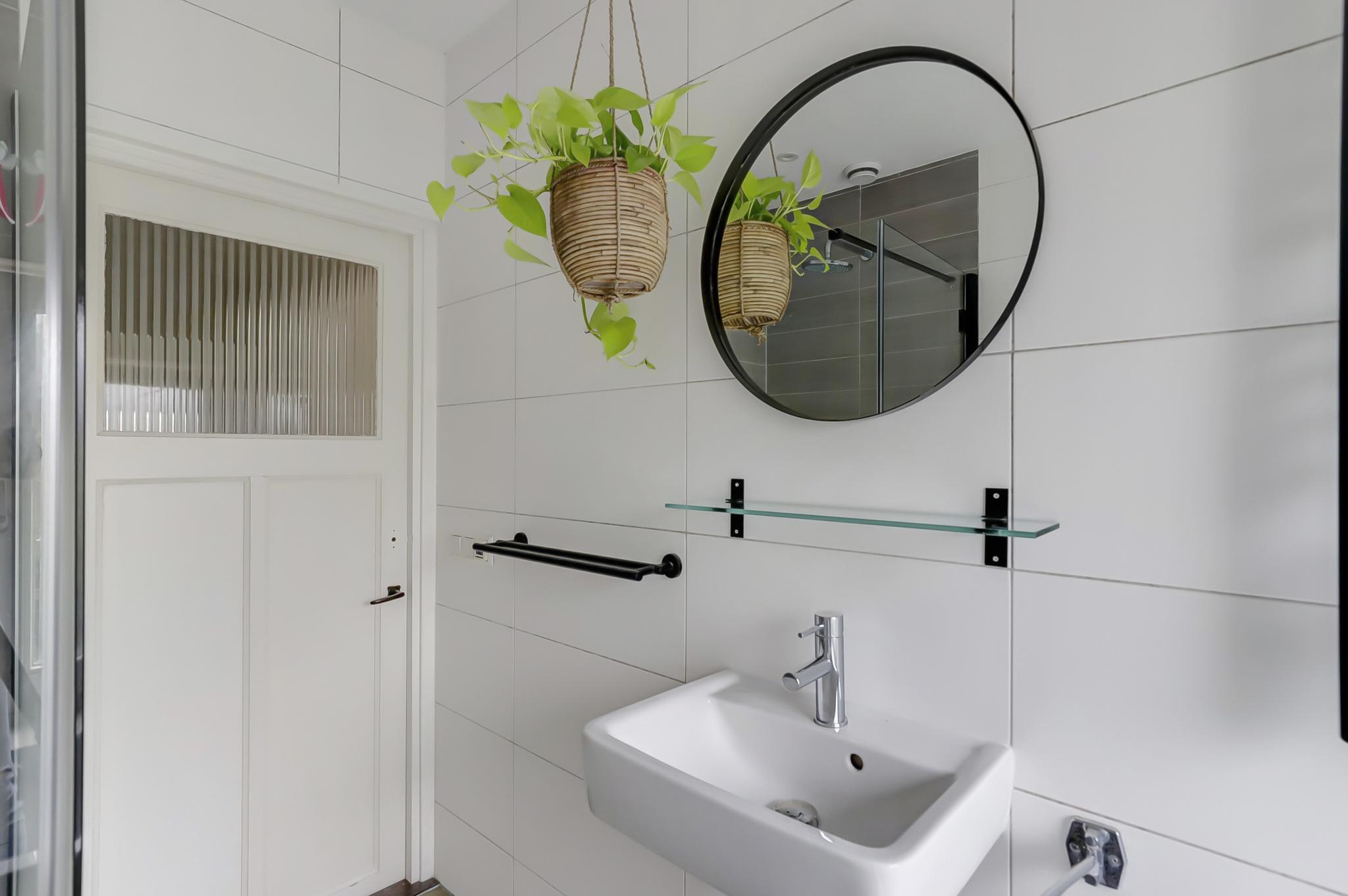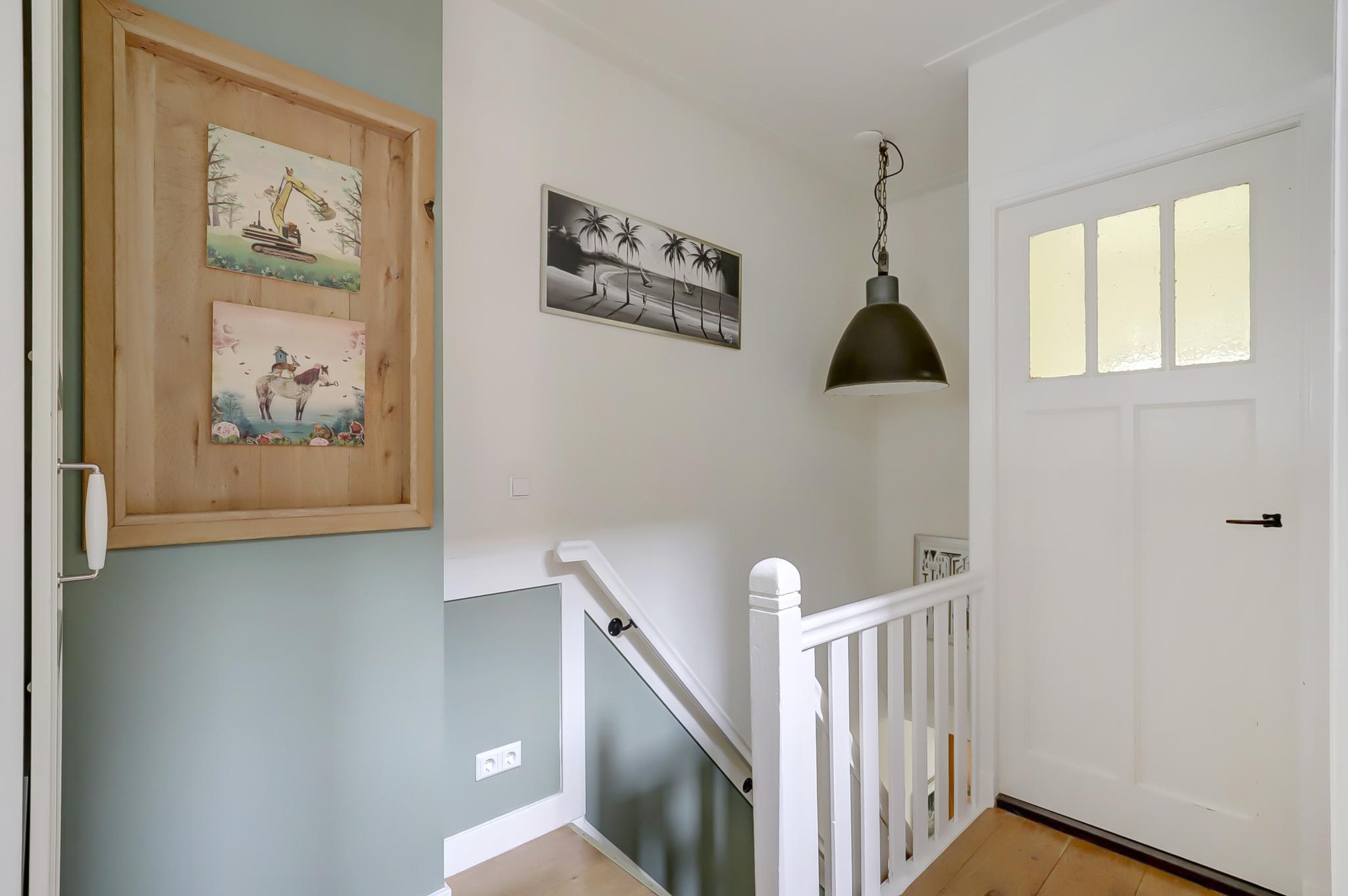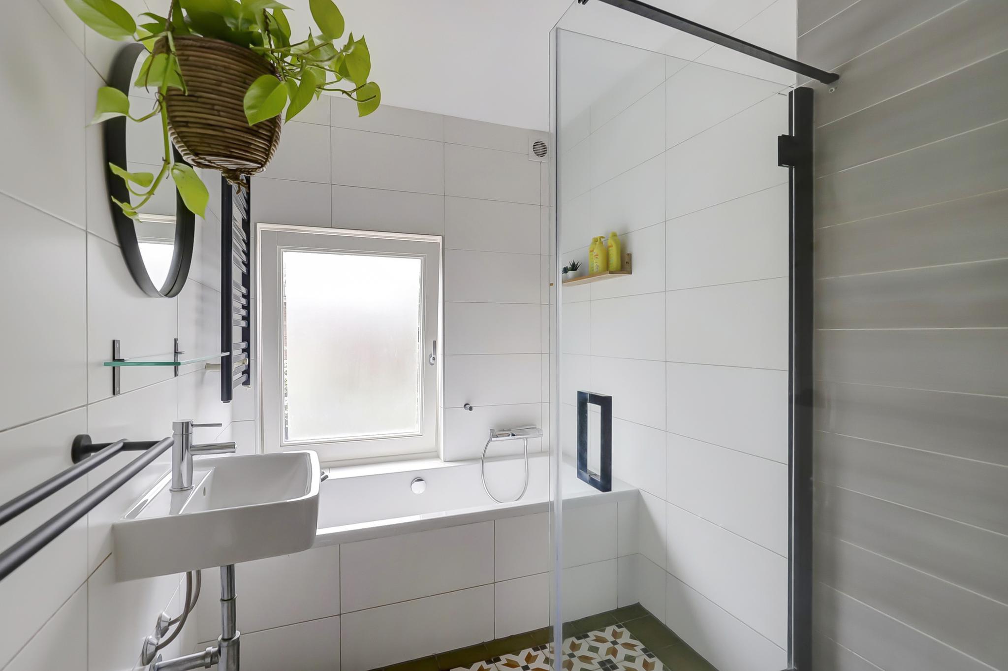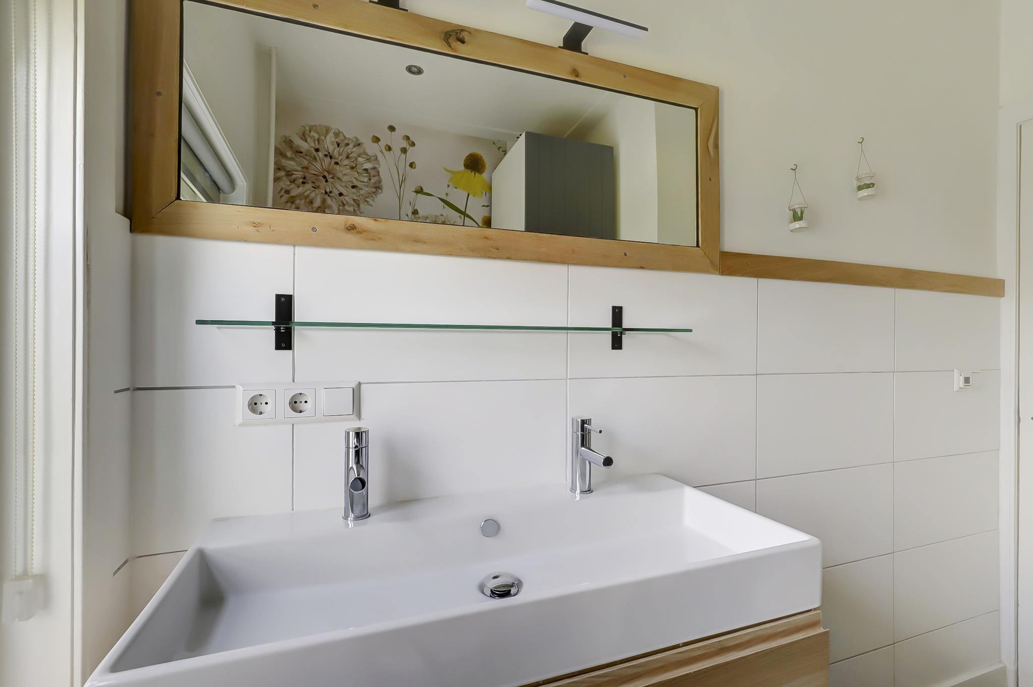 Eerste verdieping: overloop, toilet met wastafel en kastruimte, in totaal twee slaapkamers, waarbij de grootste kamer 2 inbouwkasten heeft en dubbele deuren naar het dakterras. De badkamer is voorzien van vloerverwarming, een ligbad, douche en wastafel.