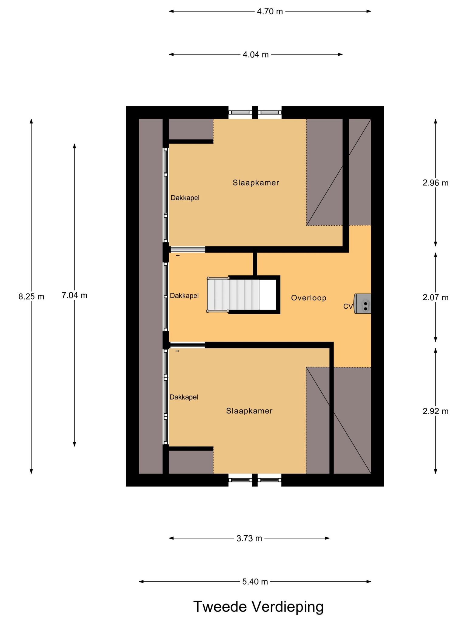 Tweede verdieping: overloop met grote dakkapel, berging met cv-ketel, twee ruime slaapkamers.