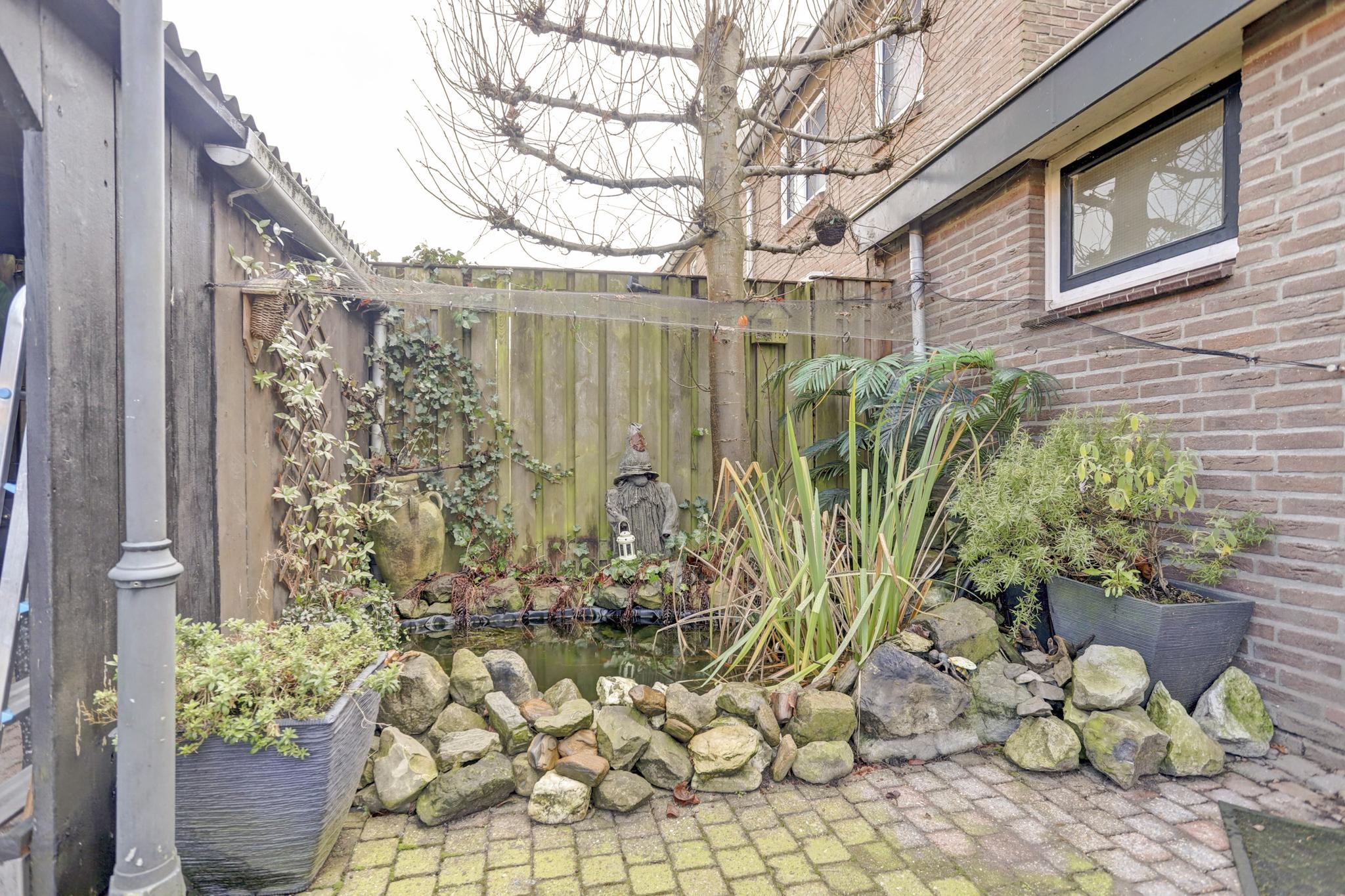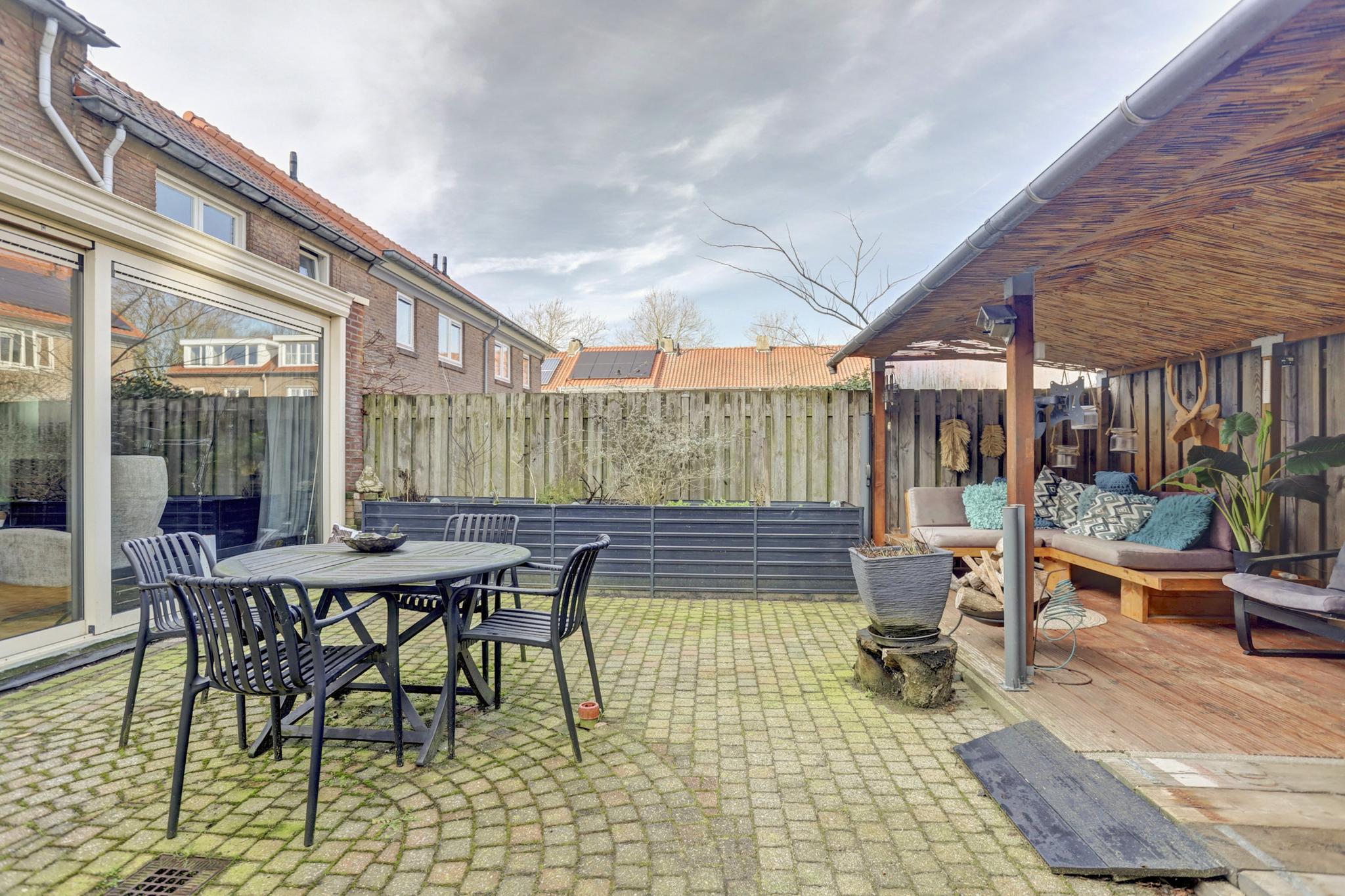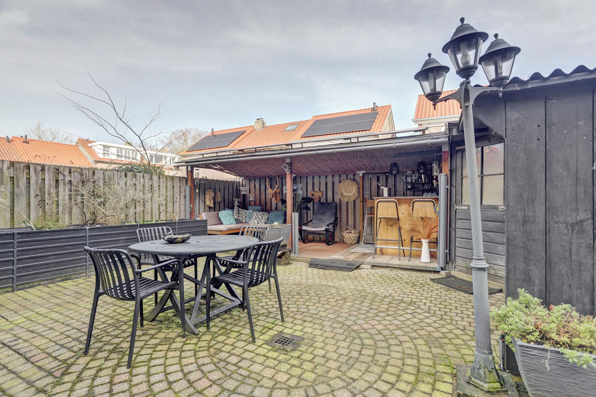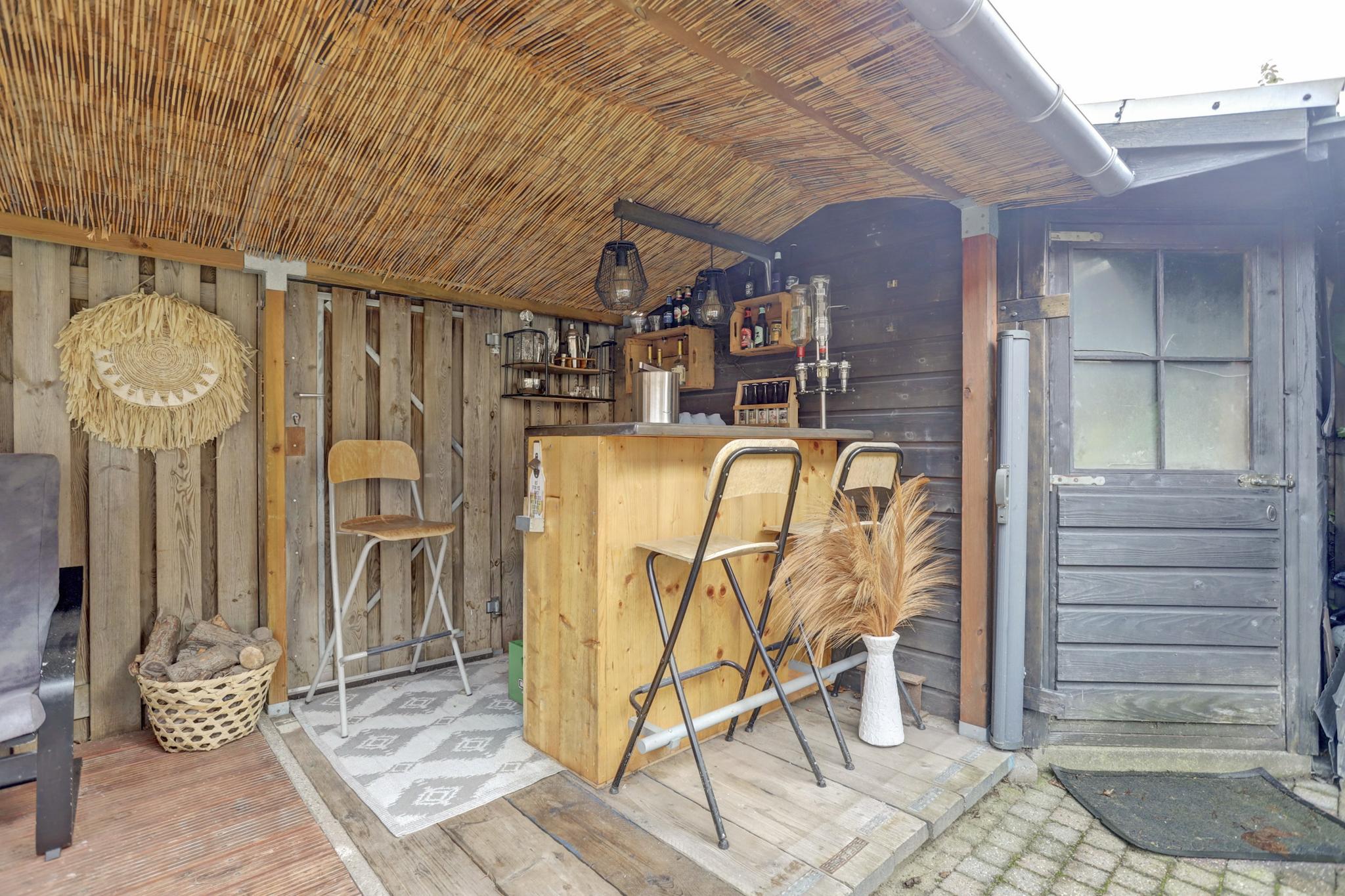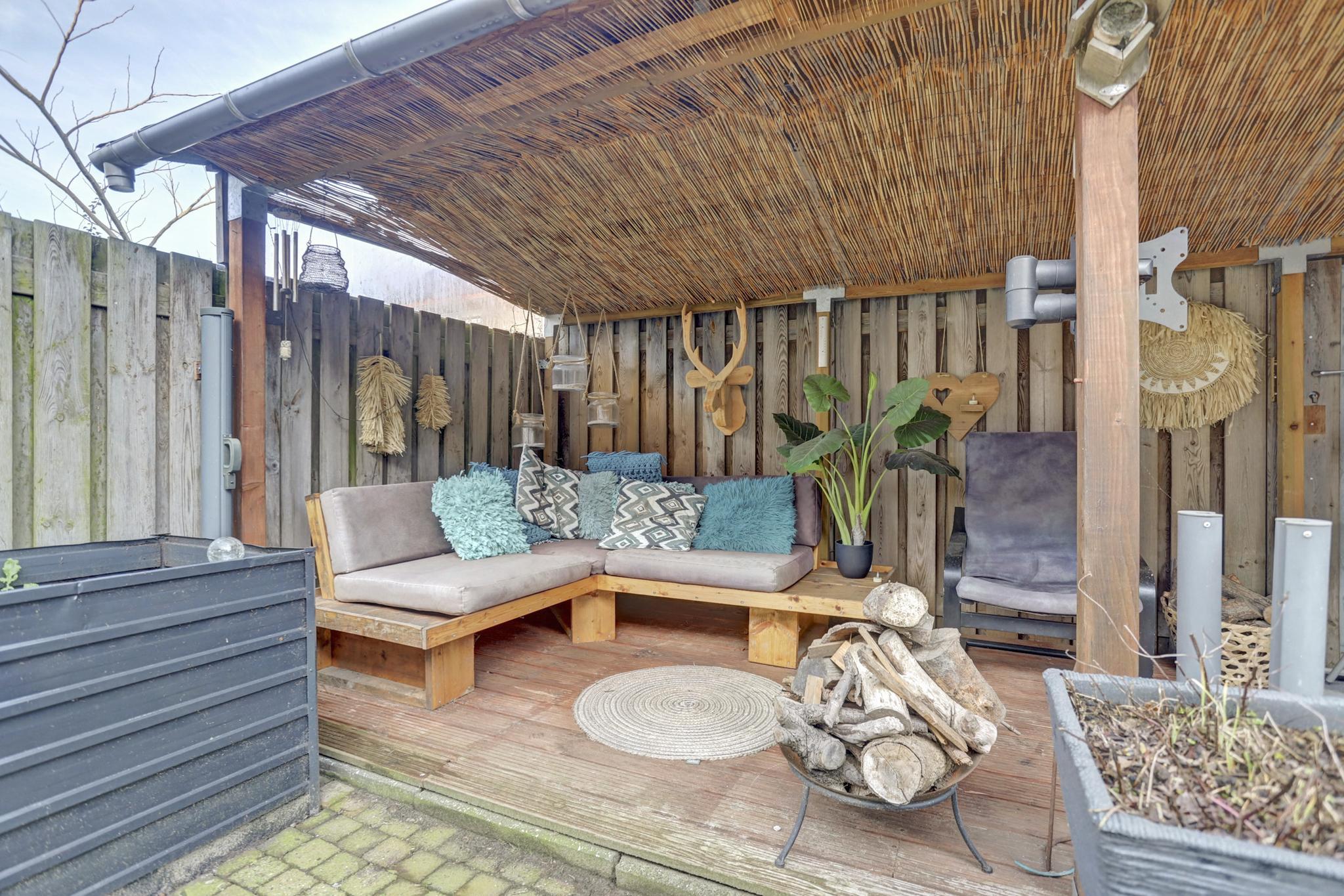 In de achtertuin, die op het noordoosten ligt, staat een ruime overkapping die tegen de berging is aangebouwd. De achtertuin is voorzien van een achterom.