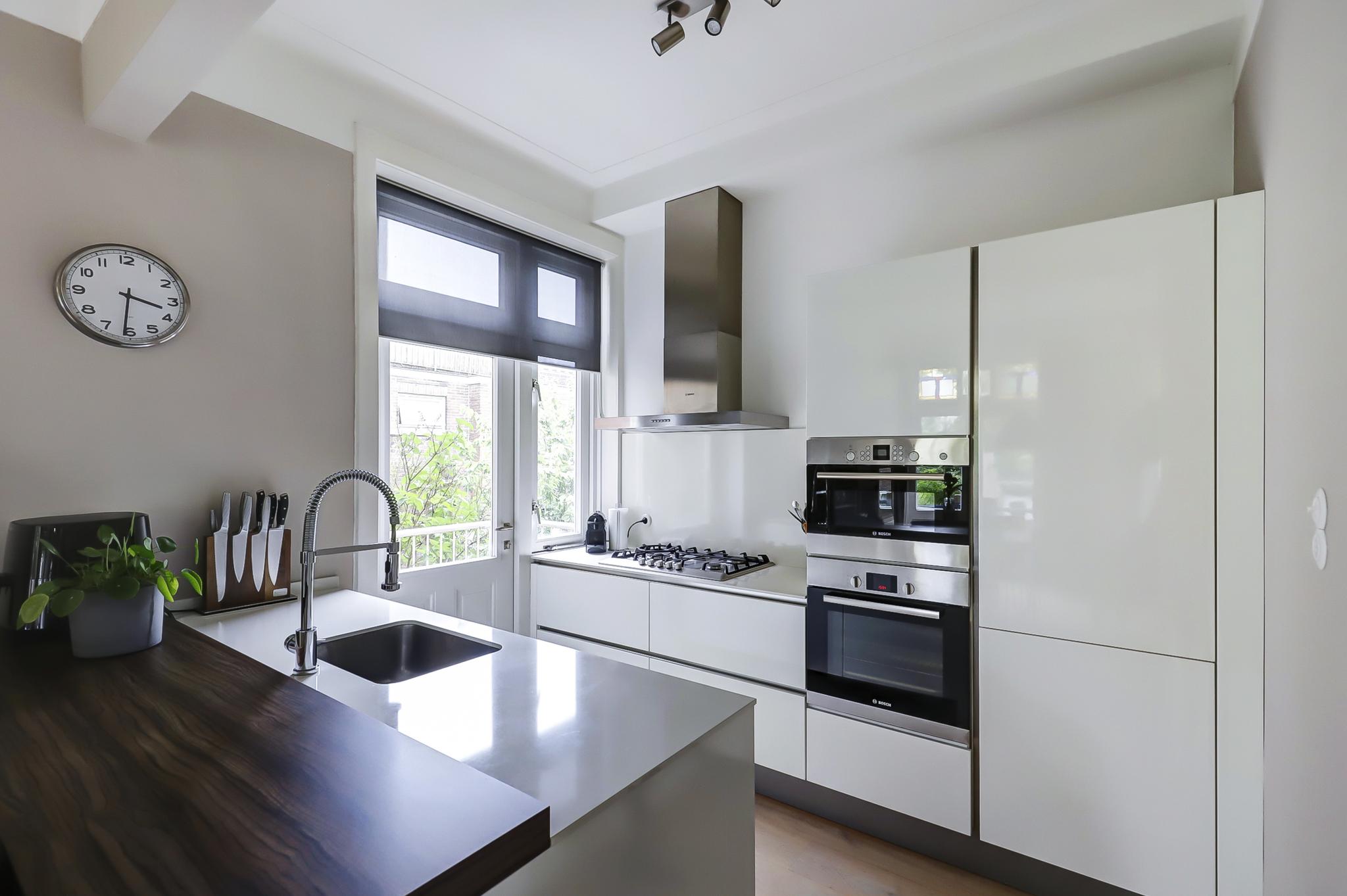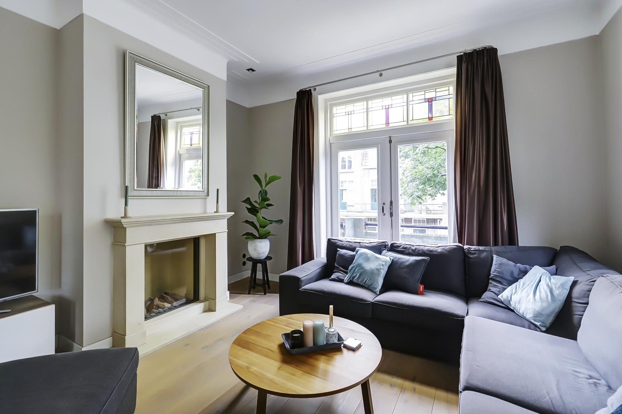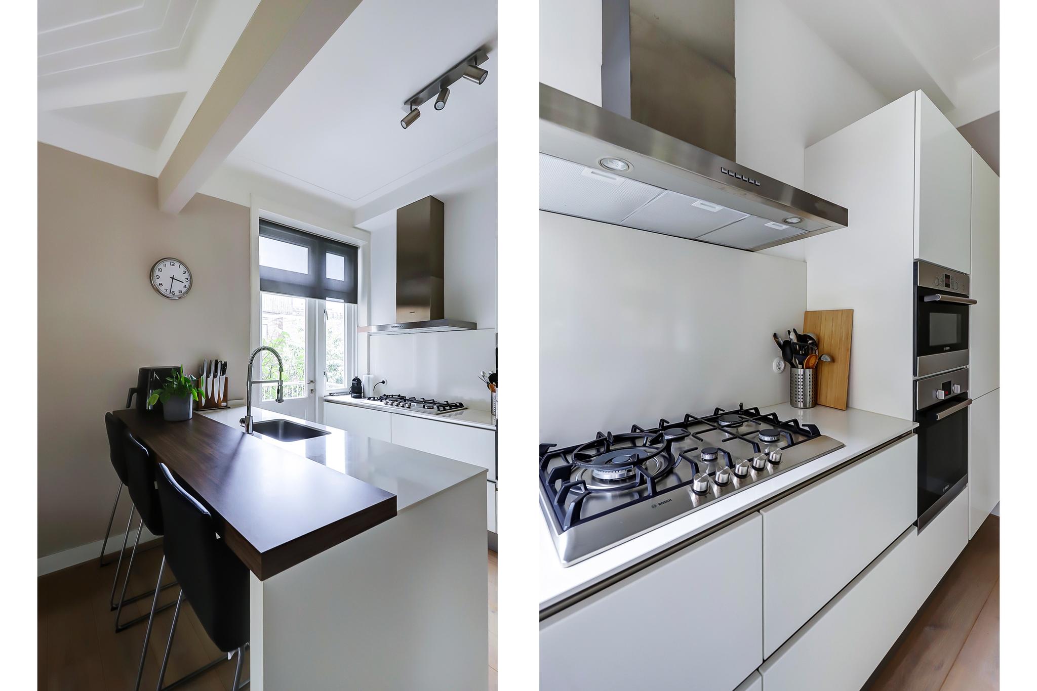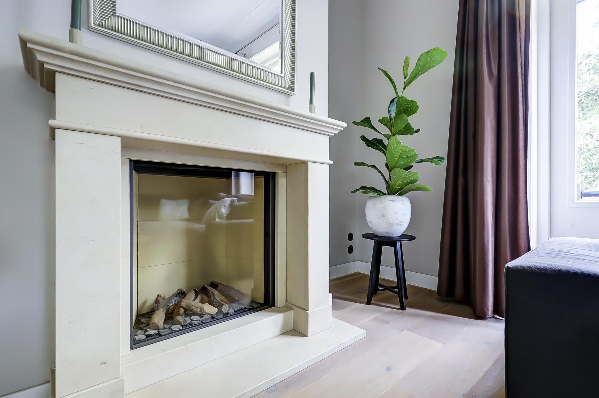 1e woonlaag: gang met toilet, slaapkamer, fraaie sfeervolle woonkamer met en-suite deuren, gashaard en 2 balkons. De open keuken is zeer strak en compleet uitgevoerd inclusief diverse Bosch inbouwapparatuur. Vanuit de keuken is het 3e balkon bereikbaar.