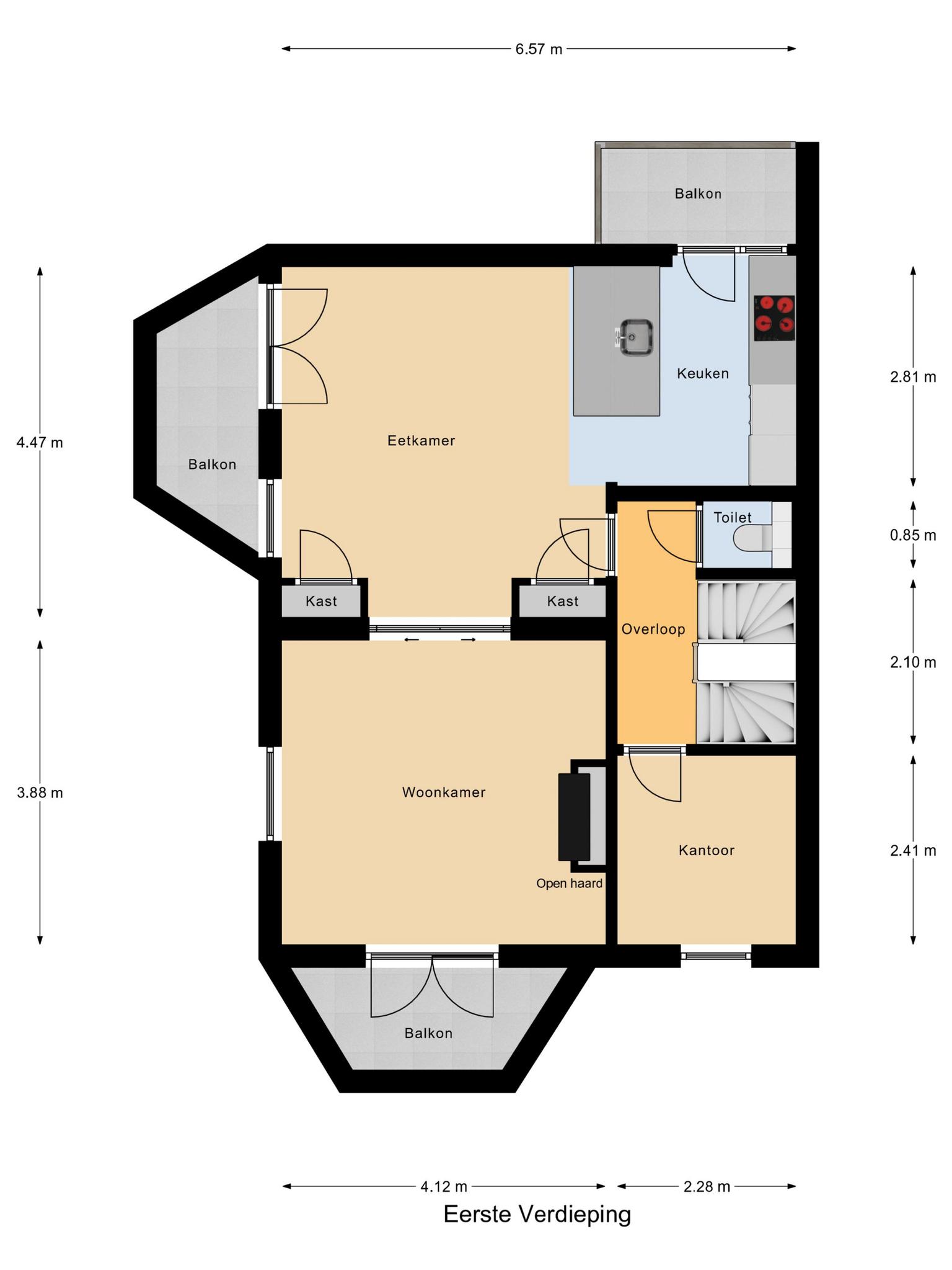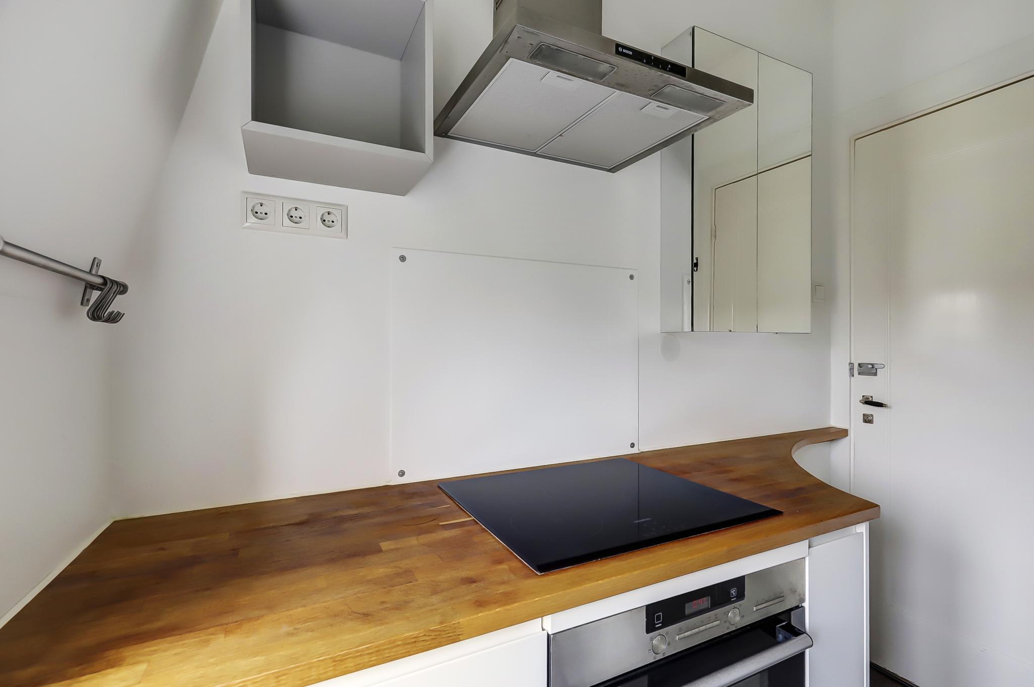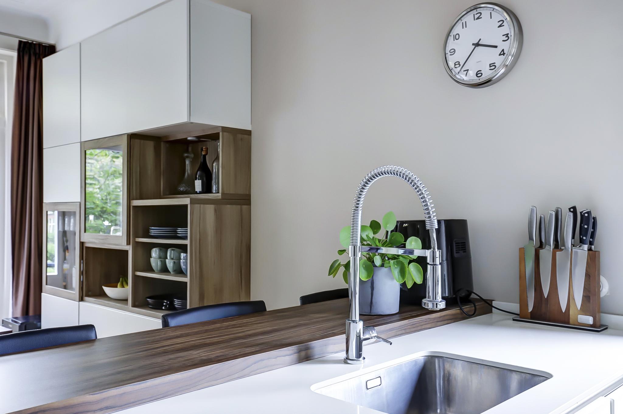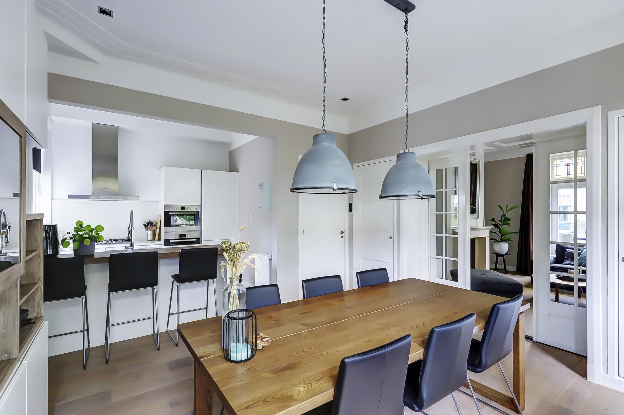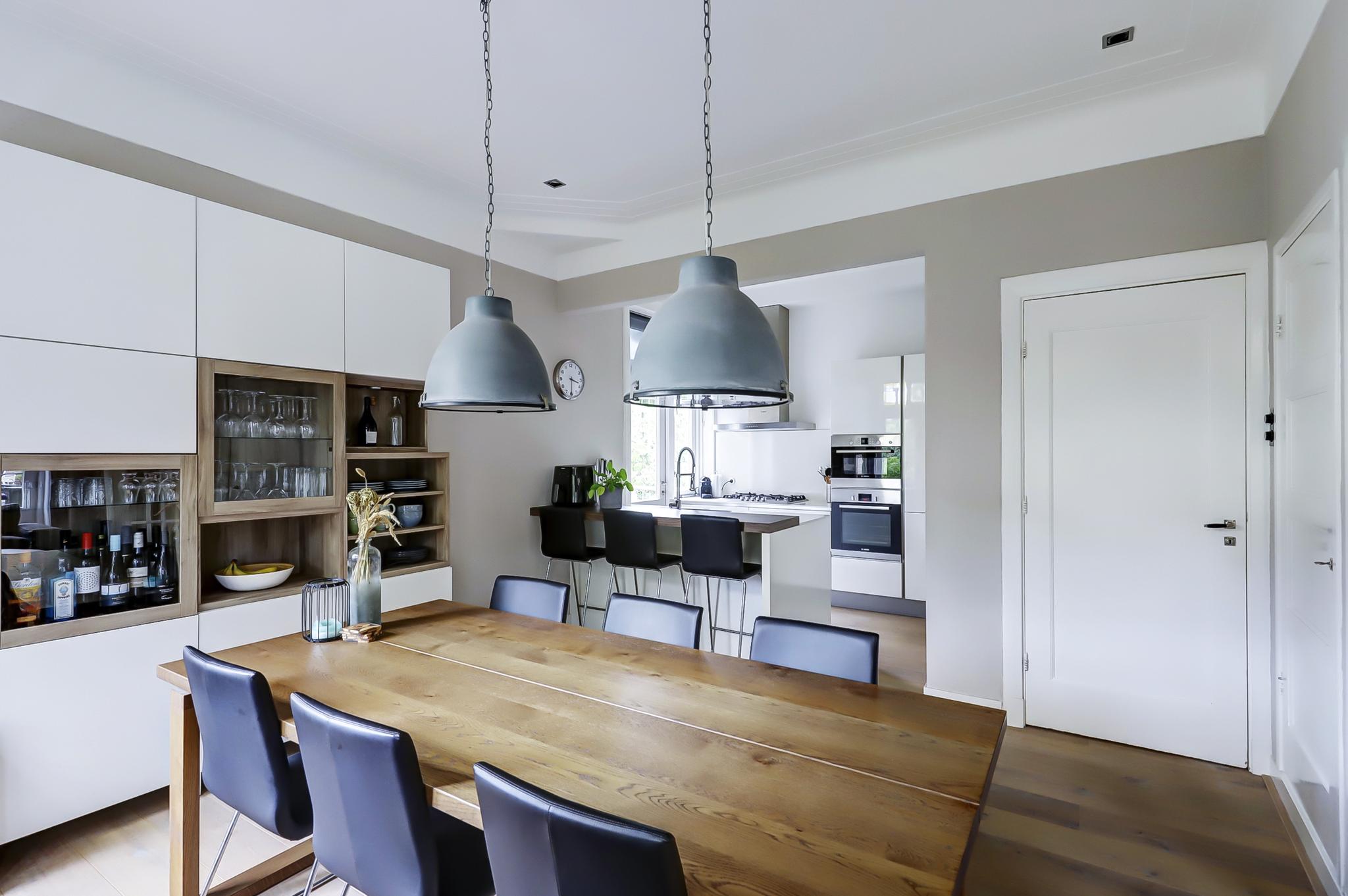 1e woonlaag: gang met toilet, slaapkamer, fraaie sfeervolle woonkamer met en-suite deuren, gashaard en 2 balkons. De open keuken is zeer strak en compleet uitgevoerd inclusief diverse Bosch inbouwapparatuur. Vanuit de keuken is het 3e balkon bereikbaar.