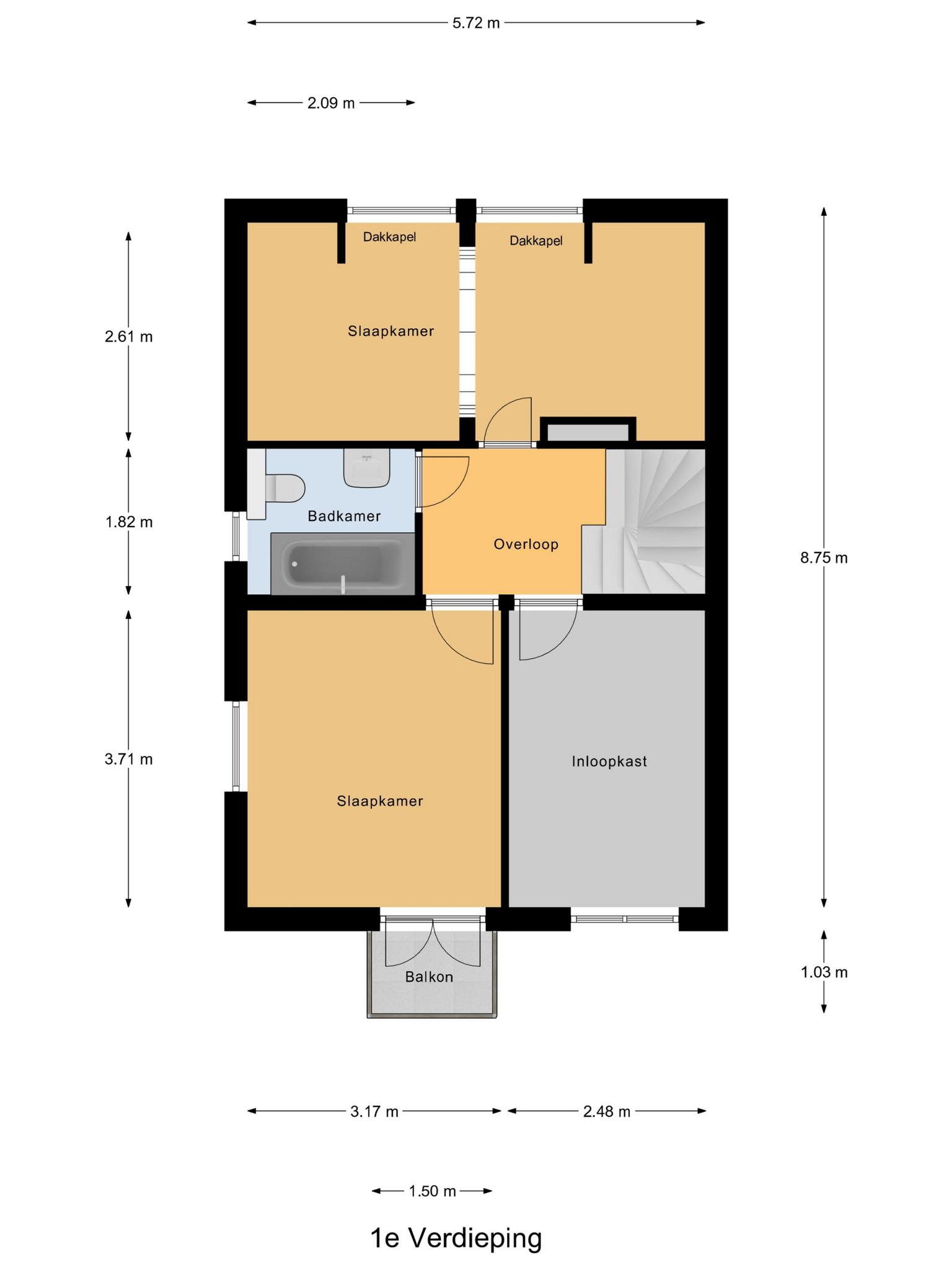 Eerste verdieping: overloop, drie slaapkamers, waarvan een kamer aan de voorzijde beschikt over een balkon op het zuiden. De volledige betegelde badkamer is voorzien van een ligbad/douche, toilet en wastafel.