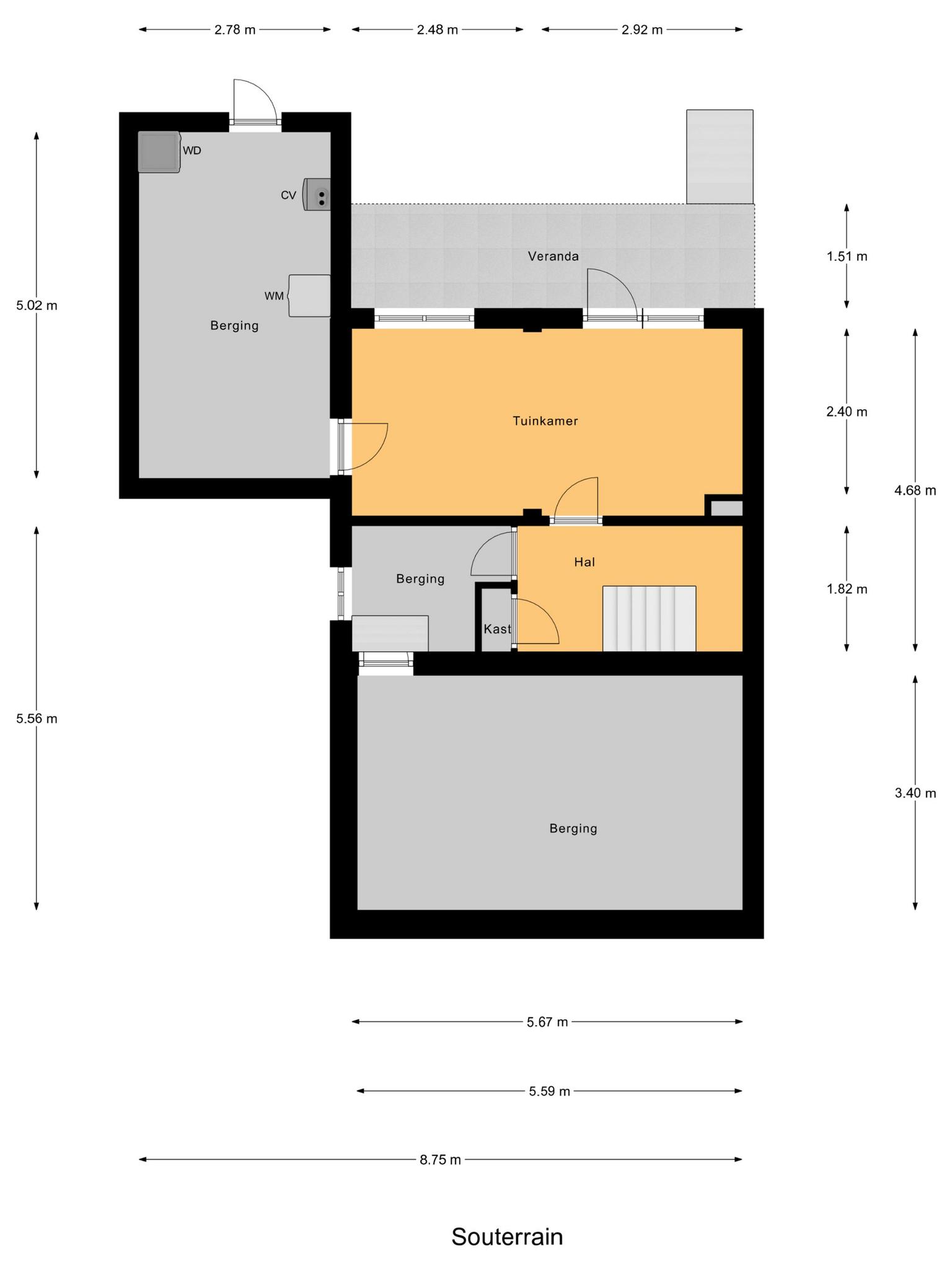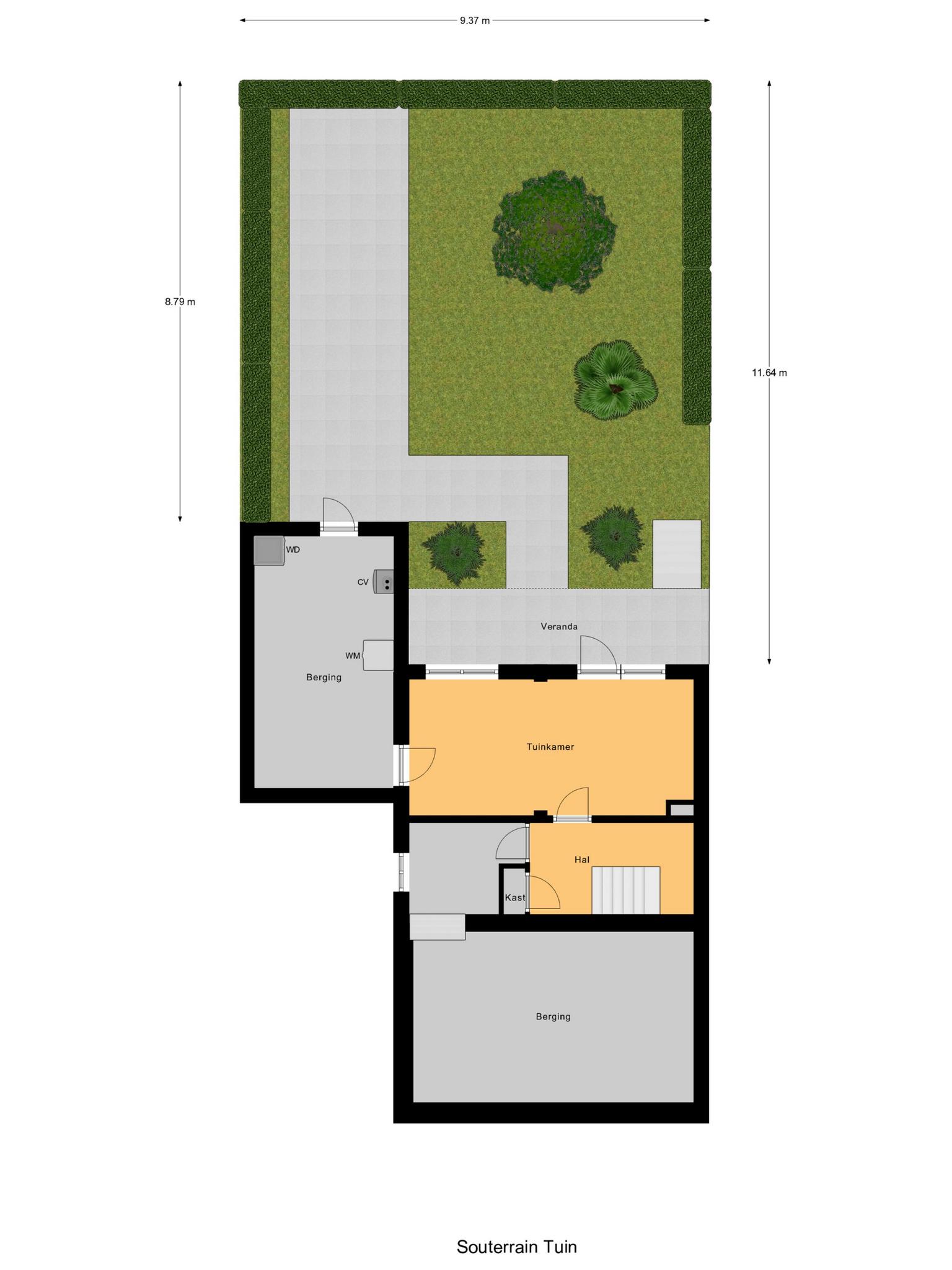 Ook vanuit de tuin is het souterrain bereikbaar. Deze ruimte is opgedeeld in een praktische berging met cv-ketel, een slaapkamer, voorportaal en bergruimte (stahoogte 2,45 meter).