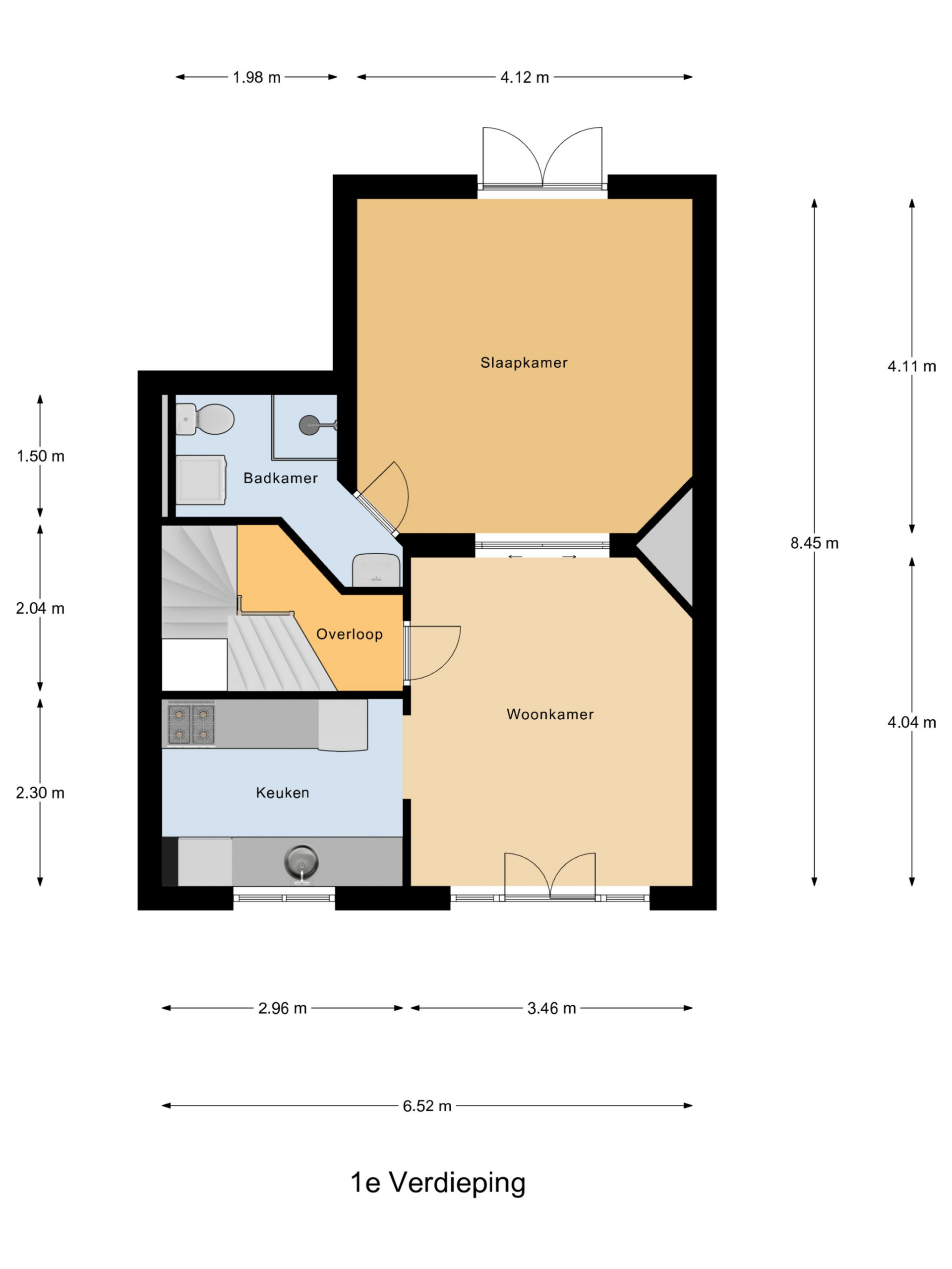 Eerste verdieping: woonkamer en-suite met aan zowel de voor- als achterzijde een balkon. De open keuken is aan de voorzijde en is voorzien van een nette, eenvoudige inrichting. Via de achterkamer is de badkamer bereikbaar. Deze heeft een douchecabine, toilet, wastafel en een wasmachine-aansluiting.