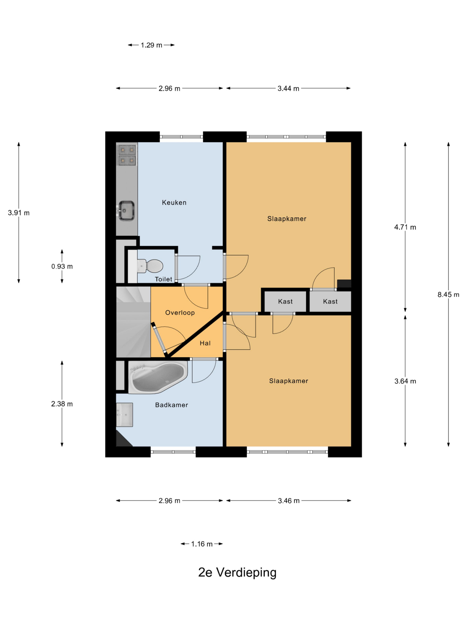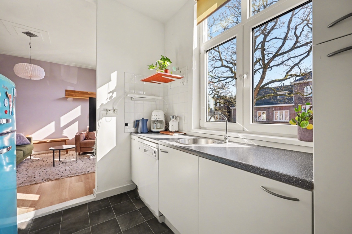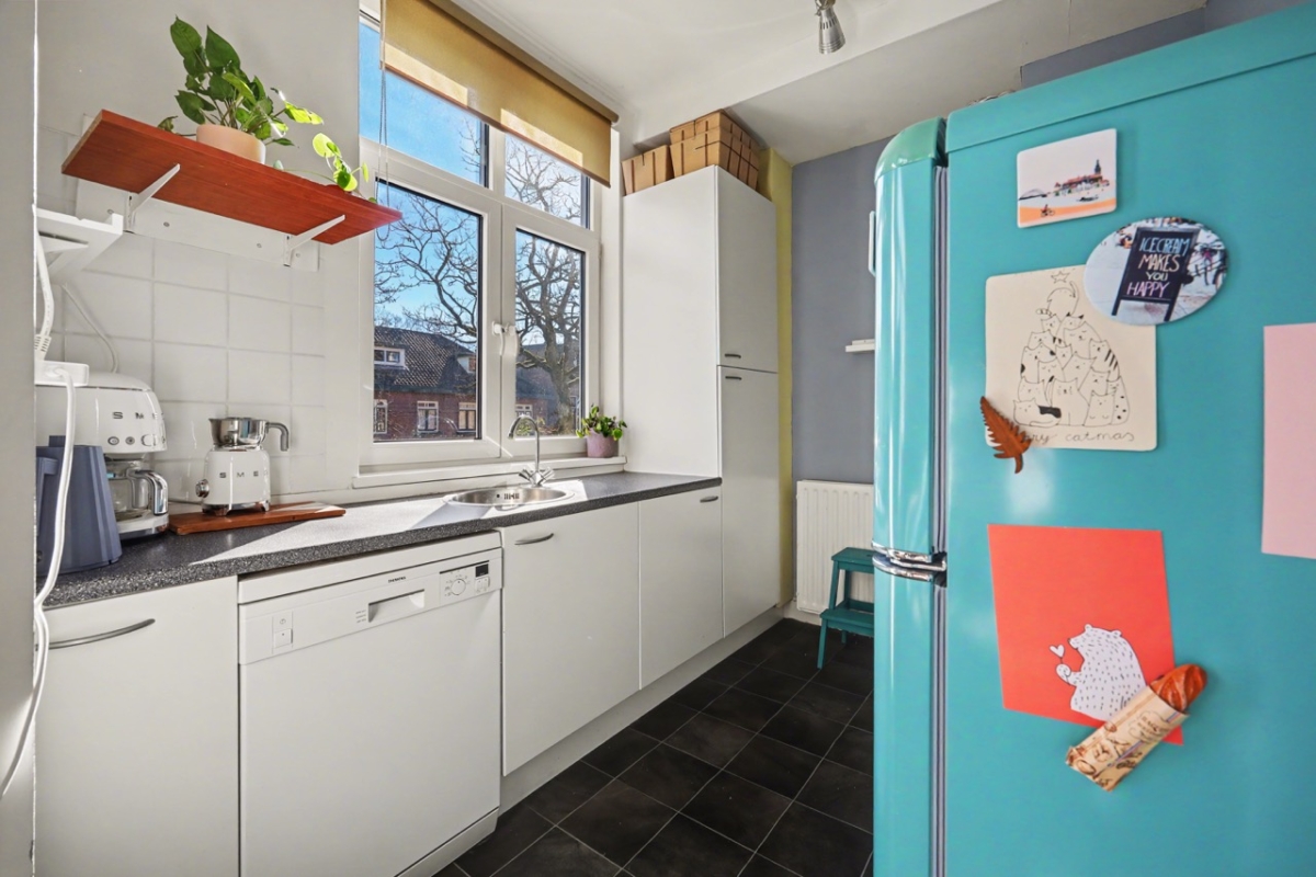 Tweede verdieping: hal, toilet, keuken met nette inrichting, slaapkamer met toegang tot 2e slaapkamer (beiden met vaste kasten). Via de 2e slaapkamer is de badkamer bereikbaar, die is uitgerust met ligbad/douche, wastafel en wasmachine-aansluiting.
