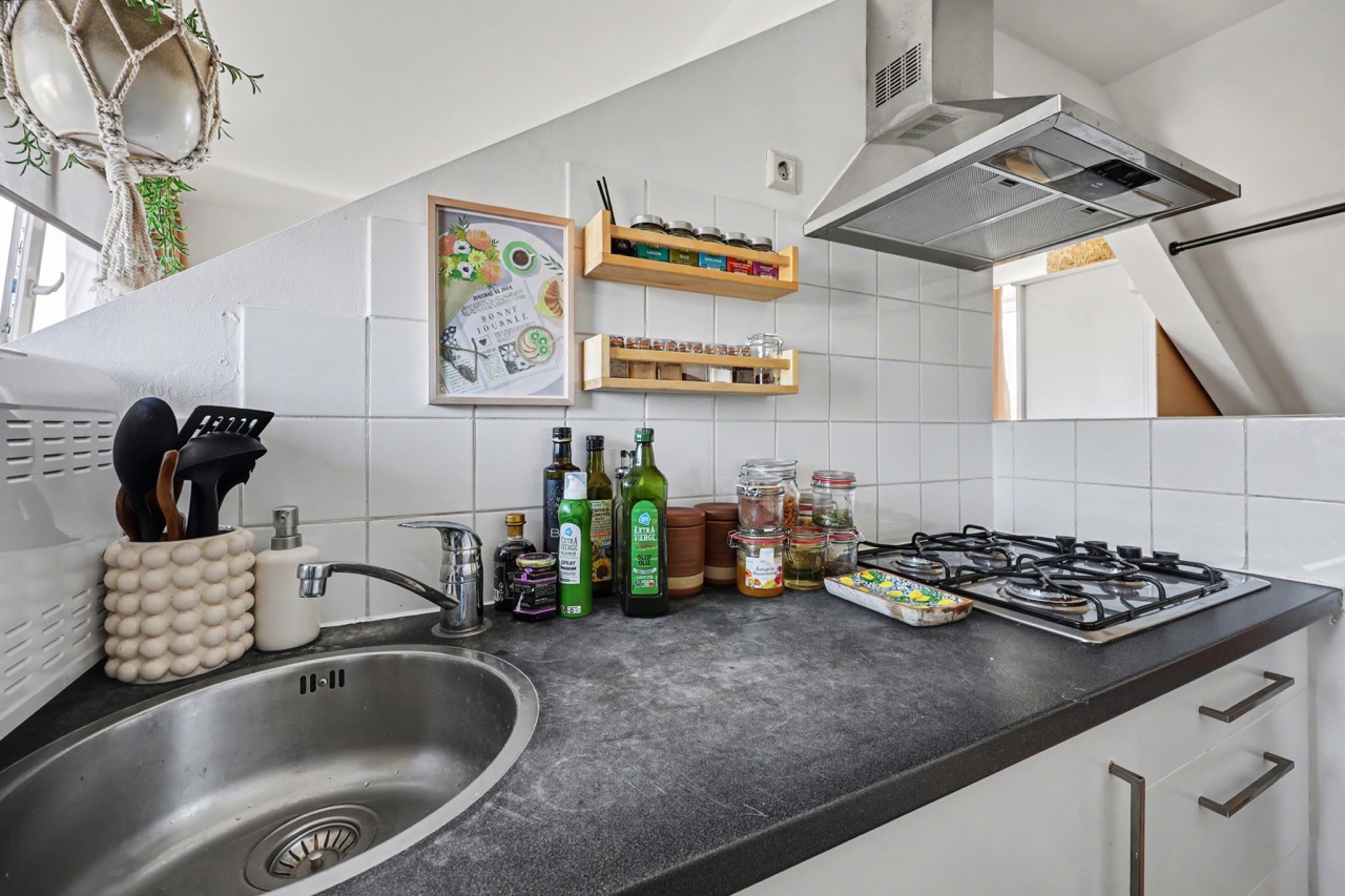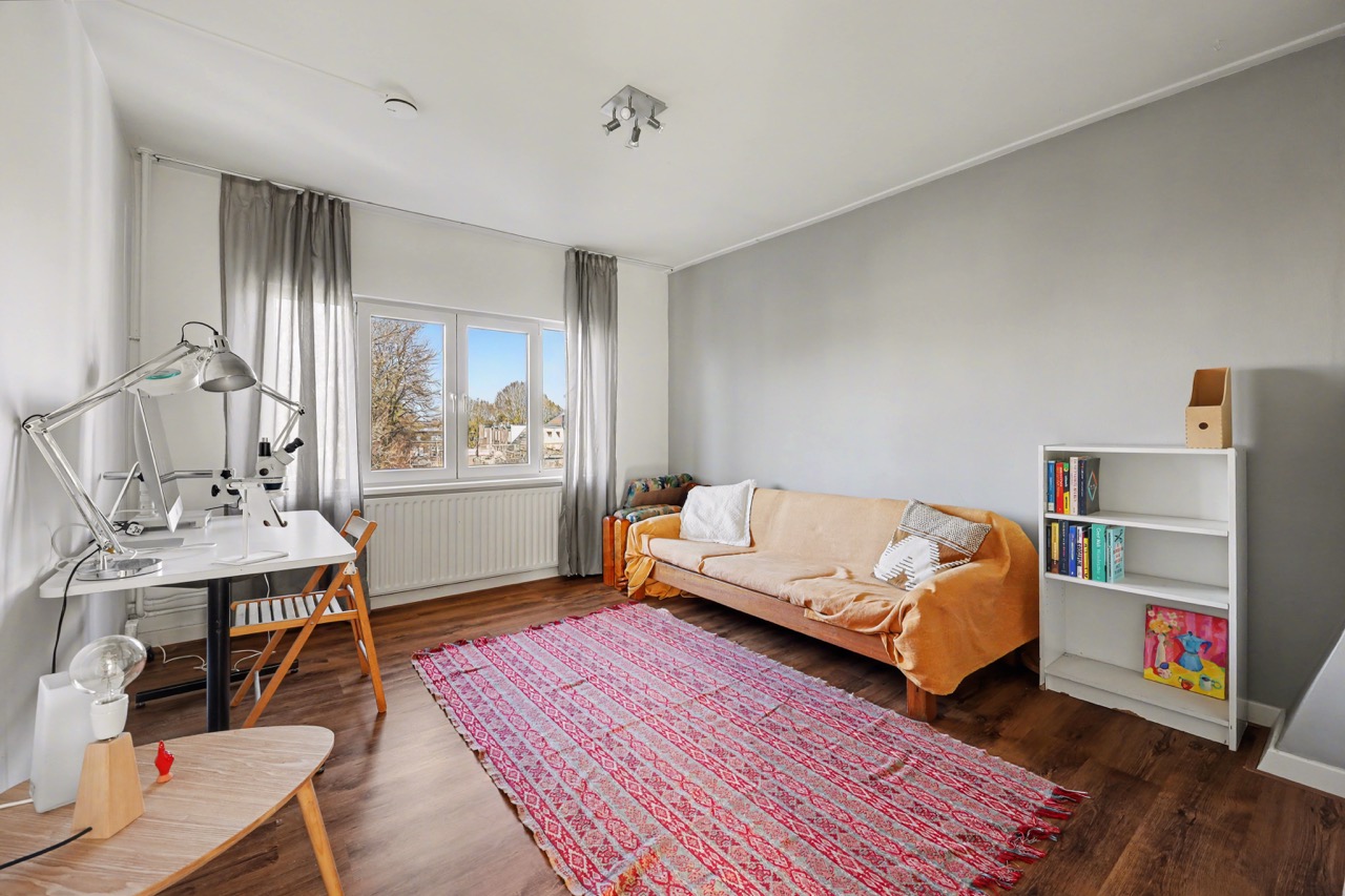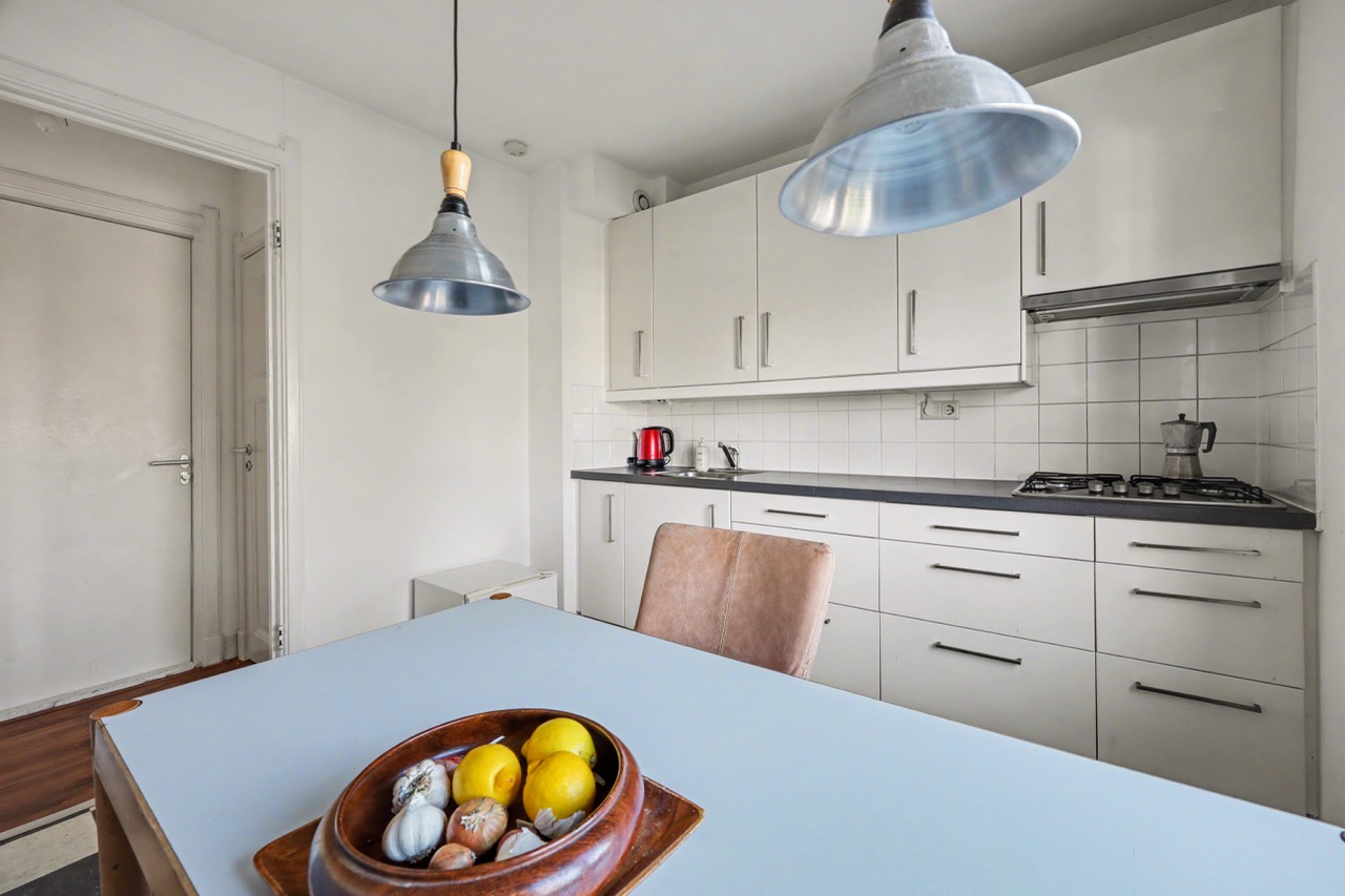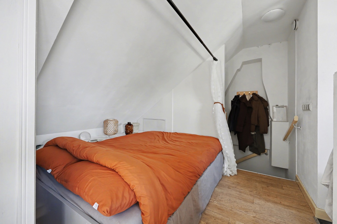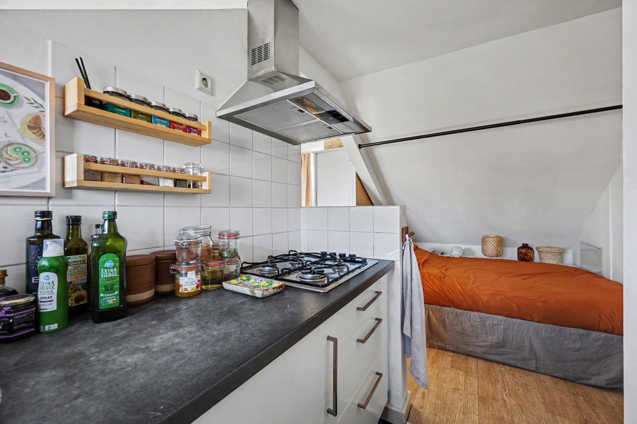 Derde verdieping: mooie lichte zolderverdieping met dakkapellen, open keuken met complete inrichting, toegang tot badkamer die is voorzien van een douche, wastafel, toilet en wasmachine-aansluiting. Verder is er een woon-/slaapkamer en de nodige bergruimte onder de schuine daklijn.