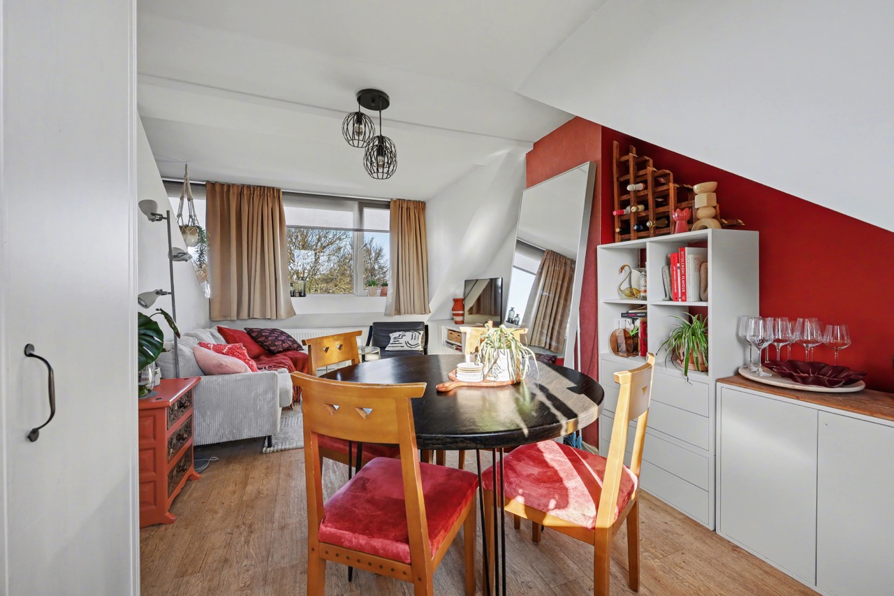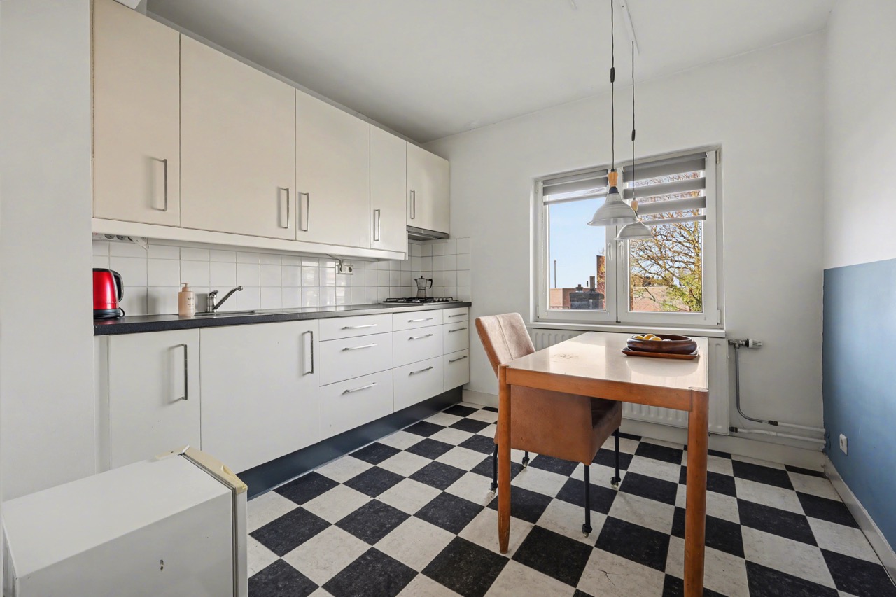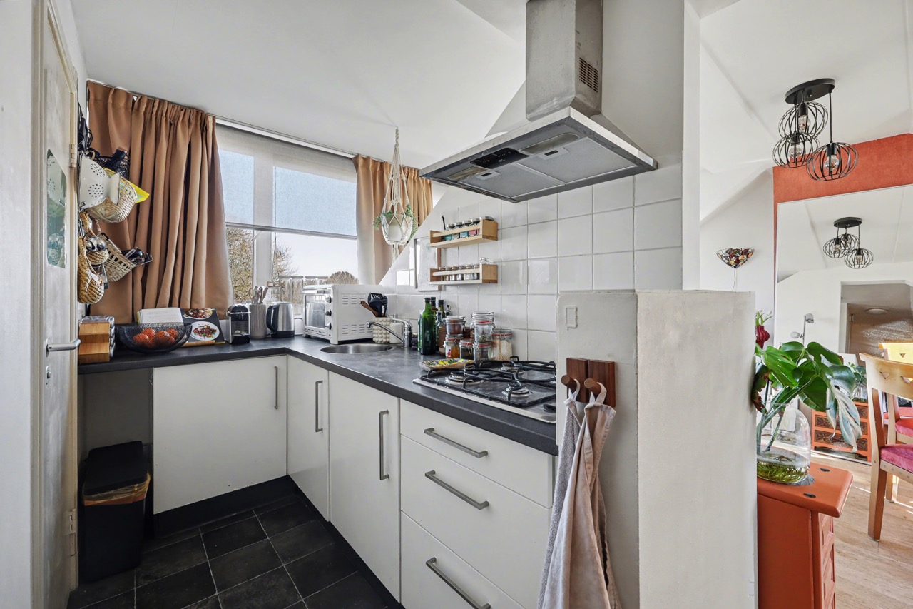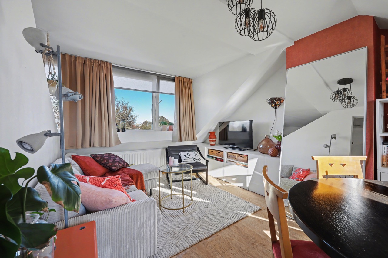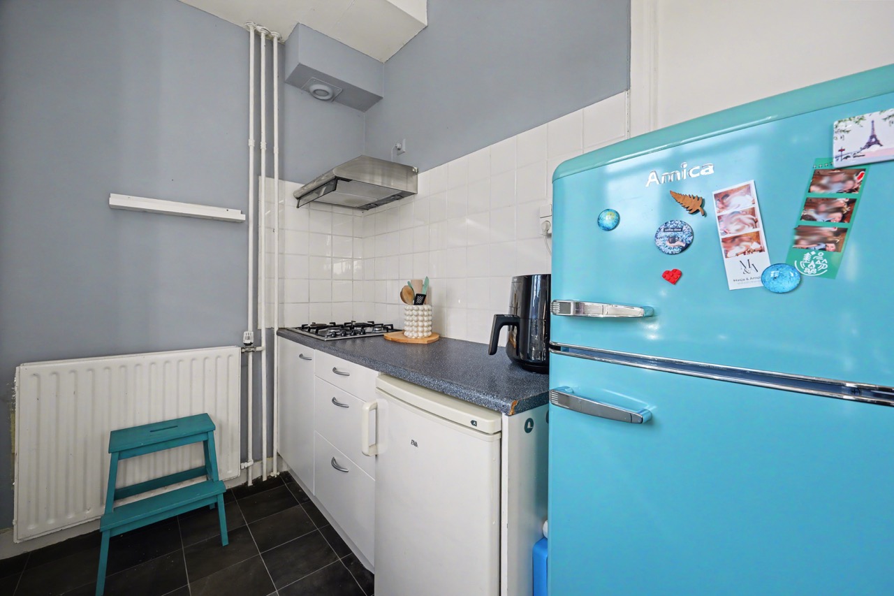 Derde verdieping: mooie lichte zolderverdieping met dakkapellen, open keuken met complete inrichting, toegang tot badkamer die is voorzien van een douche, wastafel, toilet en wasmachine-aansluiting. Verder is er een woon-/slaapkamer en de nodige bergruimte onder de schuine daklijn.