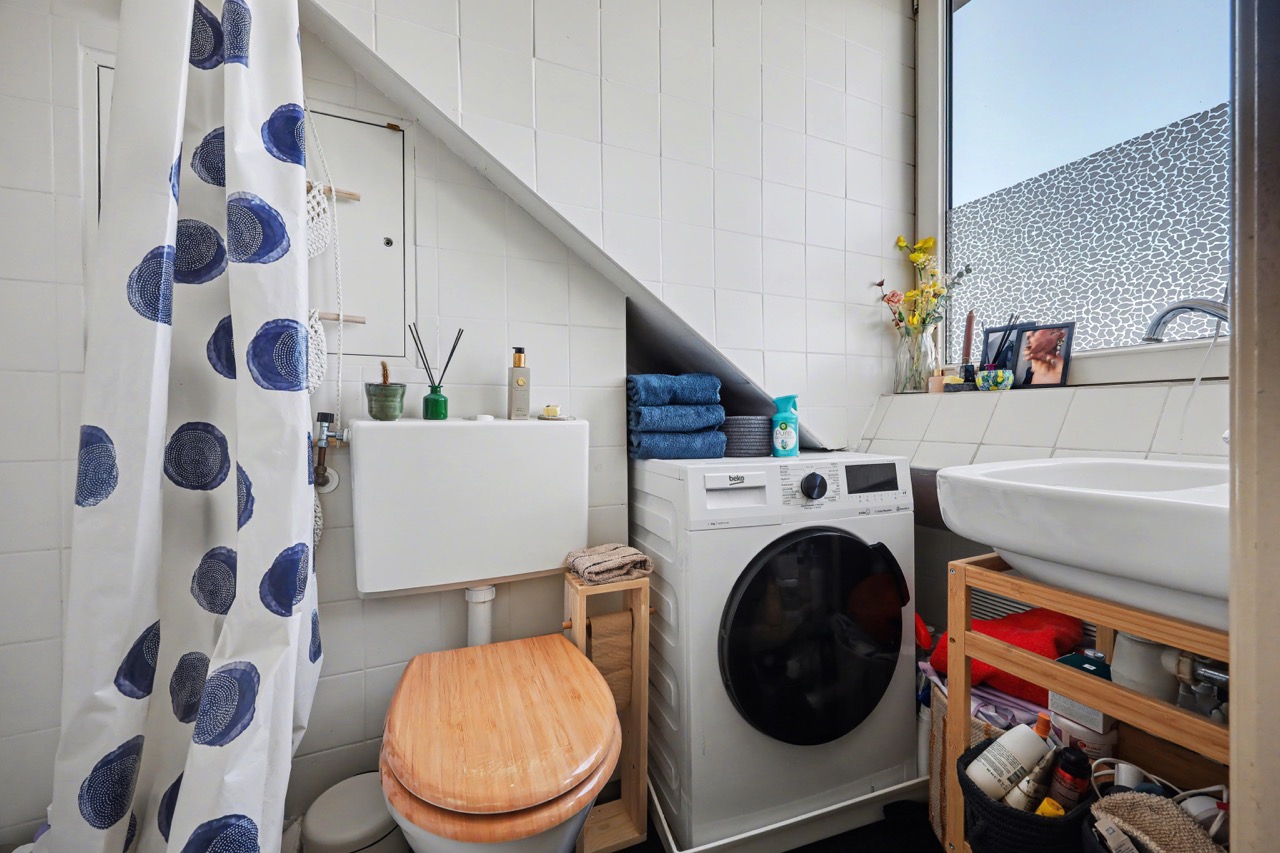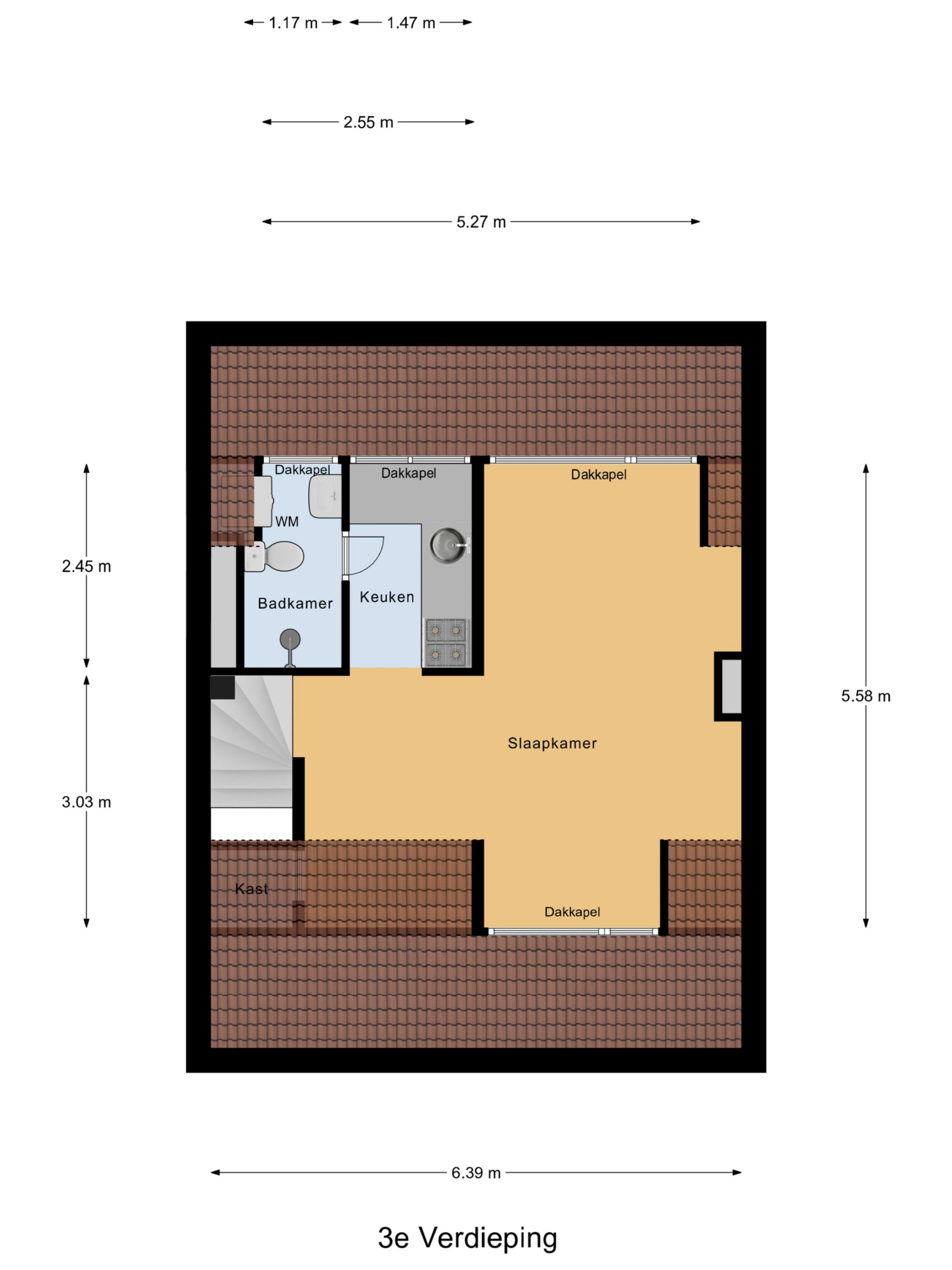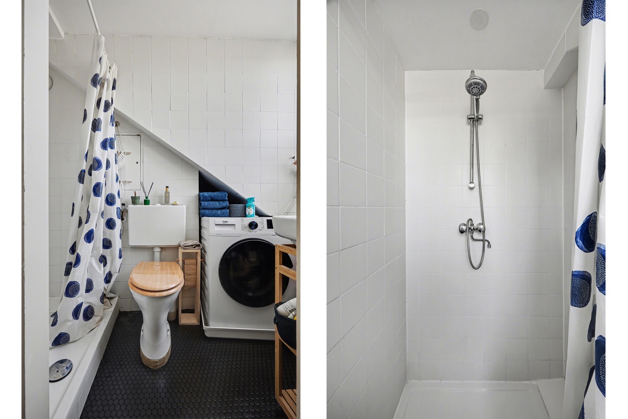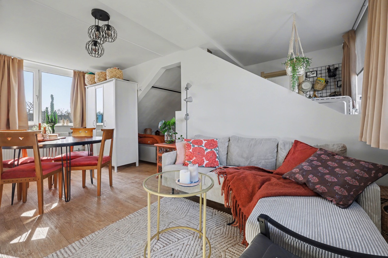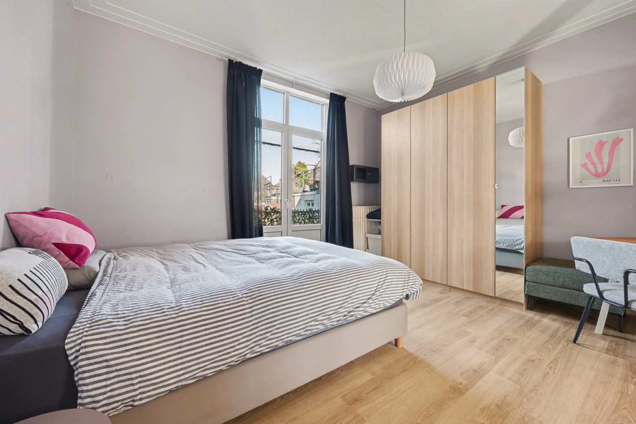 Derde verdieping: mooie lichte zolderverdieping met dakkapellen, open keuken met complete inrichting, toegang tot badkamer die is voorzien van een douche, wastafel, toilet en wasmachine-aansluiting. Verder is er een woon-/slaapkamer en de nodige bergruimte onder de schuine daklijn.