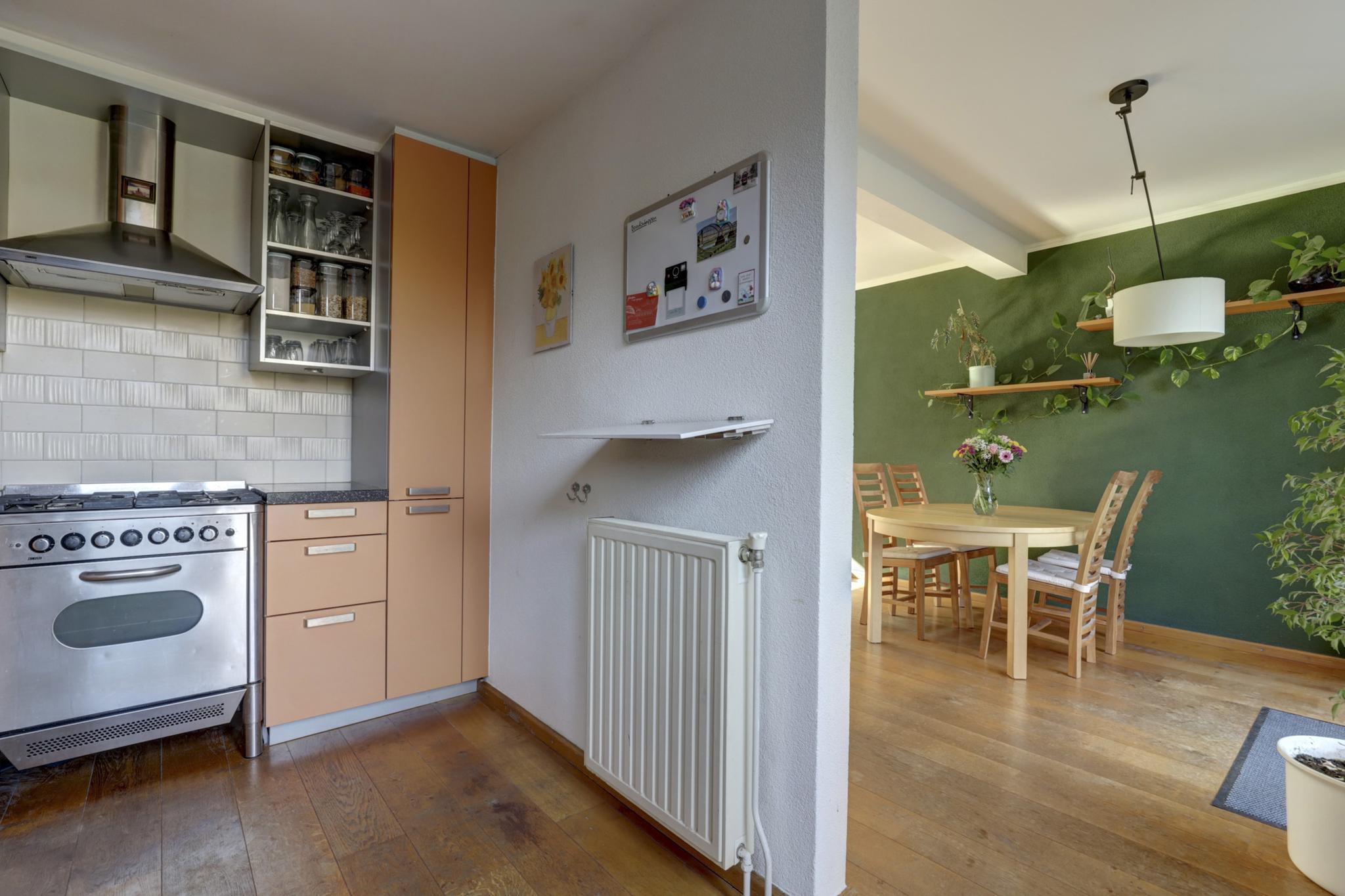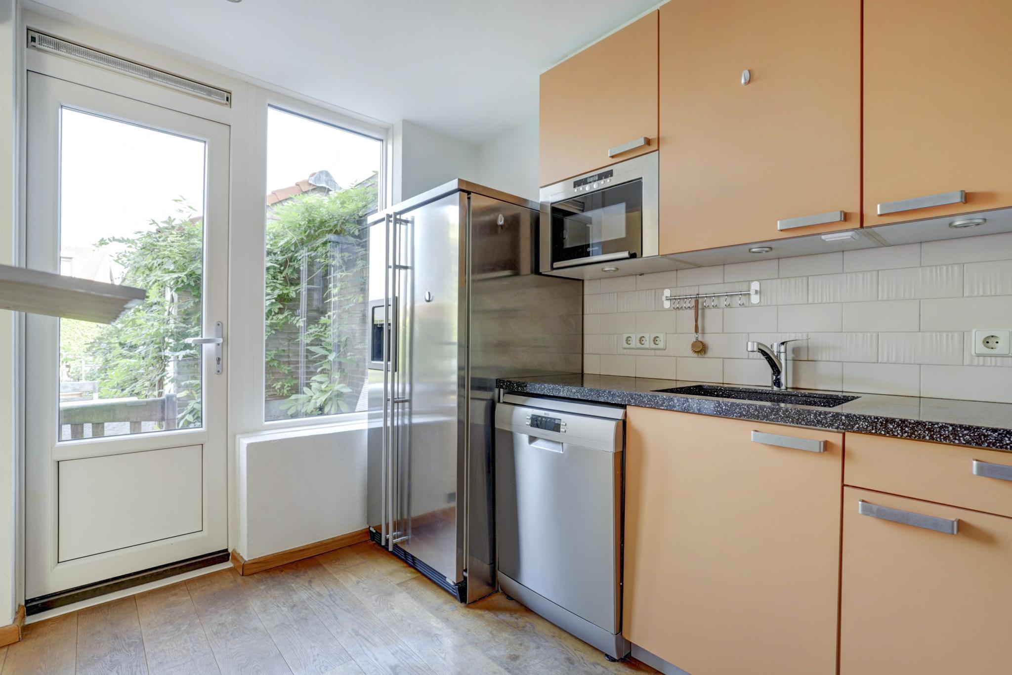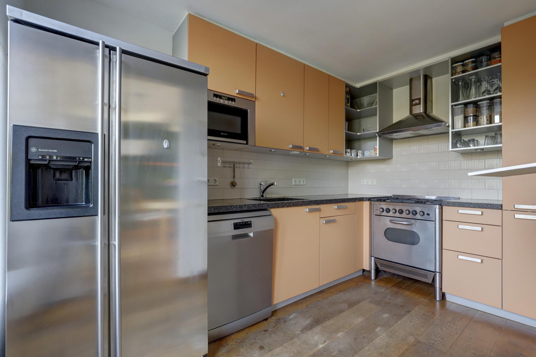 Begane grond: entree, gang, toilet, kelder met meterkast, lichte doorzonwoonkamer, open keuken met moderne inrichting inclusief diverse inbouwapparatuur en een RVS-oven en RVS-koelkast.