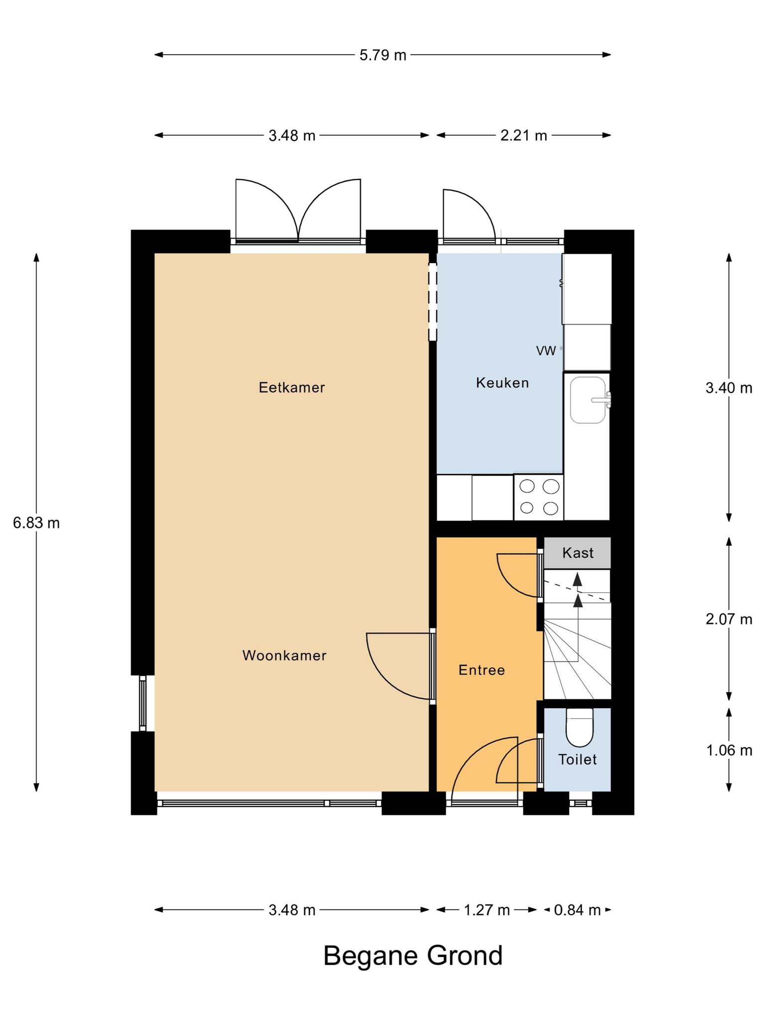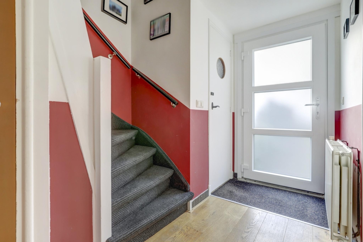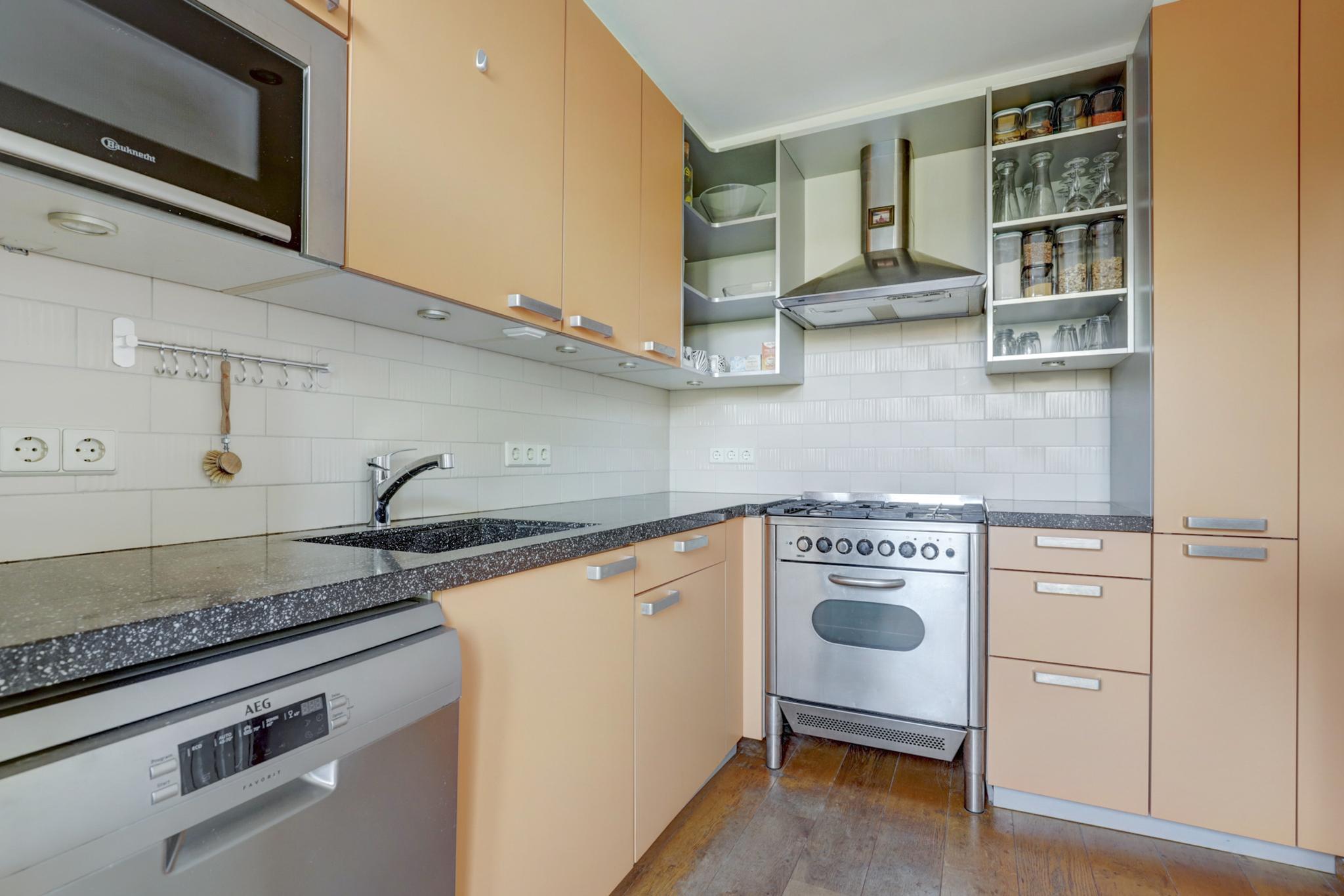 Begane grond: entree, gang, toilet, kelder met meterkast, lichte doorzonwoonkamer, open keuken met moderne inrichting inclusief diverse inbouwapparatuur en een RVS-oven en RVS-koelkast.