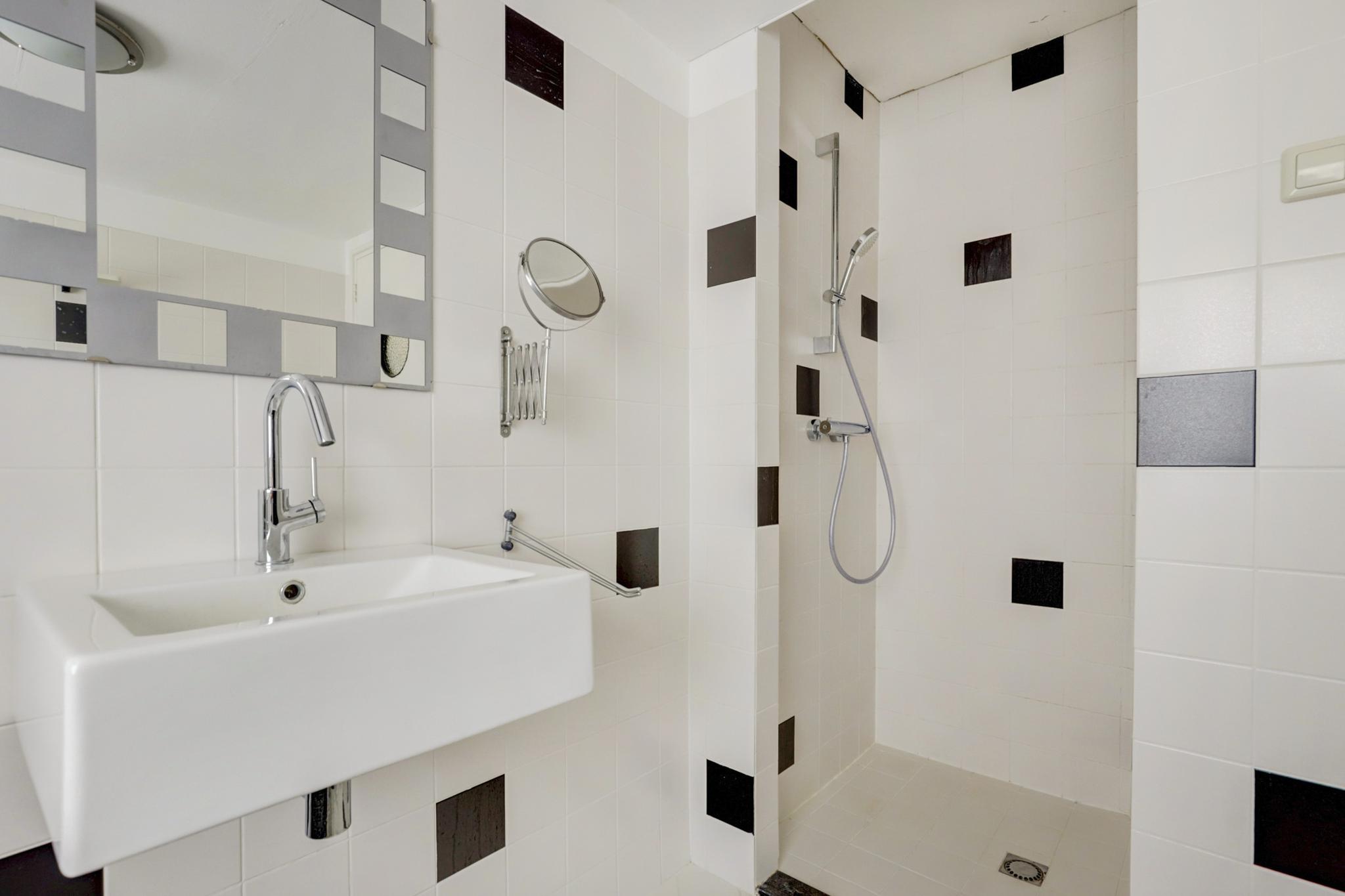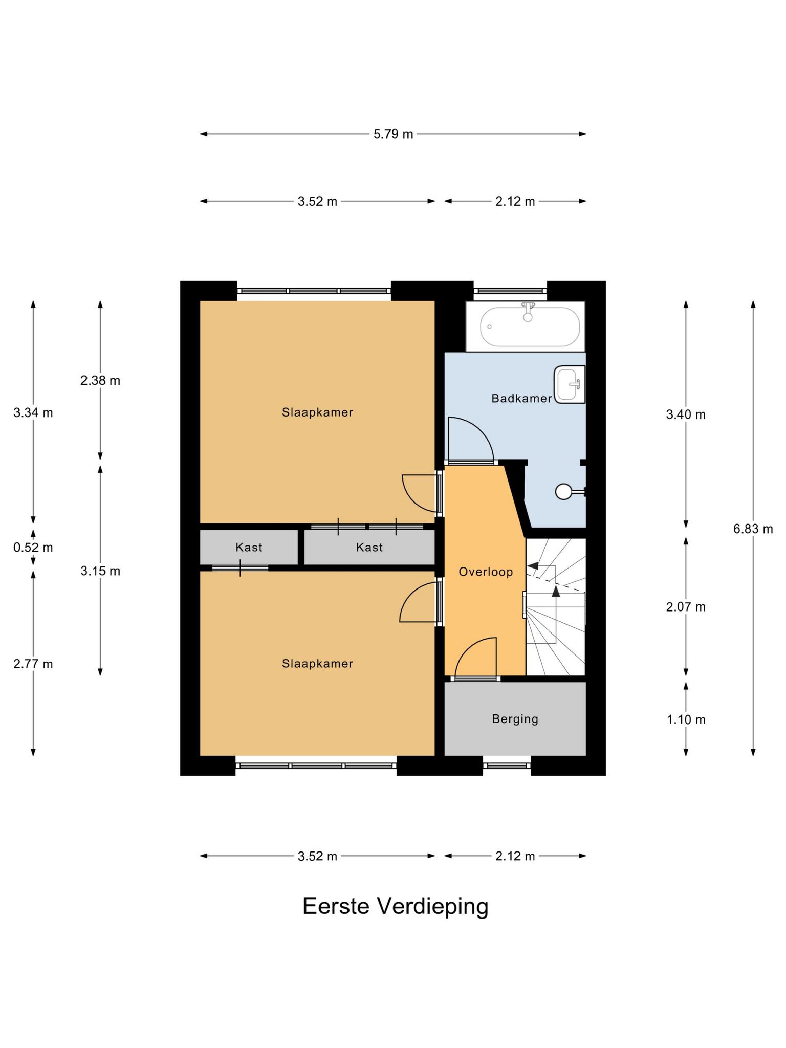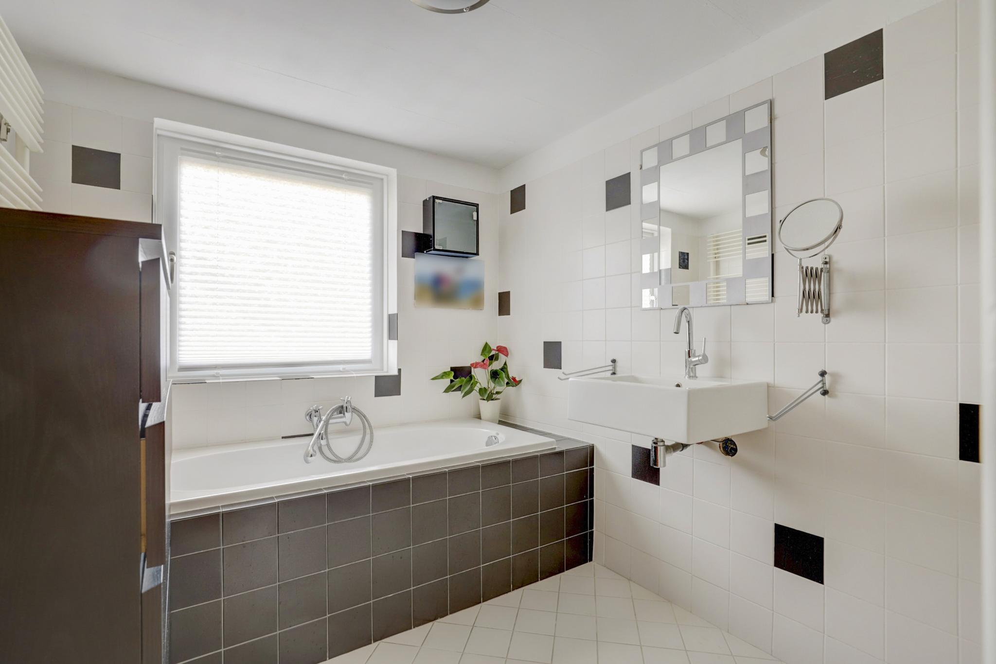 Eerste verdieping: overloop, voormalige badkamer (nu in gebruik als wasruimte), 2 slaapkamers, badkamer met ligbad, douche en wastafel.