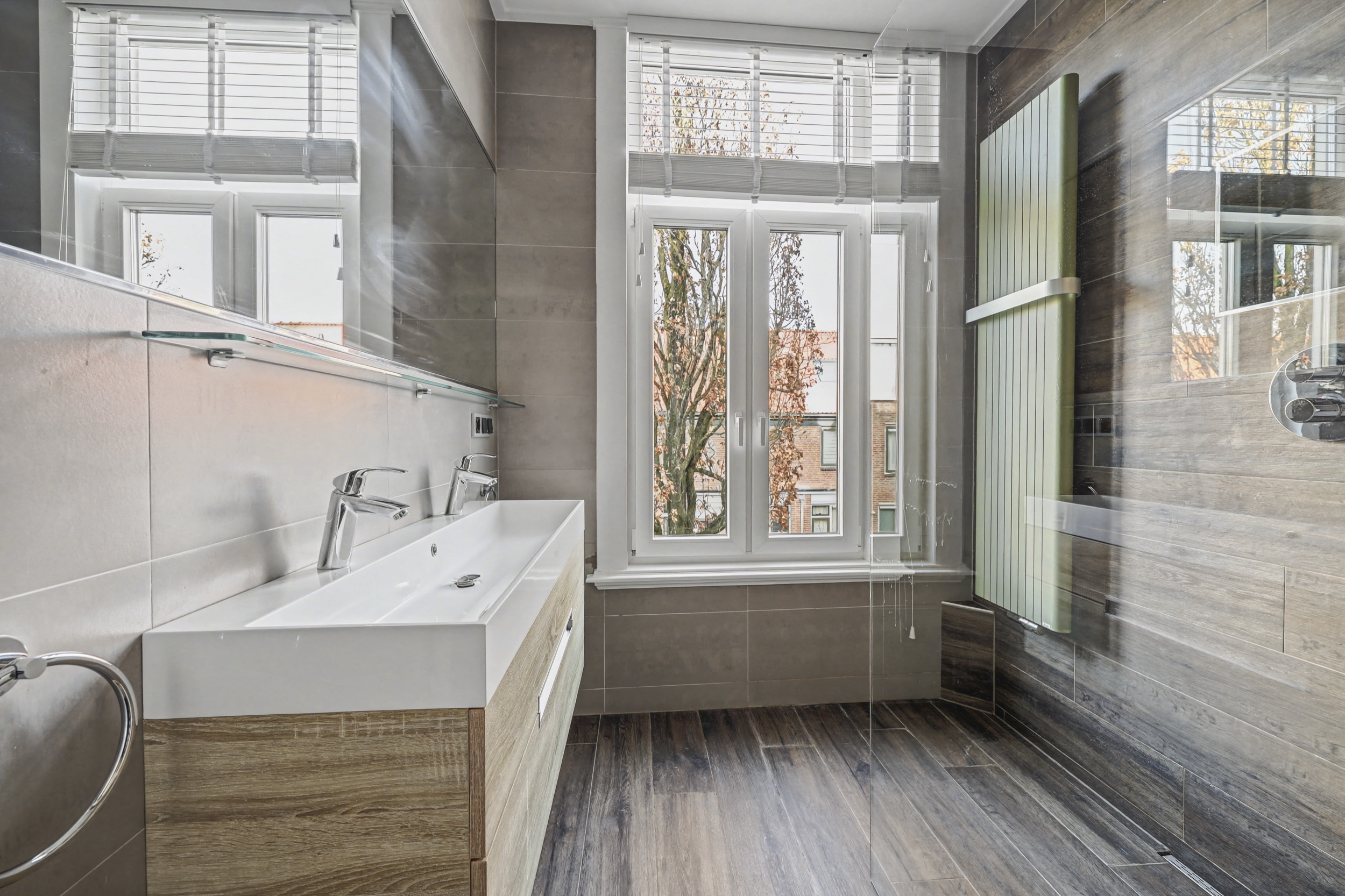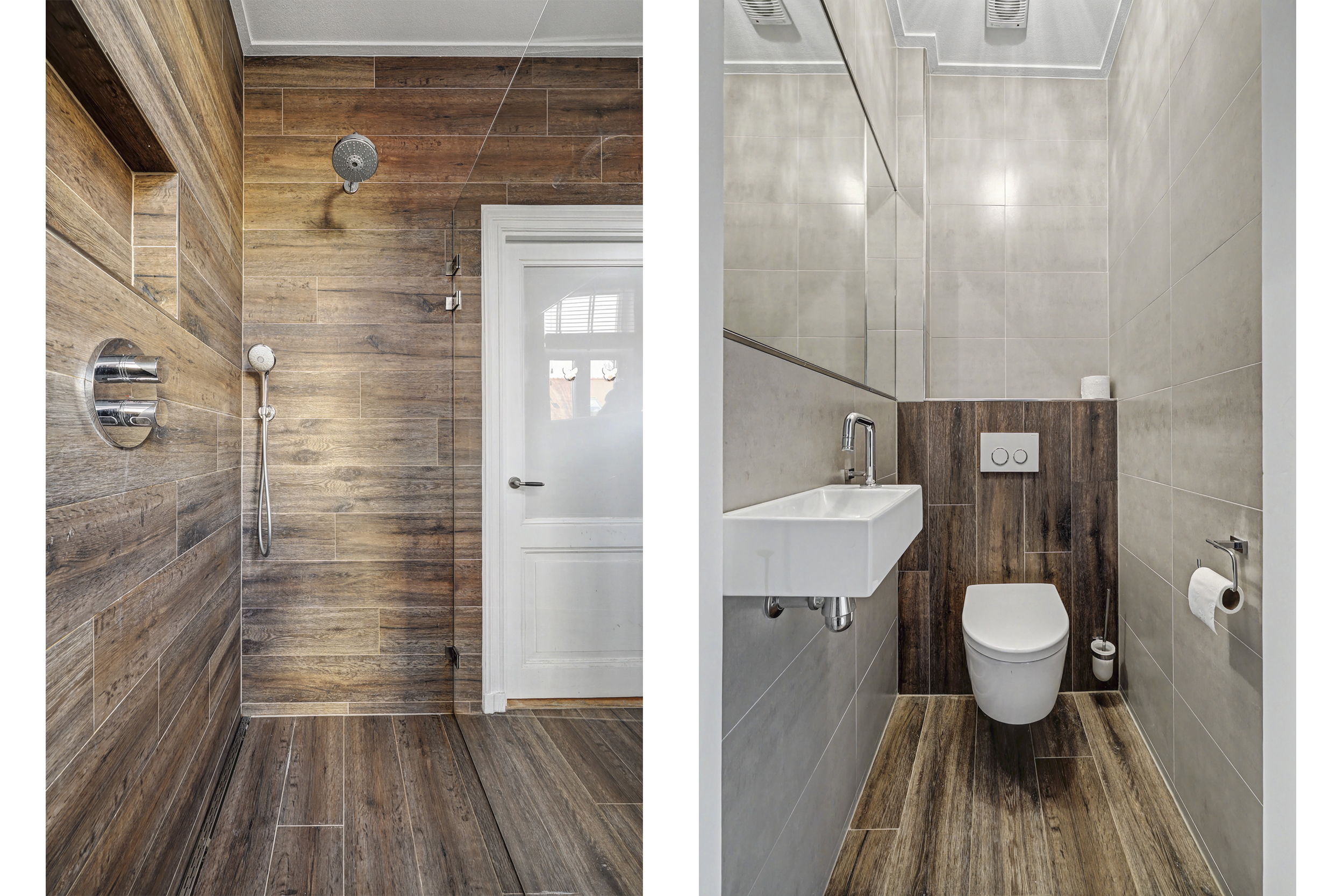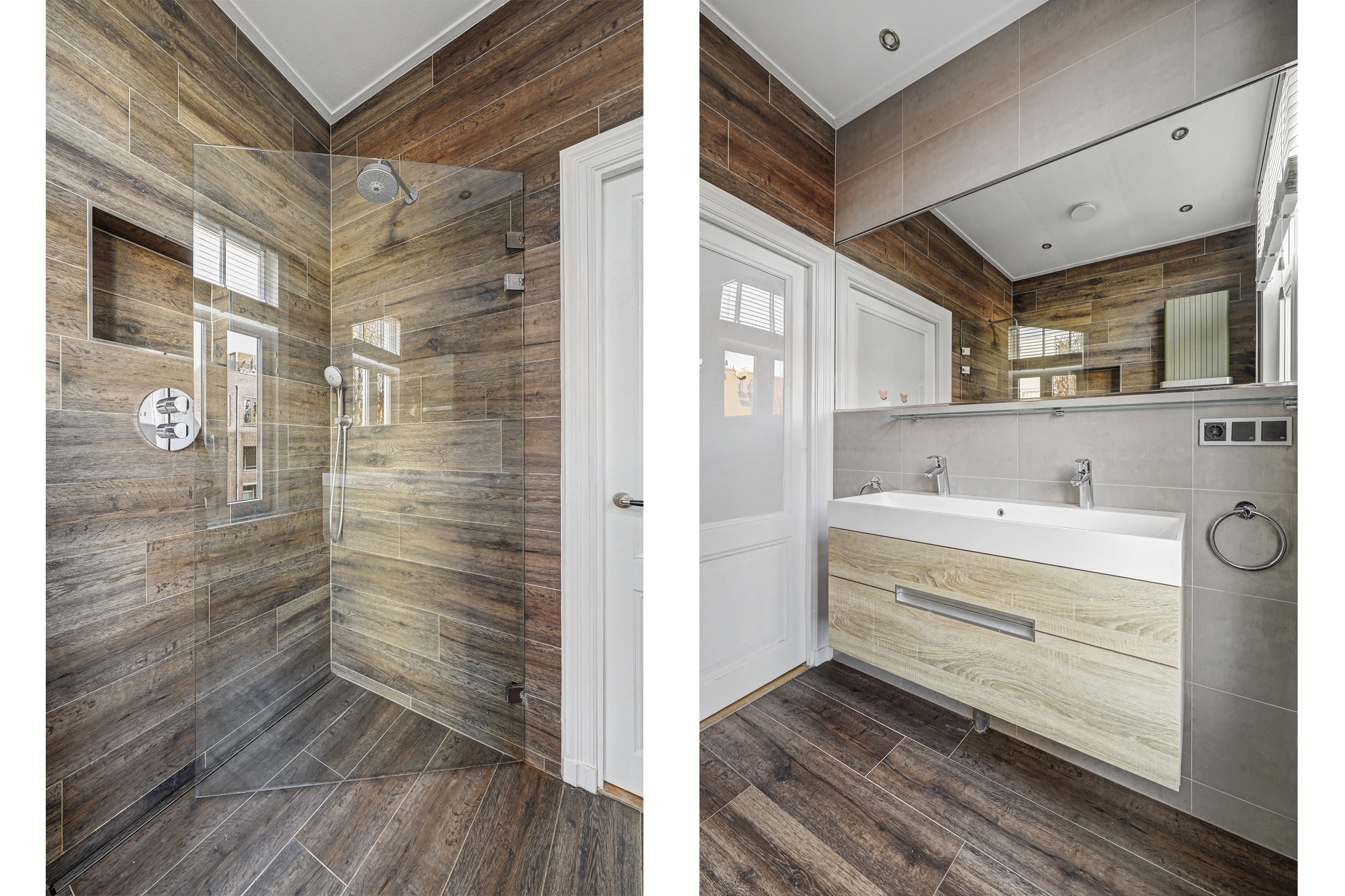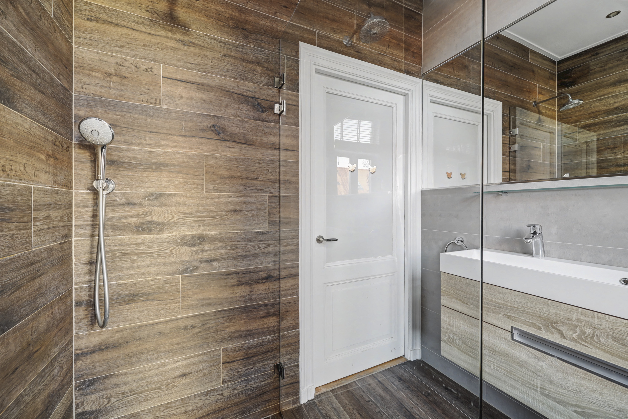 overloop/gang, toilet met wandcloset, fonteintje en grote geïntegreerde spiegel. De recent gerenoveerde badkamer is voorzien van een douche met inklapbare glazen wand, een wastafelmeubel met veel bergruimte en eveneens een grote spiegel (met spiegelverwarming).