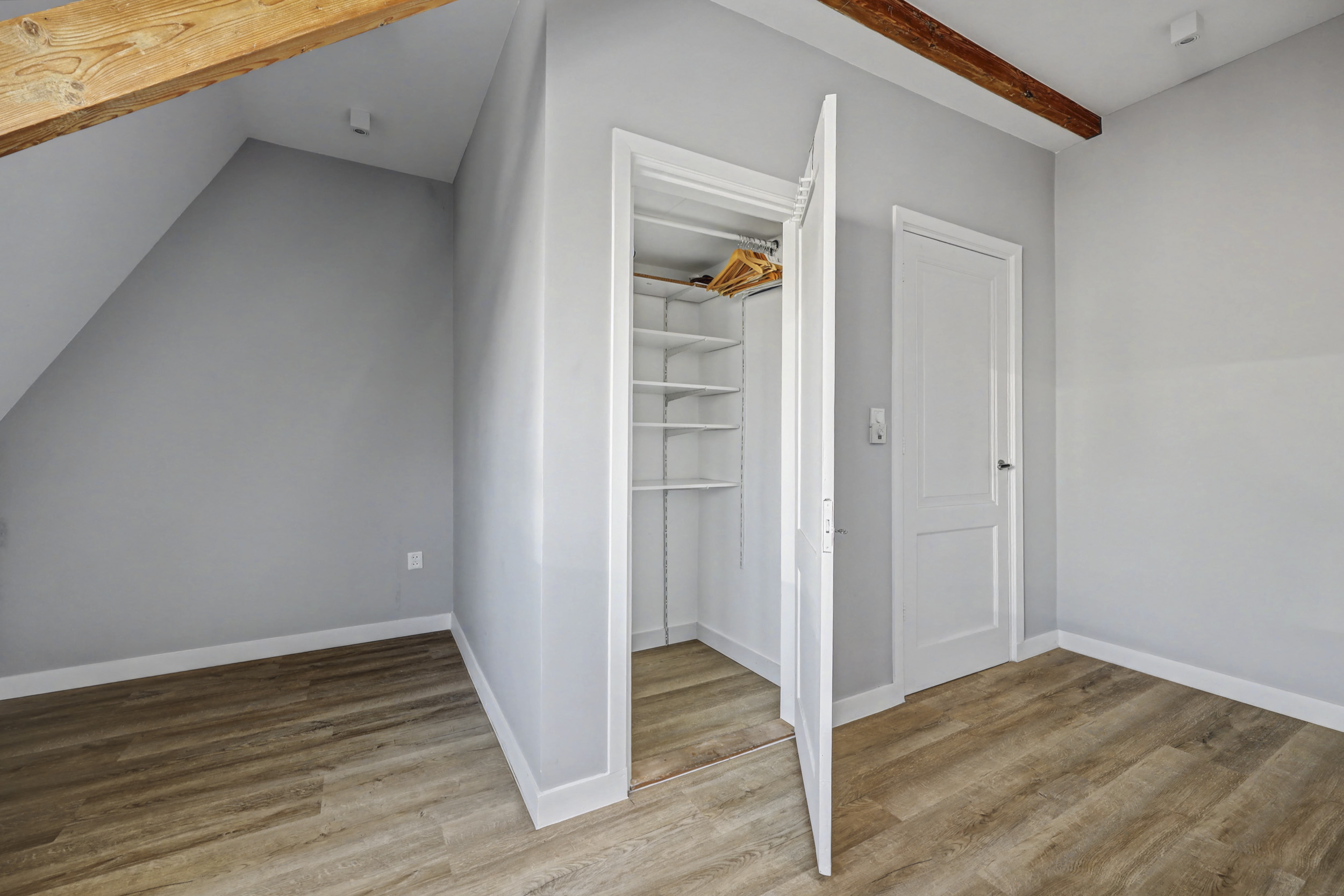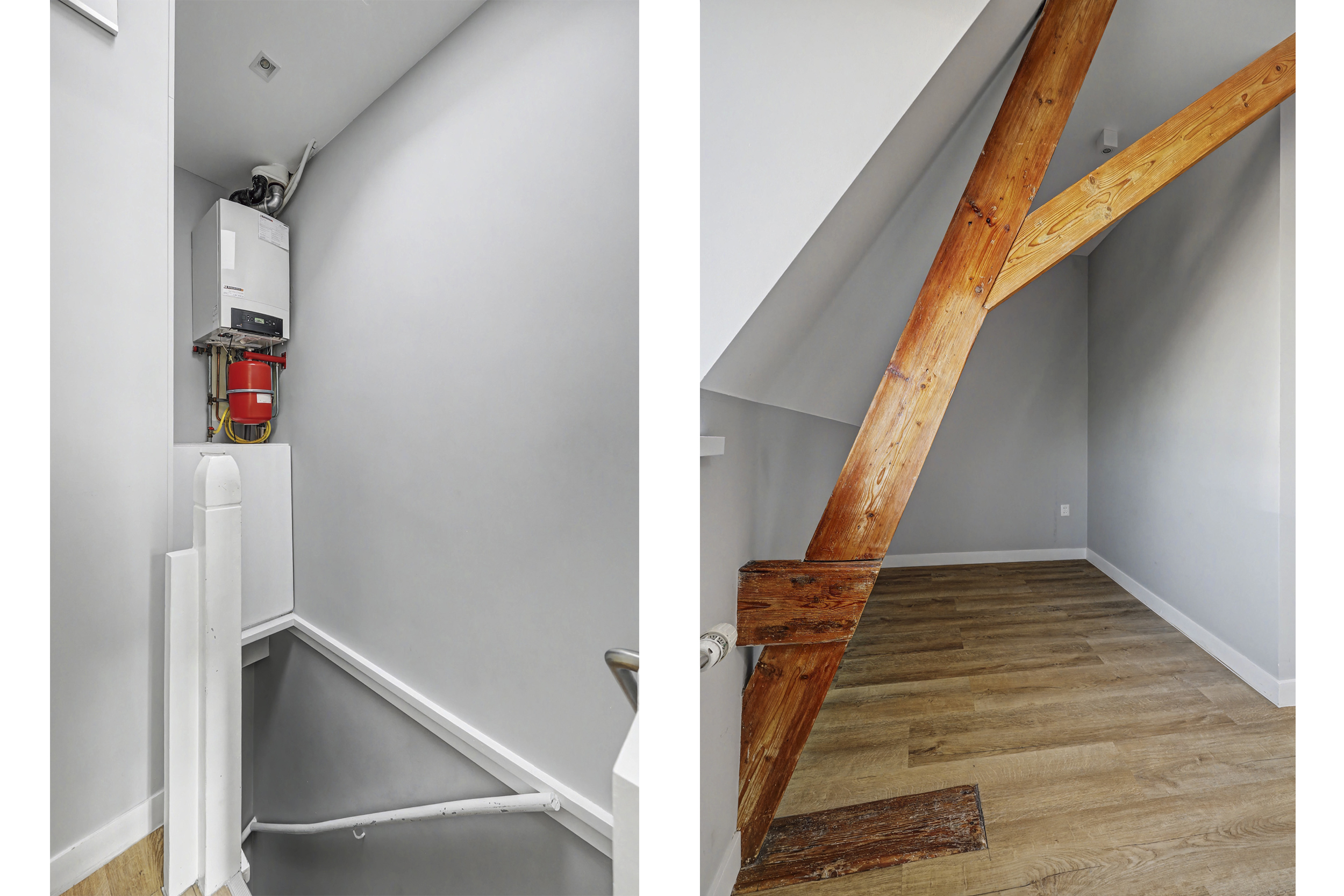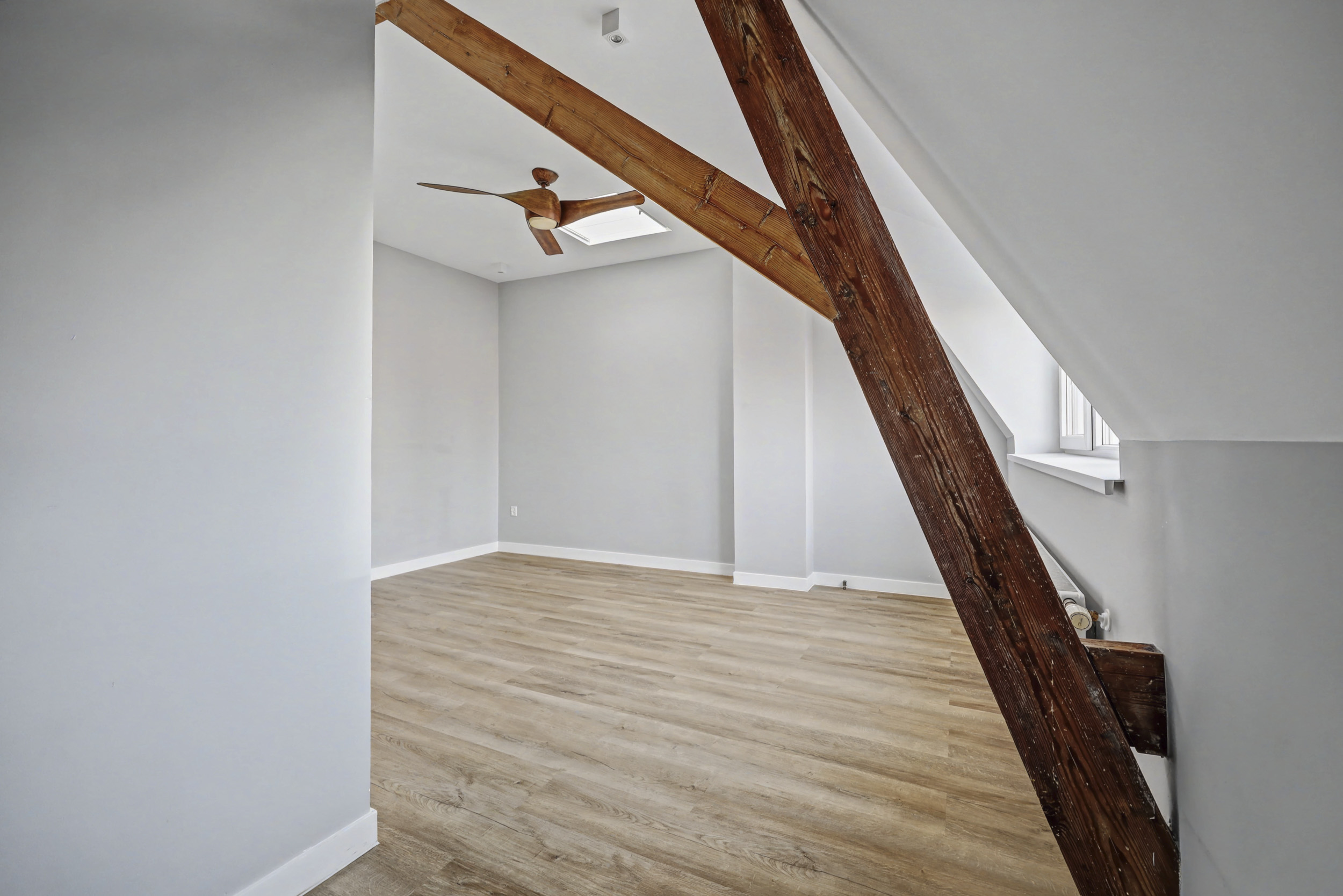 overloop met enige bergruimte, lichtkoepel en de cv-ketel, toegang tot de drie ruime slaapkamers. De L-vormige slaapkamer aan de voorzijde (ruim 20 m2) is voorzien van een muurkast, dakkoepel en een dakkapel. Tijdens de renovatie is het houten spant mooi in het zicht gebleven. Via de tweede slaapkamer (ca. 14 m2) bereik je de derde slaapkamer (ca. 11 m2), beiden aan de achterzijde. In deze derde slaapkamer bevindt zich de wasmachine-aansluiting.