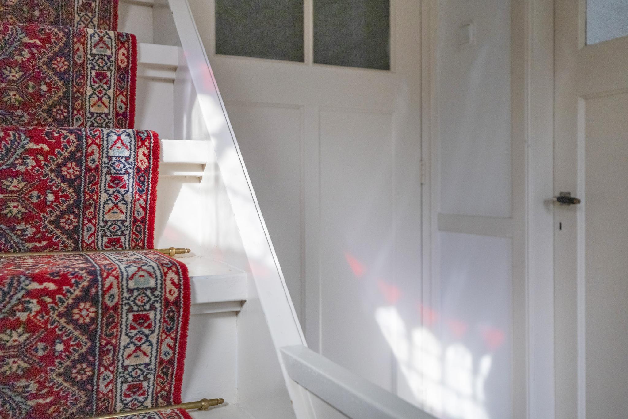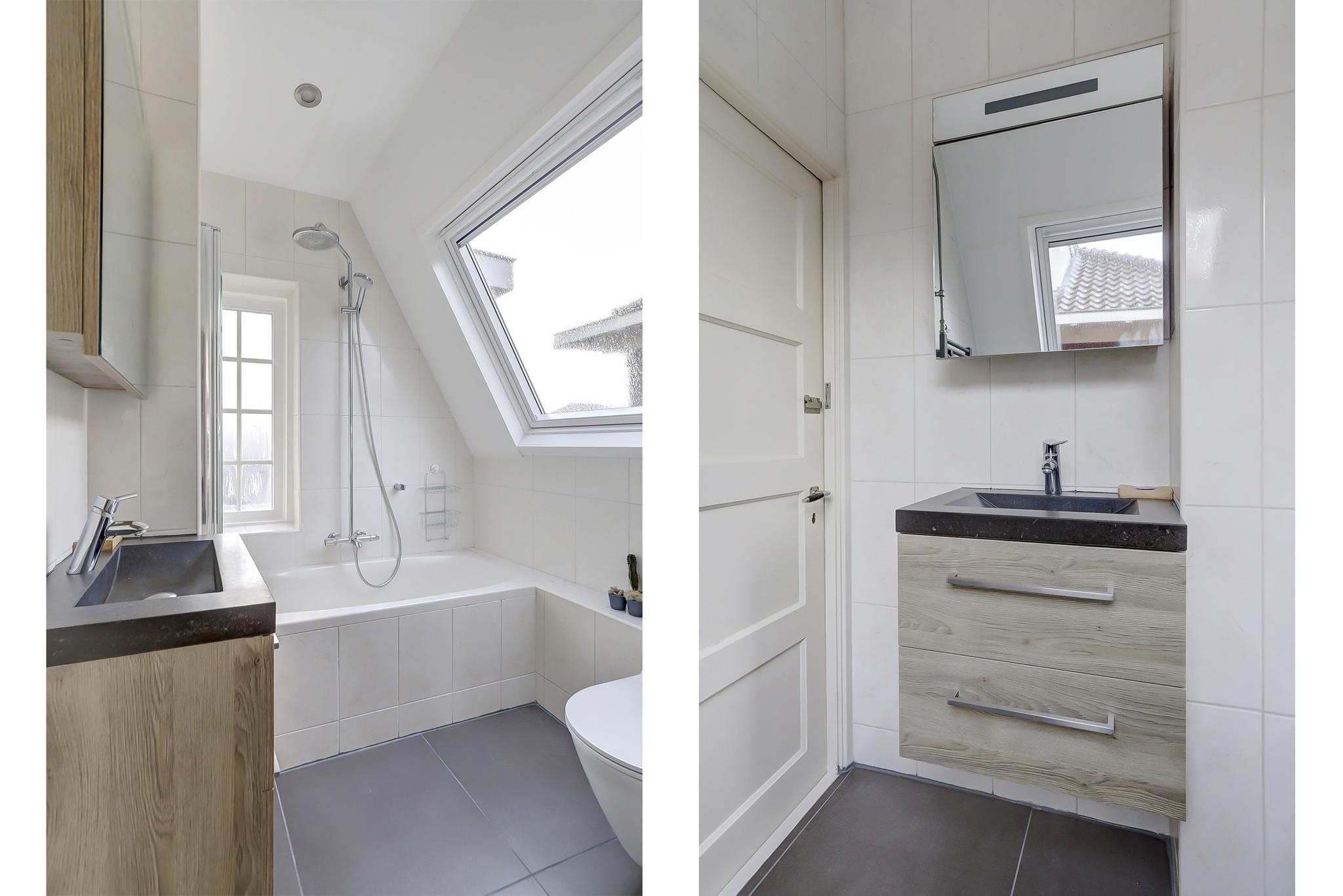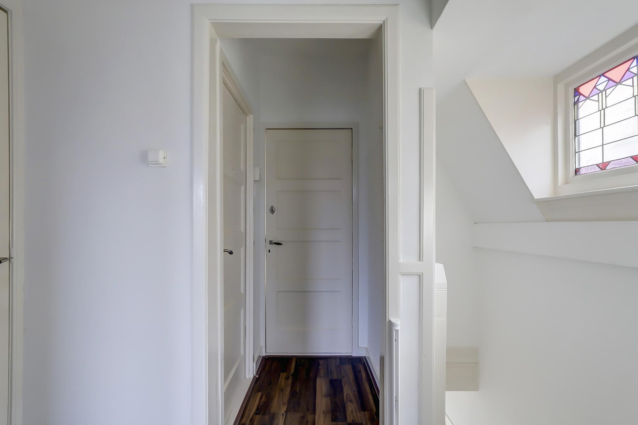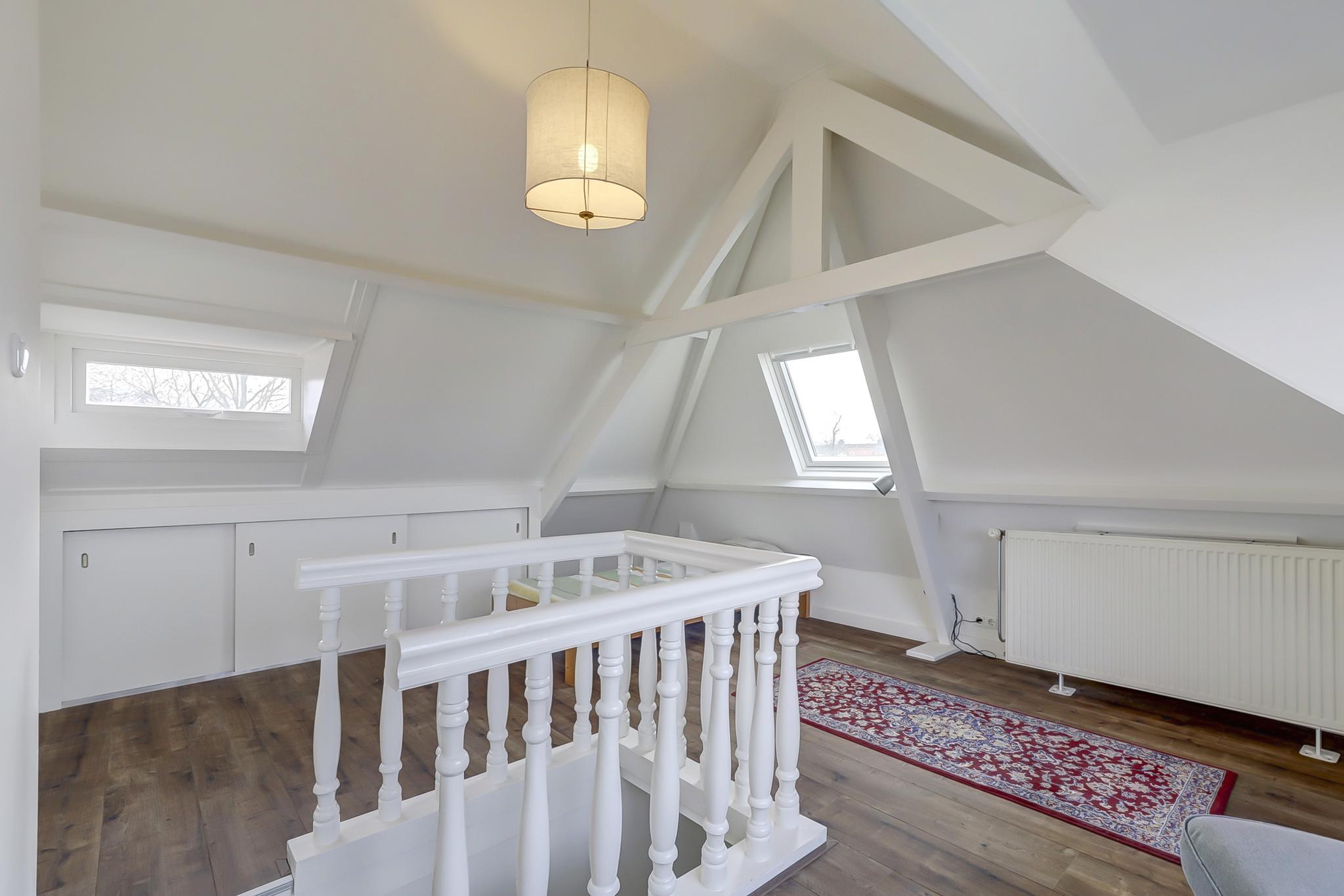 Eerste verdieping: overloop, in totaal zijn er drie slaapkamers, waarbij de kleinste slaapkamer nu in gebruik is als kledingkamer. Vanuit de grote slaapkamer aan de achterzijde kom je op een balkon uit. De moderne badkamer is voorzien van een ligbad/douche, wc en wastafelmeubel.